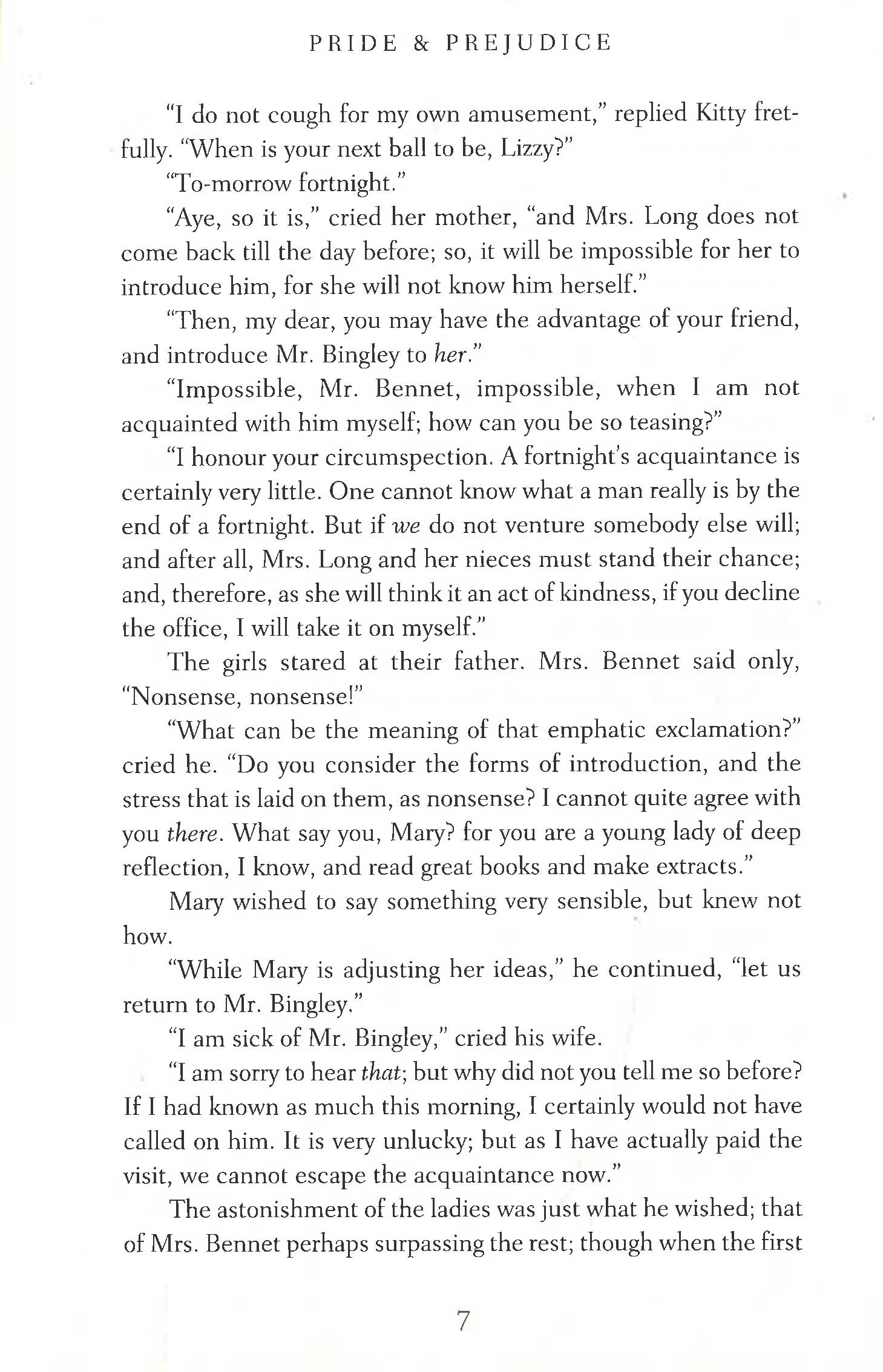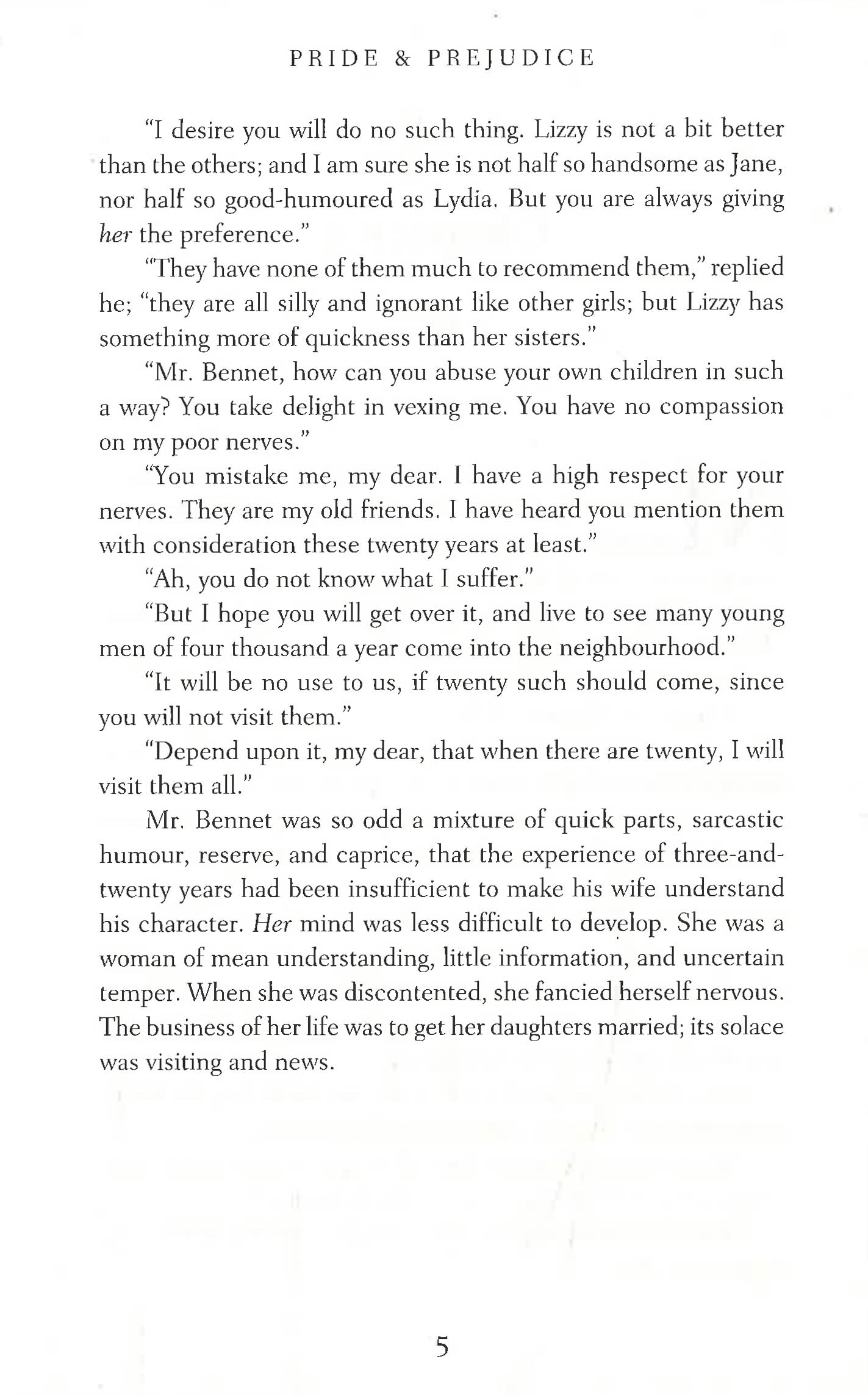 "Pride and Prejudice," by Jane Austen, is a beloved classic that delves into the lives, loves, and social dynamics of the Bennet family in Regency England. The novel follows the witty and independent Elizabeth Bennet as she navigates issues of class, marriage, and morality, particularly in her complex relationship with the enigmatic Mr. Darcy. Austen's sharp social commentary and enduring themes of love and personal growth make this timeless tale a cornerstone of English literature.