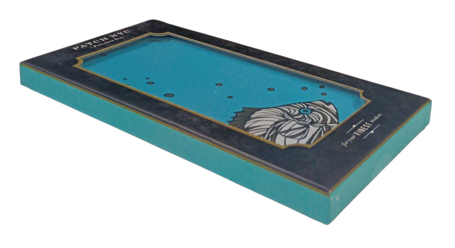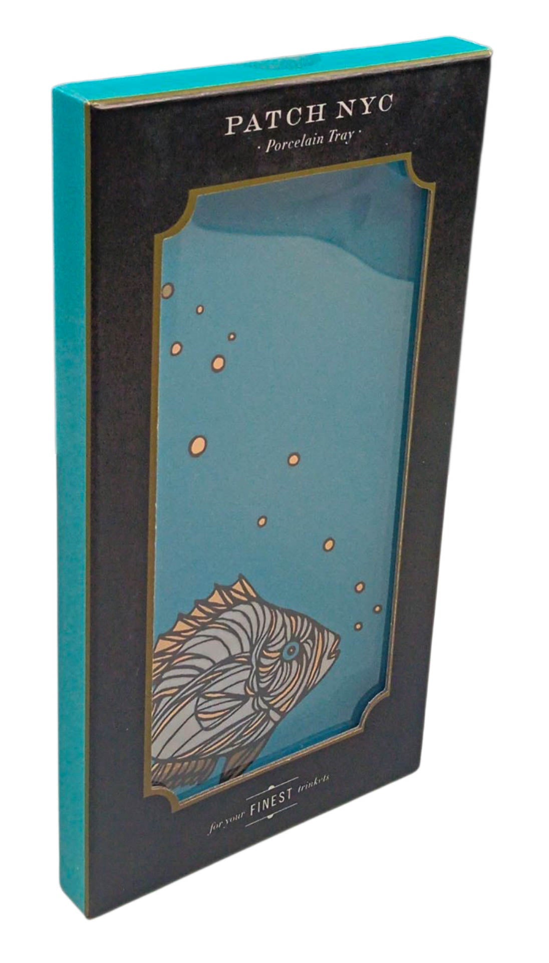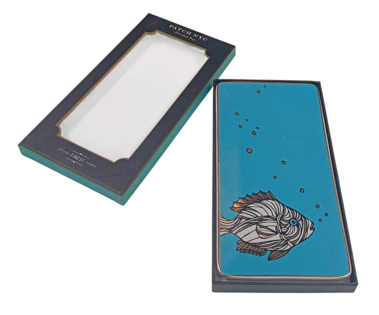 The Patch NYC Fish Tray from Galison is no exception, beautifully colored with sea blue background and fish illustration enhanced with gold foil. This tray is packaged in a sturdy die-cut window box so it makes a great gift and is sure to become the perfect destination for keys, jewelry, and other trinkets or desktop items.