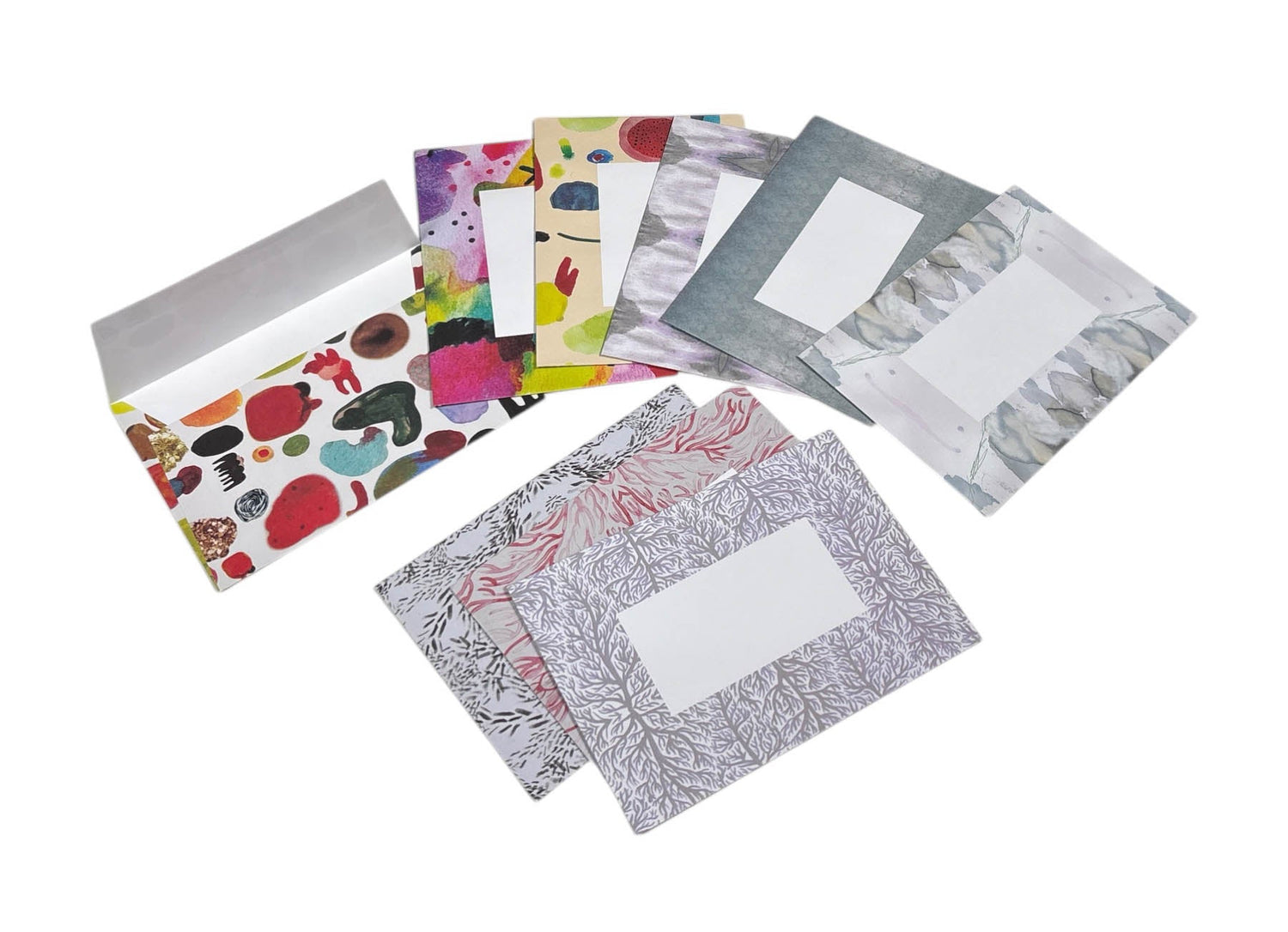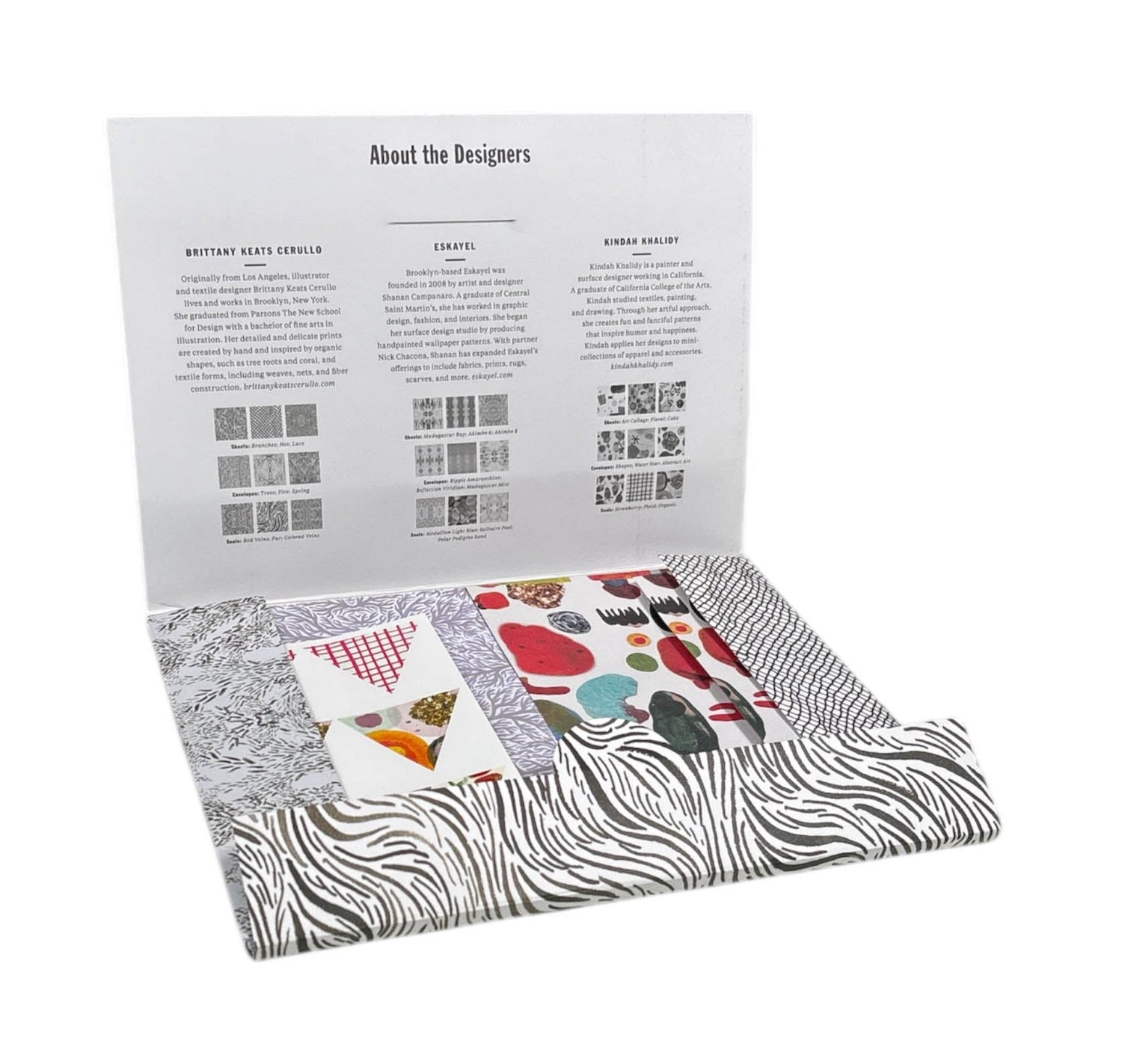 A follow-up to our successful Pattern Box, this playful mix-and-match stationery set features eighteen pattern-filled writing sheets, envelopes, and seals from three celebrated designers. The designs showcase the diverse works of Eskayel, Kindah Khalidy, and Brittany Keats Cerullo— from ethereal watercolors to poppy collages to delicate, detailed line drawings. Pattern Papers is curated by New York City's celebrated Textile Arts Center.