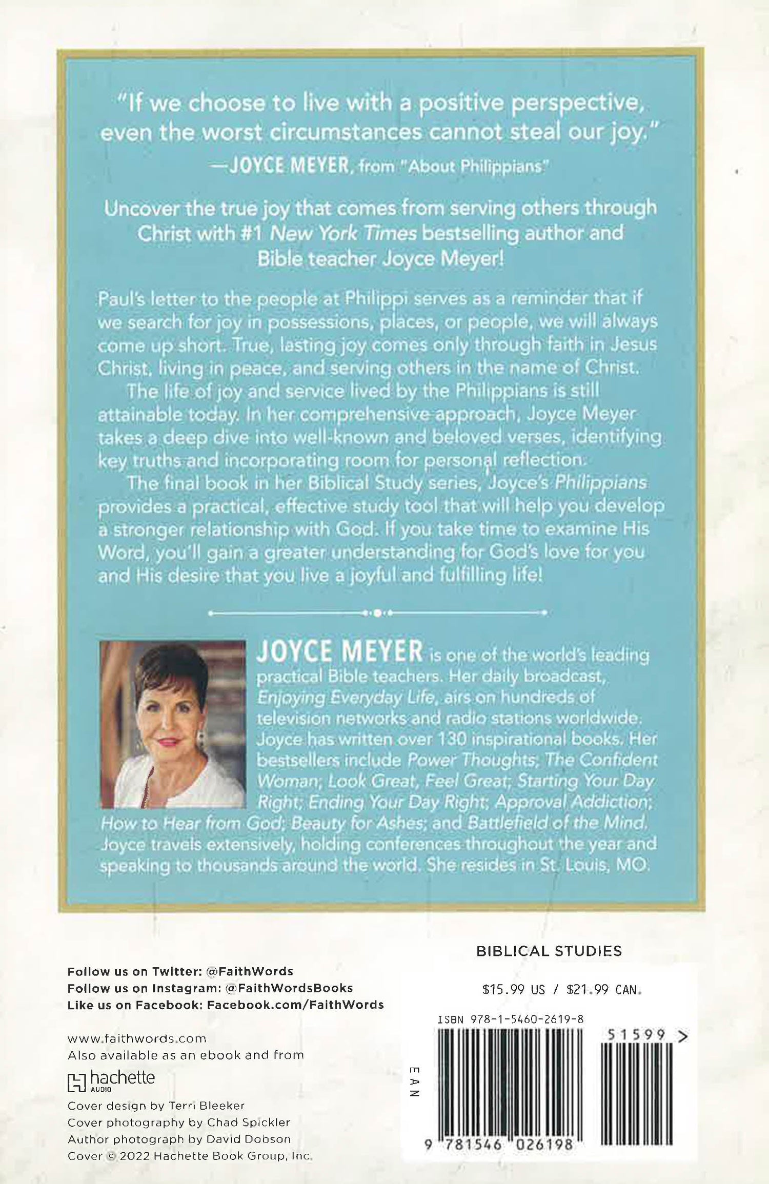 Paul's letter to the people at Philippi serves as a reminder that if we search for joy in possessions, places, or people, we will always come up short. True, lasting joy comes only through faith in Jesus Christ, living in harmony with His followers, and serving others in the name of Christ. The life lived by the Philippians is still attainable today. In her comprehensive approach, Joyce Meyer takes a deep dive into well-known and beloved verses, identifying key truths and incorporating room for personal reflection.