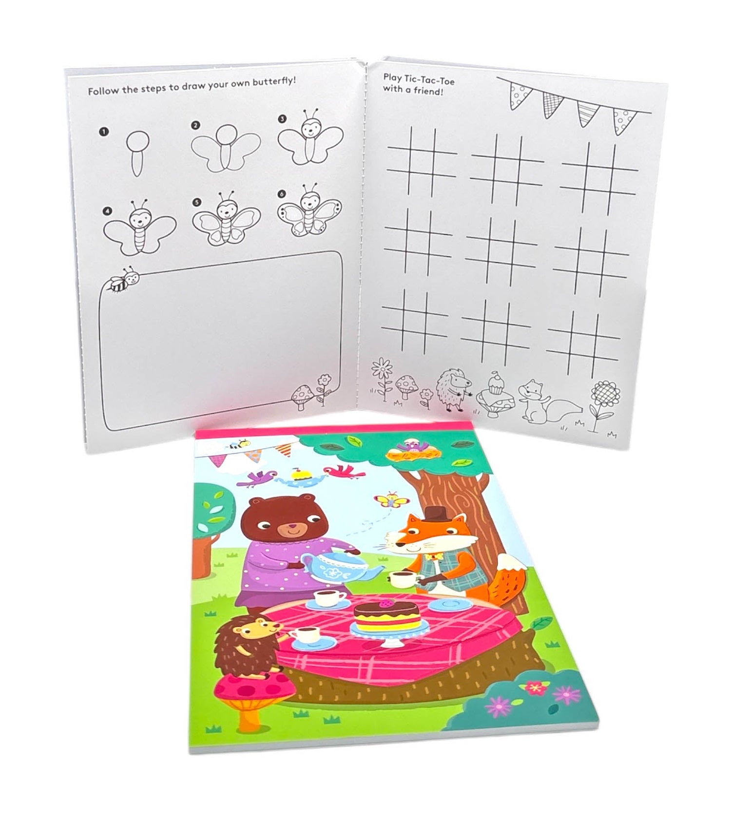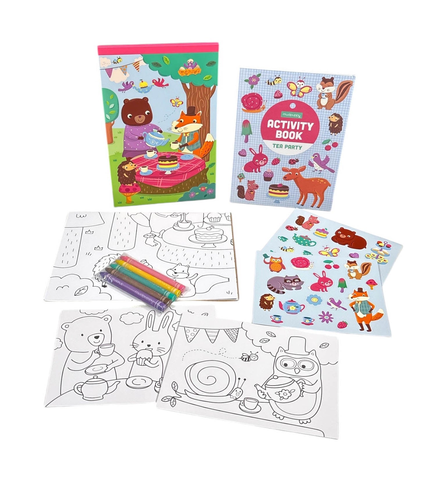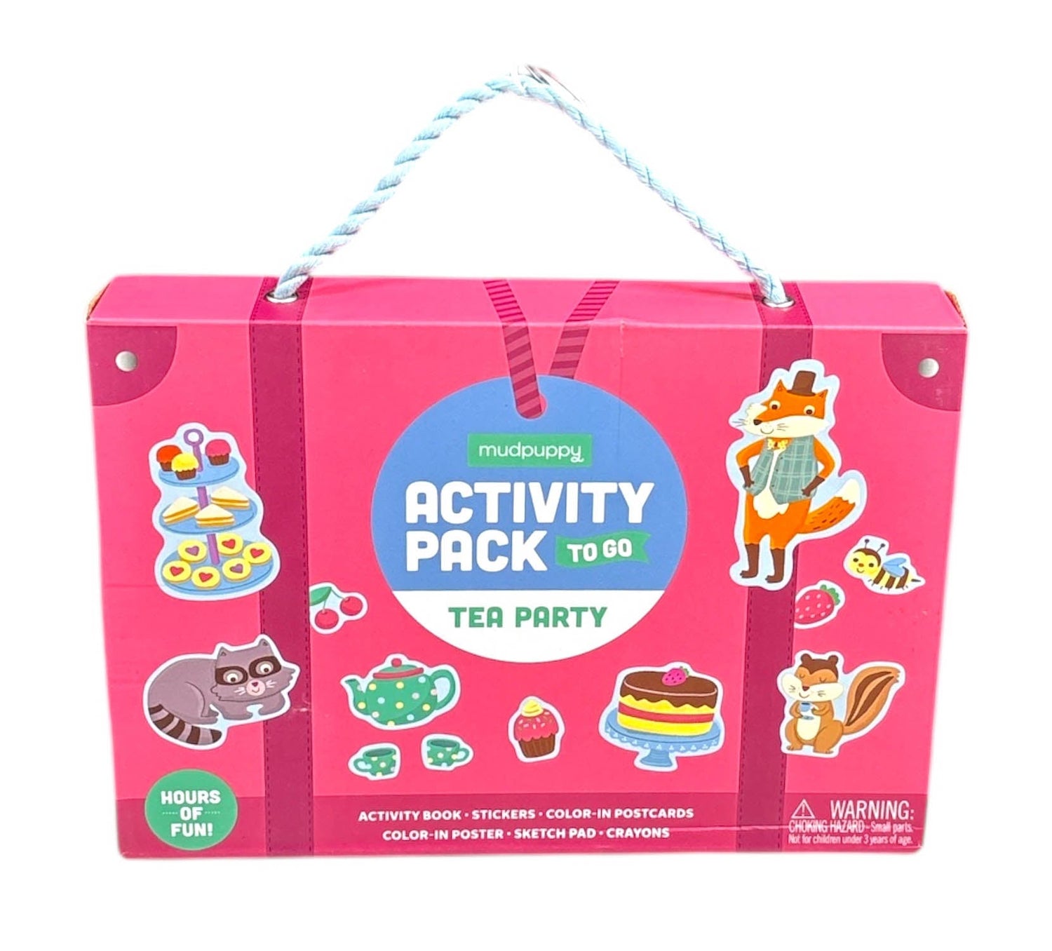 Packaged in an adorable mini-suitcase package with handle to carry, this portable package of tea party activities, is perfect for travel, birthday parties, or individual fun at home. Mudpuppy's Activity Packs To Go contain 3 color-in postcards, over 20 stickers, sketch pad, activity book, color-in poster, and 5 crayons!.