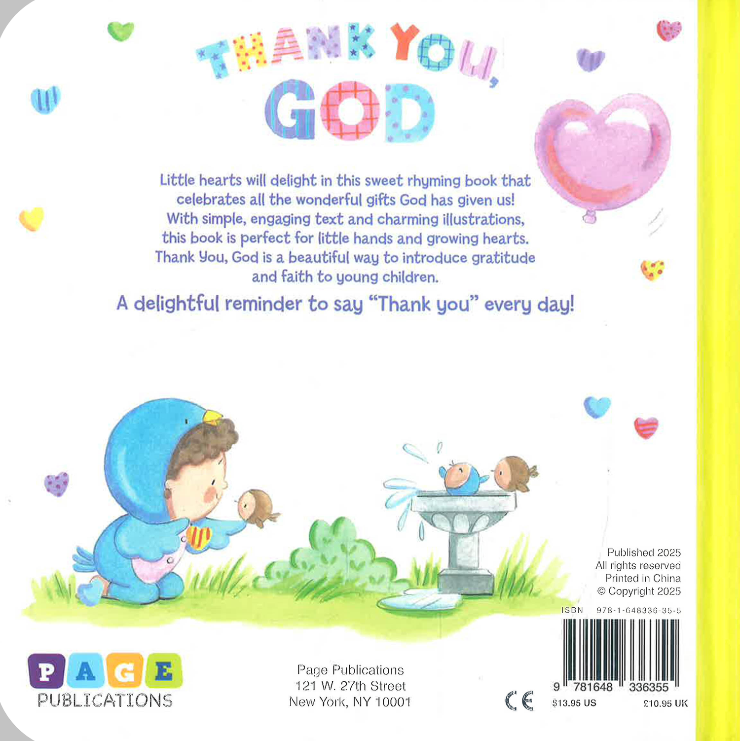 Celebrate life’s little blessings with Thank You God, a heartwarming padded board book designed to introduce toddlers and young children to the joy of gratitude. Through simple, comforting prayers and cheerful illustrations, children learn to say "thank you" for family, friends, nature, and everyday moments that make life special. With gentle rhymes and vibrant artwork, this sturdy book invites little ones to recognize God's love in their world. Perfect for bedtime, storytime, or quiet moments together, this sweet book helps nurture a lifelong habit of thankfulness and faith.