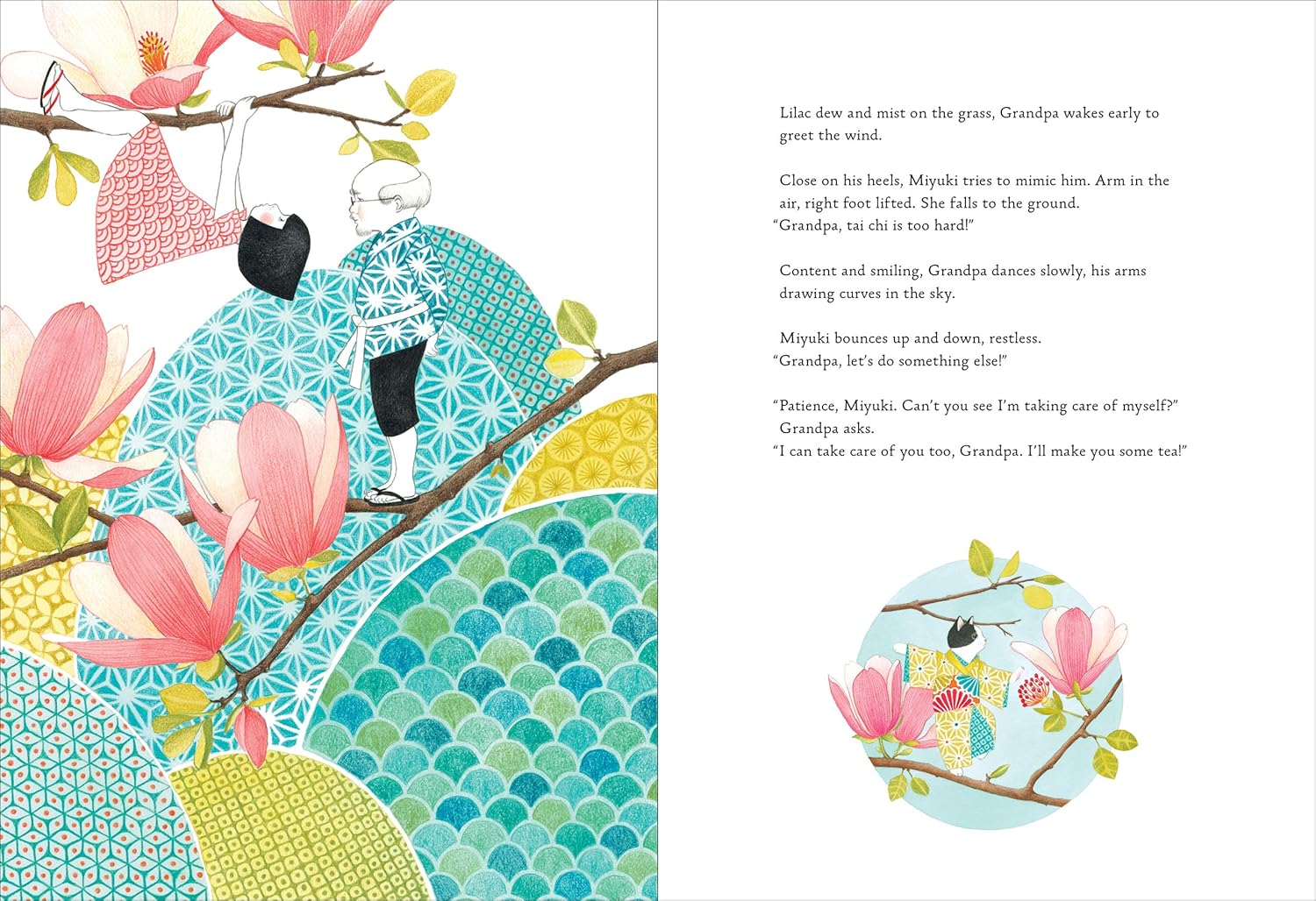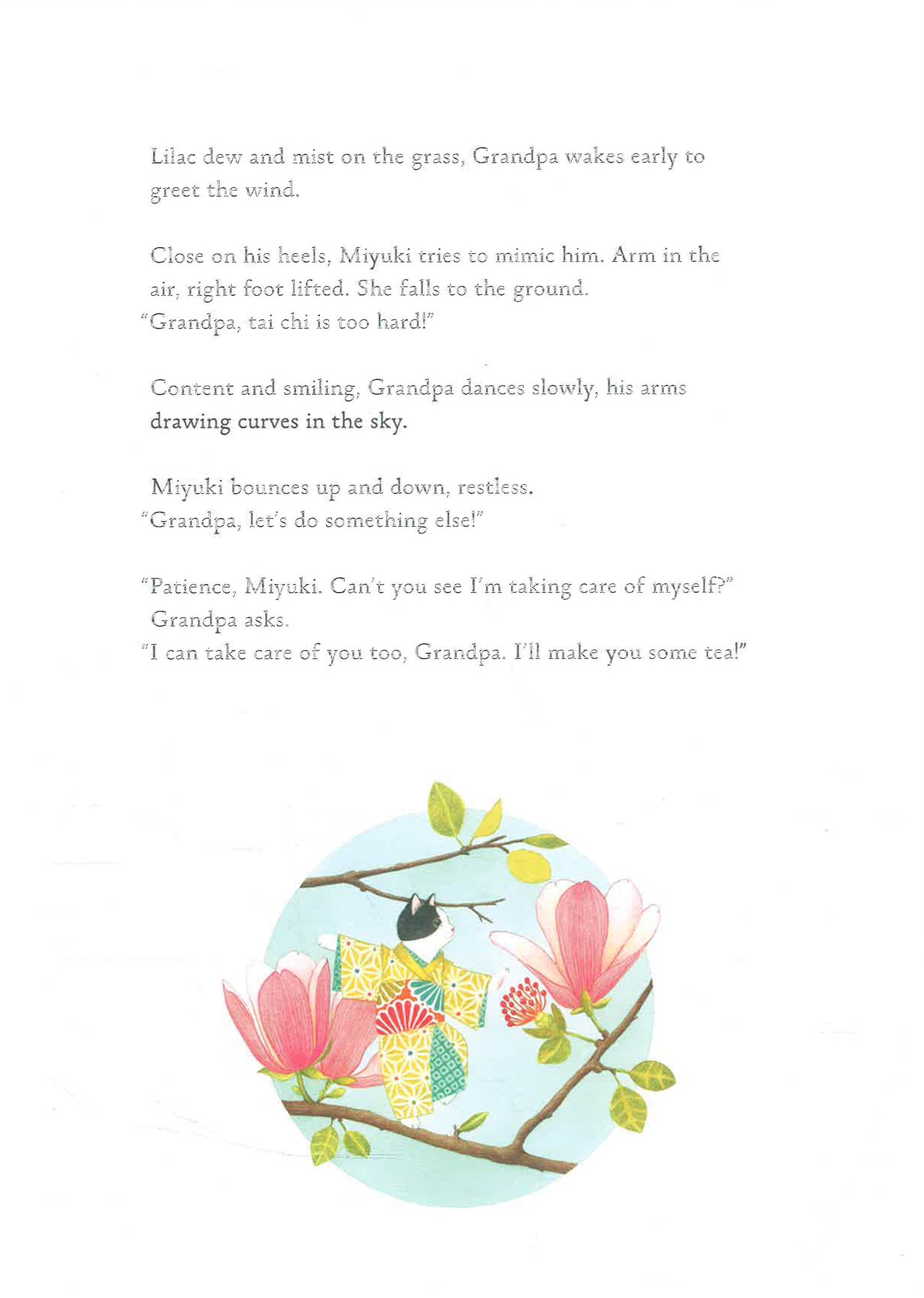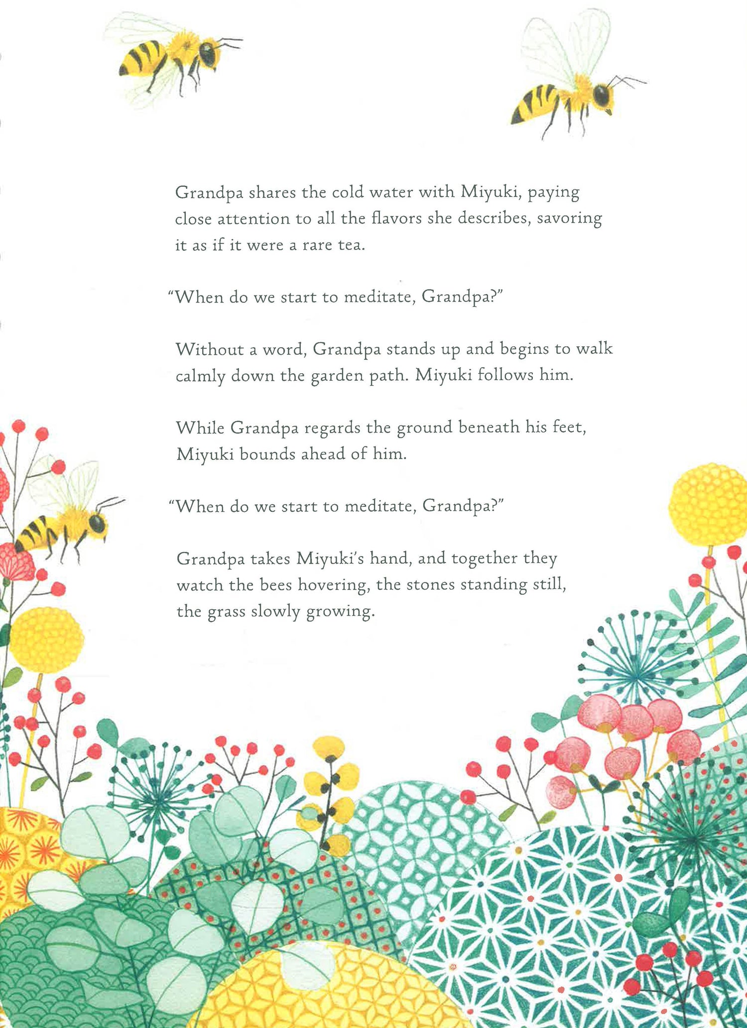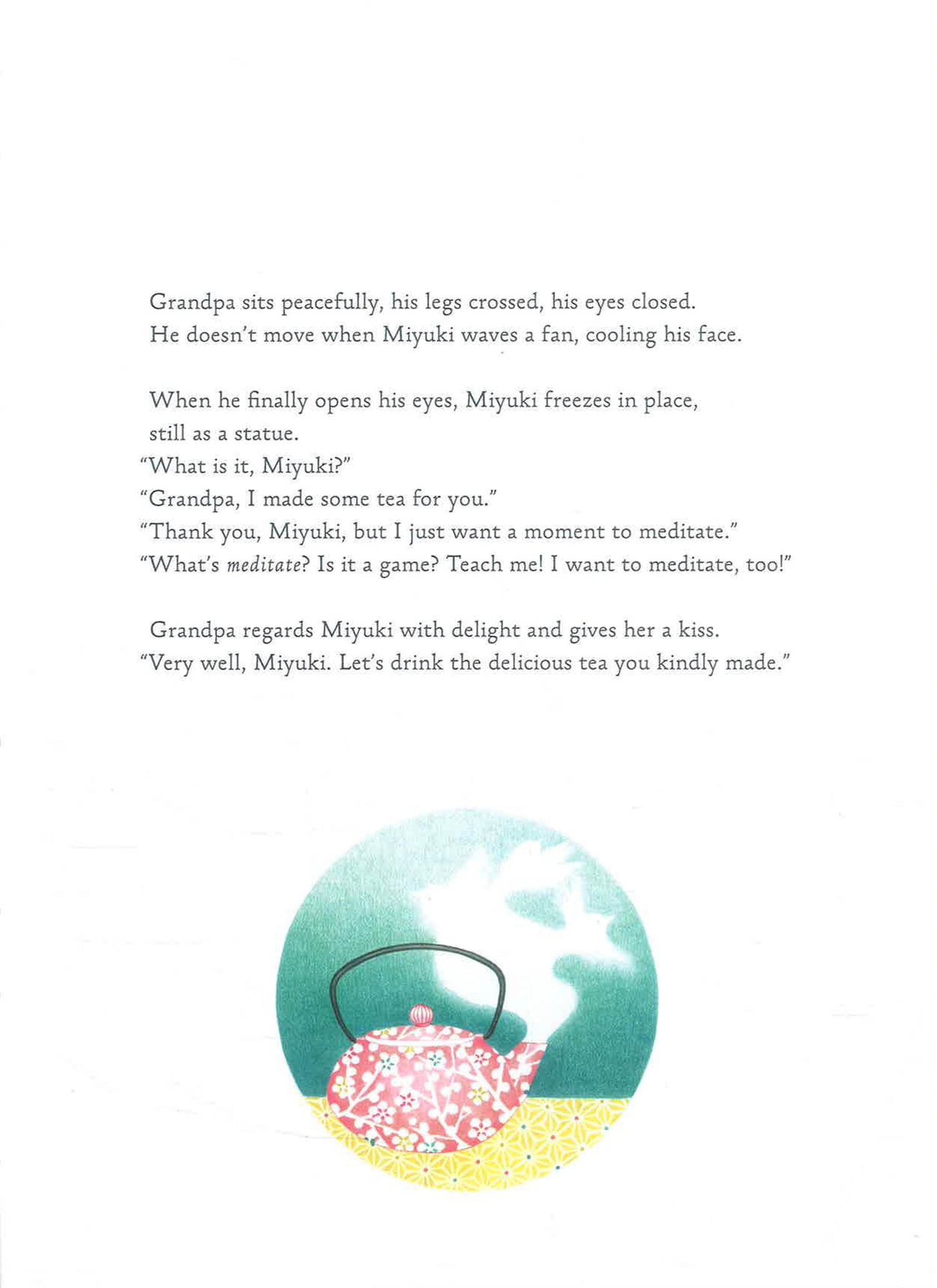 Miyuki can’t wait to begin her day of play, but her grandfather is engaged in tai chi and meditation. Miyuki's curiosity is piqued, and soon Miyuki is excited to learn to meditate too! "When do we start?" she asks repeatedly. Grandfather enjoys the warm sun and stops to smell a rose, inviting Miyuki to join him.