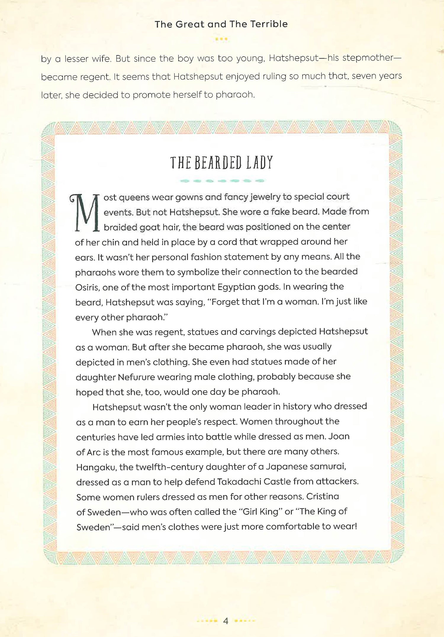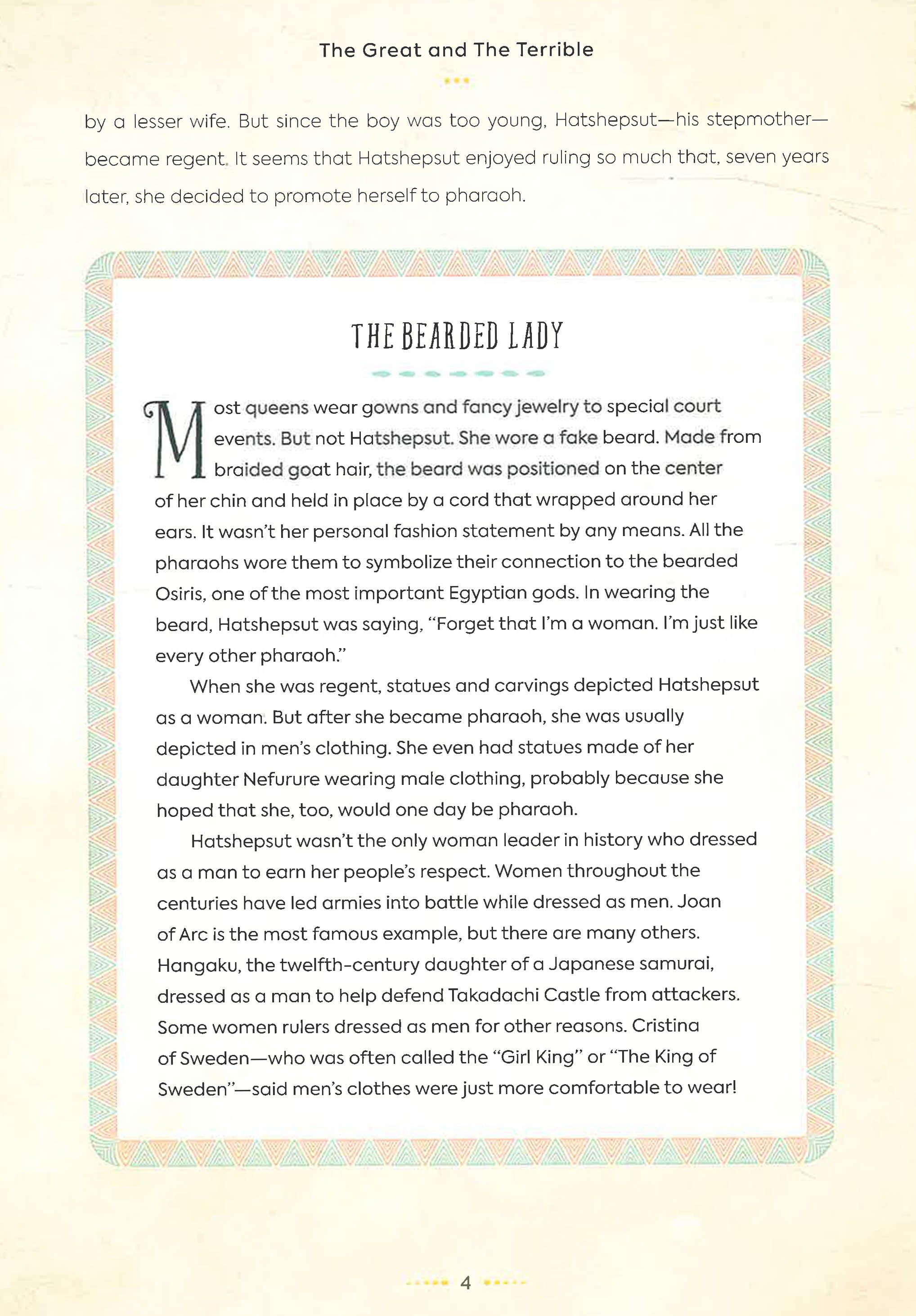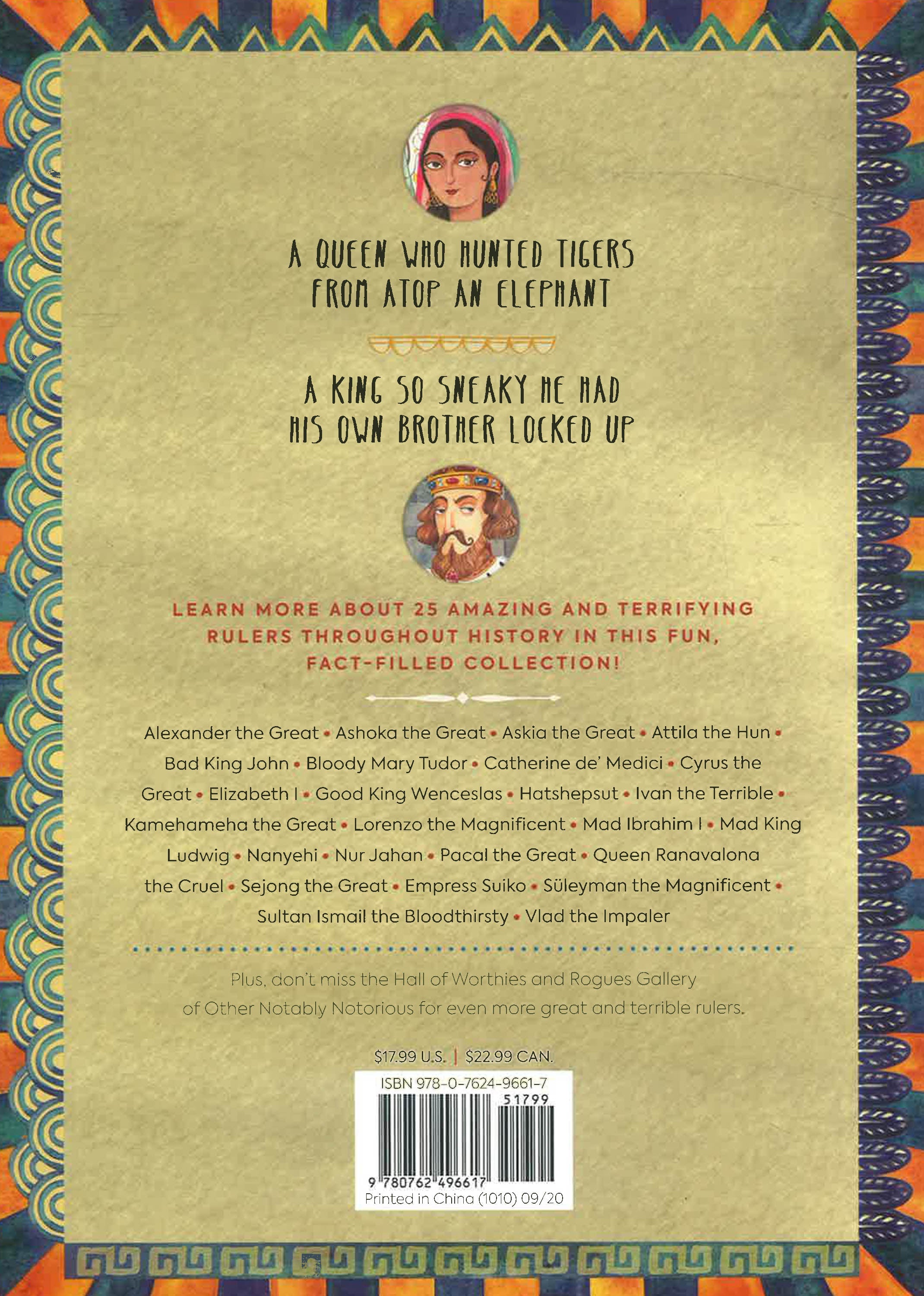 While some of the characters mentioned here are more prominent in world history (Cyrus the Great introduced the world's first human rights charter), others are well known only within their own cultures. The Great and the Terrible gives middle-grade readers an opportunity to dip into the breadth of world history, sampling its cultural diversity and its stranger-than-fiction historical exploits, with a mix of the sensational and the serious. It helps to correct the imbalance in many history books that currently only focus on Western Civilization, shining the spotlight on achievements (and foibles) in many different cultures.
