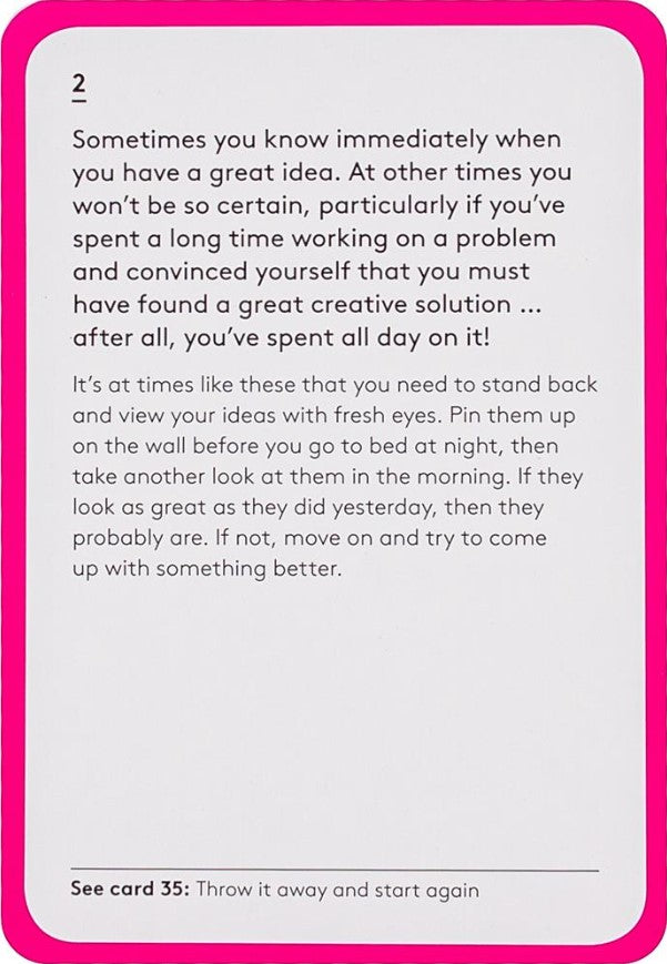 This new series of self-help cards begins with advice on how to improve your idea generation. Need some practical starting points to get your brain working? Take a break, break the rules, throw it away and start again. The cards offer 50 pieces of bite-sized but practical advice by an expert in the field.