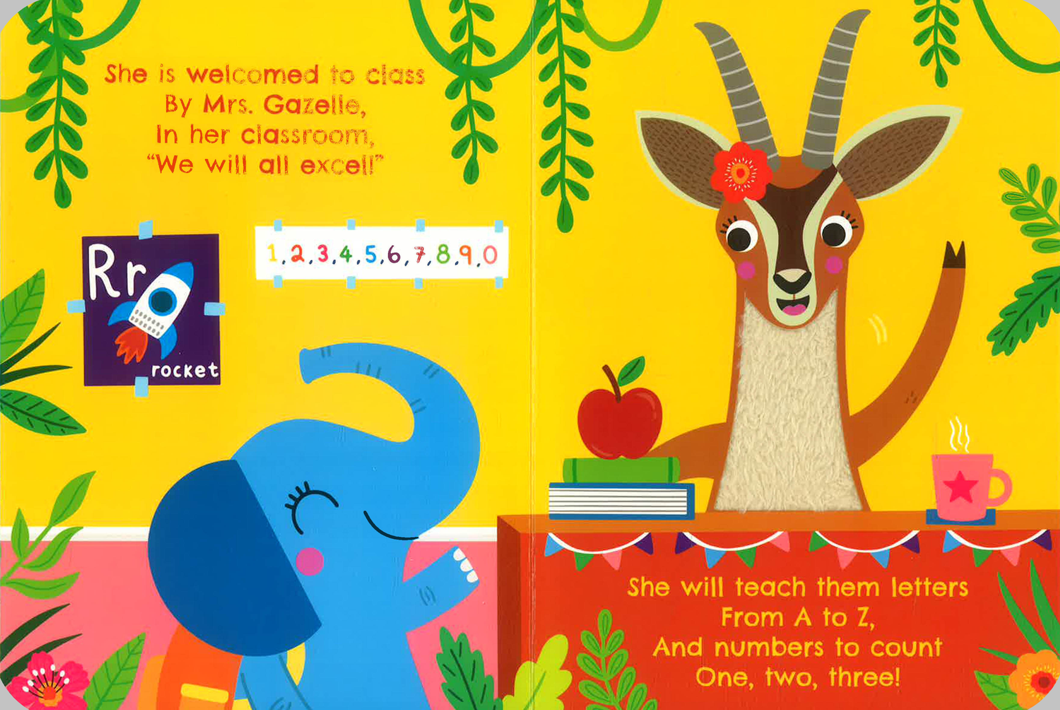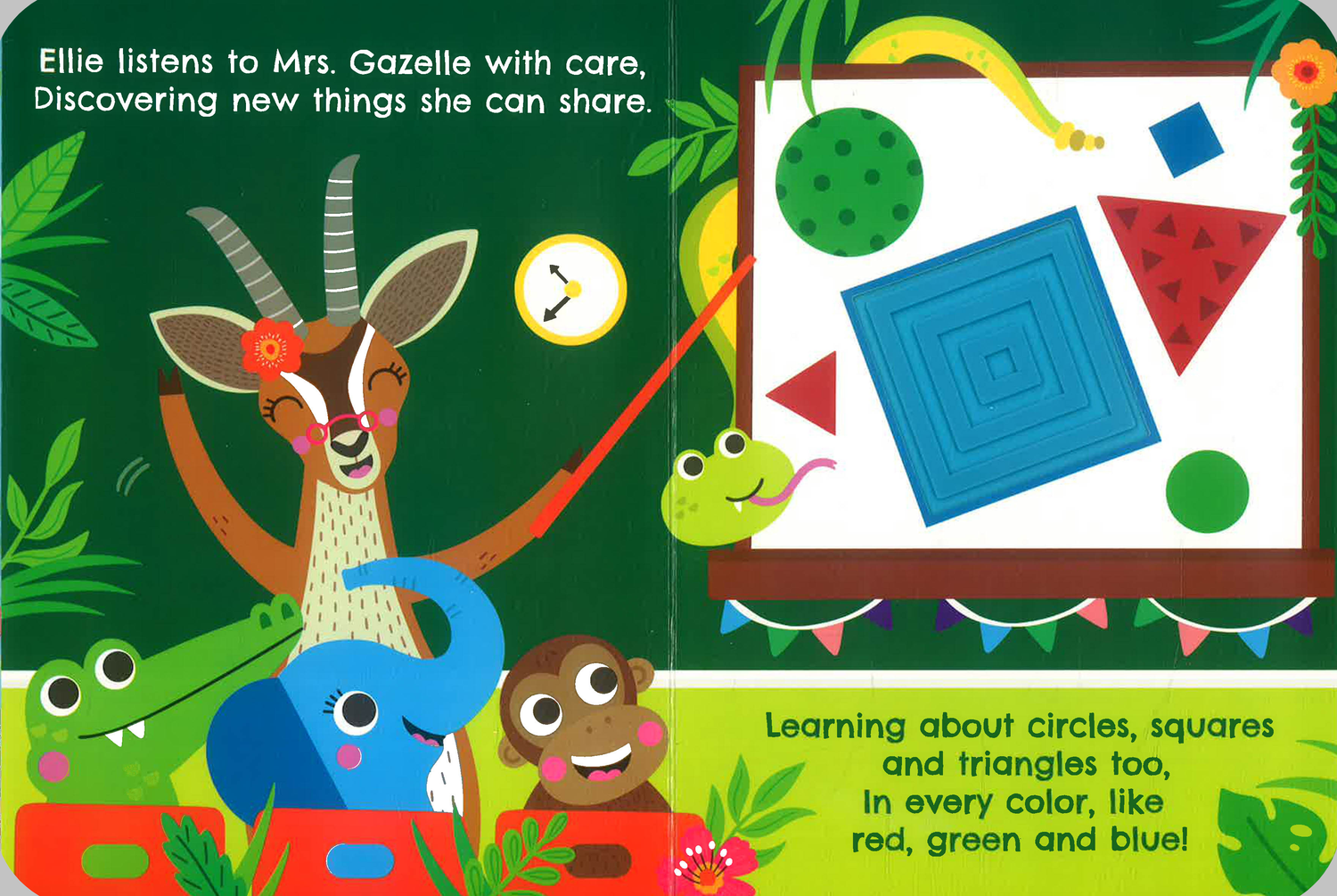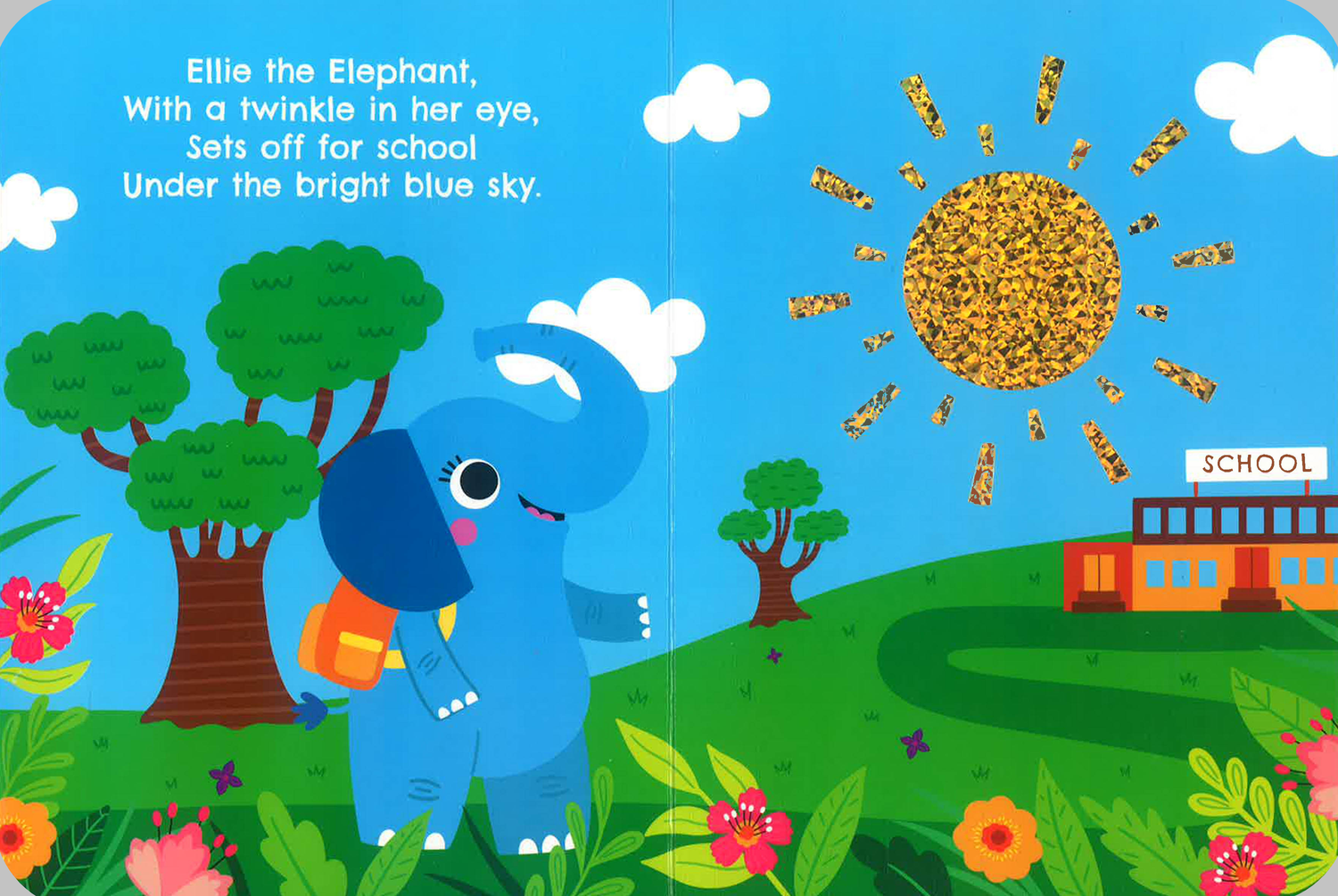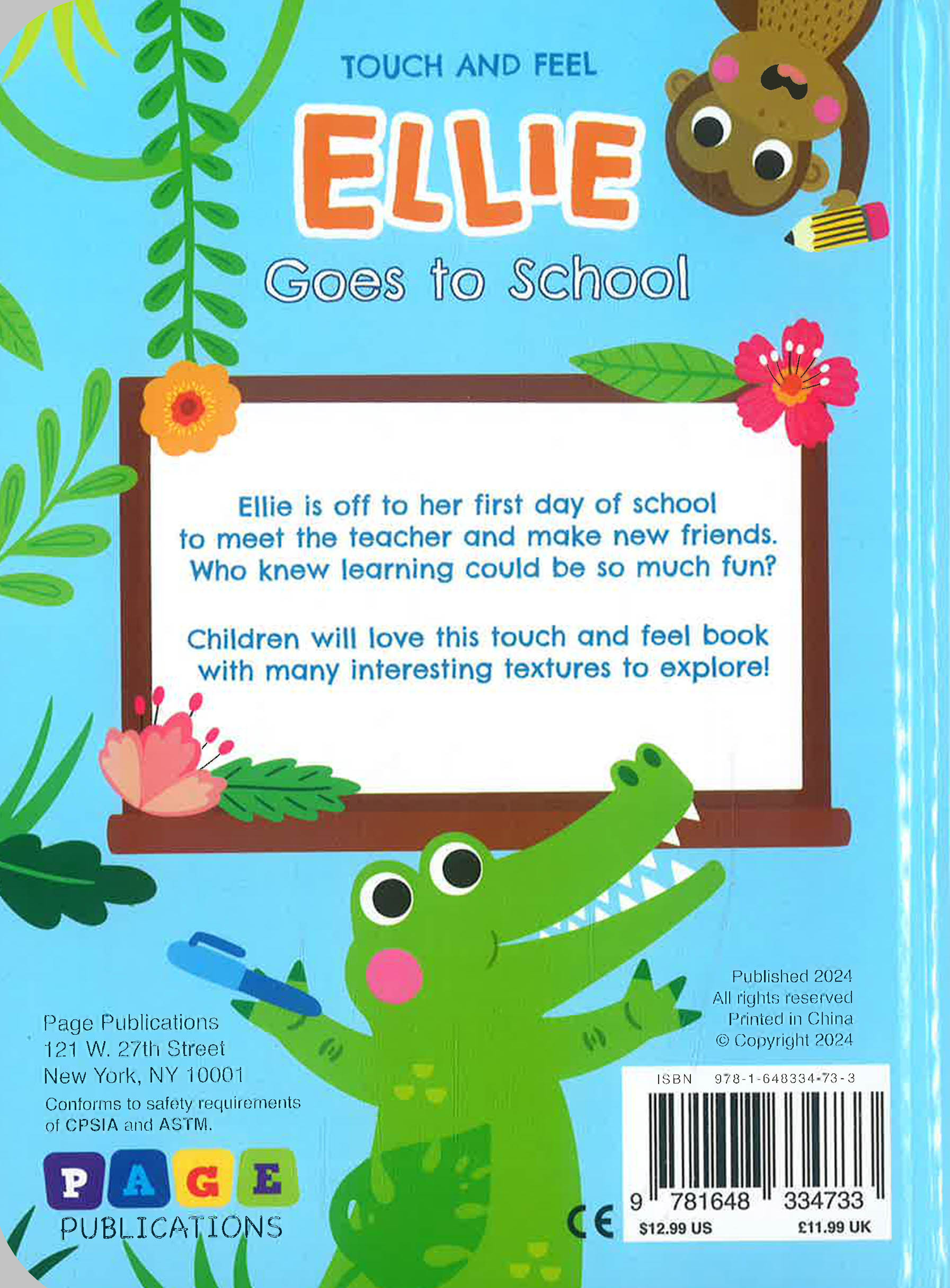 "Touch and Feel Ellie Goes to School" is an engaging board book that follows Ellie, a cheerful little elephant, as she experiences her first day at school. Each page features delightful touch-and-feel textures, from Ellie's soft backpack to the bumpy chalkboard, offering a hands-on way for children to explore school life. With vibrant illustrations and relatable moments, this sturdy book helps prepare toddlers for their own school adventures, fostering sensory learning and emotional readiness. Perfect for ages 0–3.
