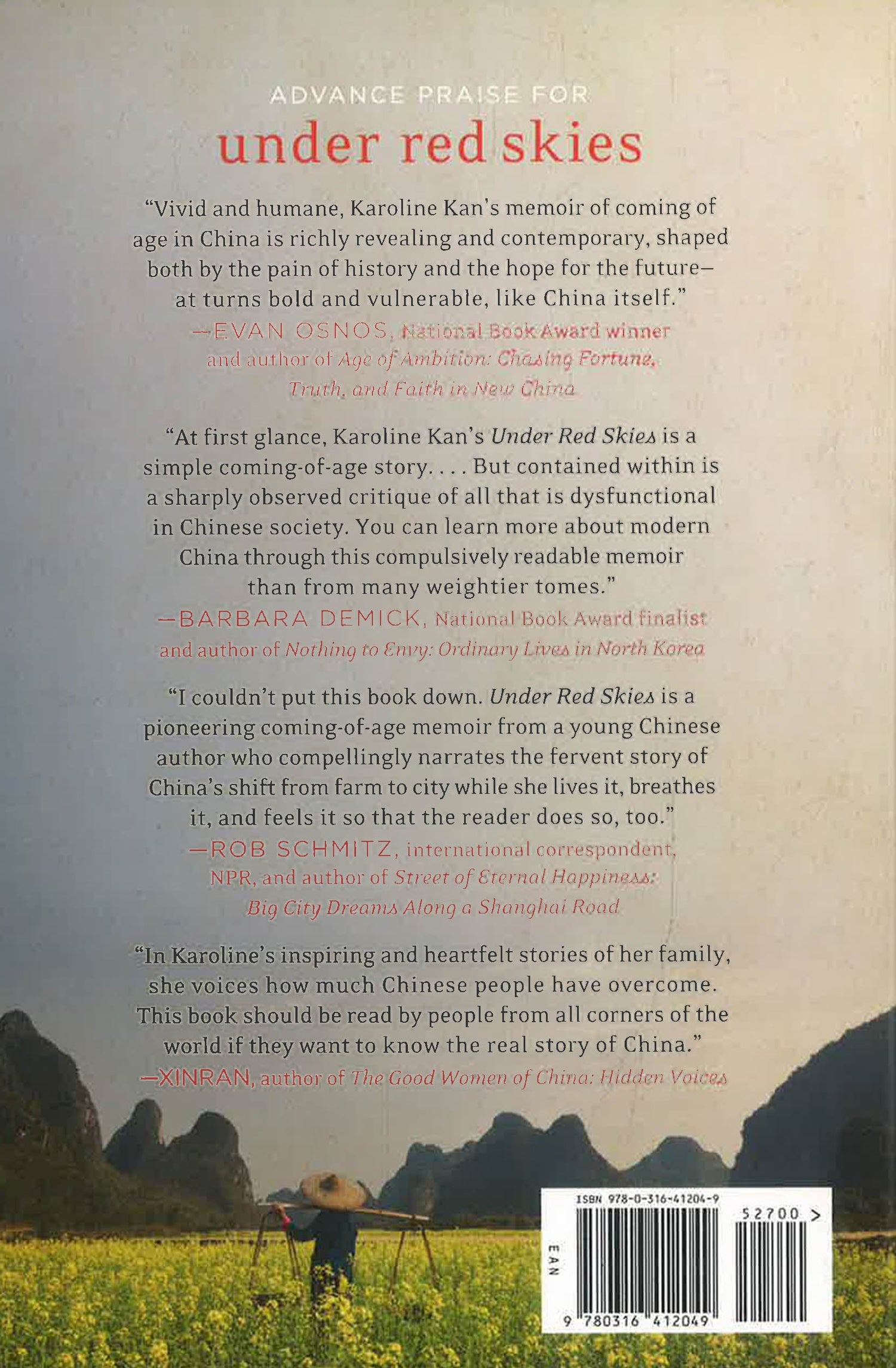 Under Red Skies is an engaging eyewitness account and Karoline's quest to understand the rapidly evolving, shifting sands of China. It is the first English-language memoir from a Chinese millennial to be published in America, and a fascinating portrait of an otherwise-hidden world, written from the perspective of those who live there.