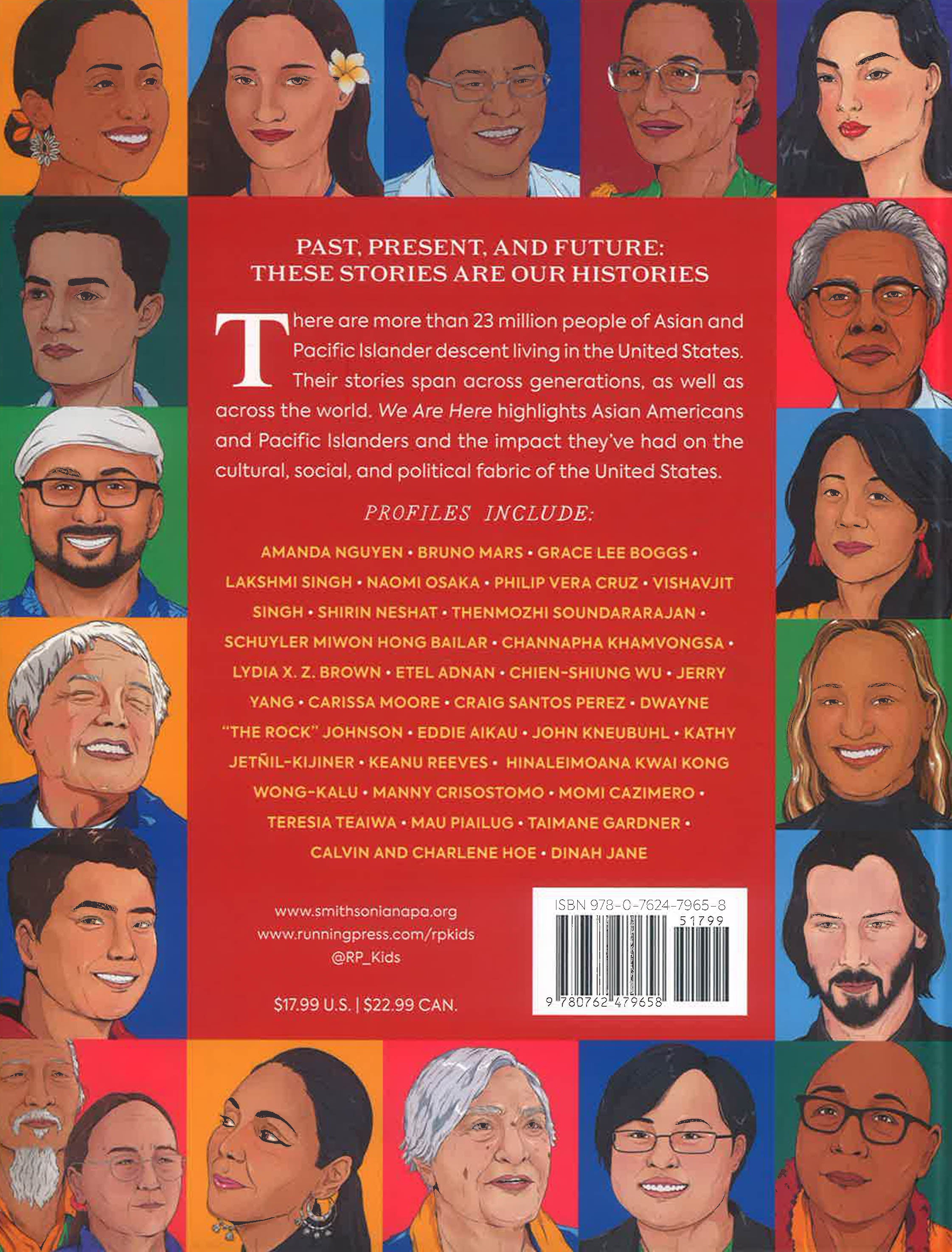 A stunning anthology licensed in partnership with the Smithsonian Asian Pacific American Center, We Are Here celebrates 30 of the most inspiring Asian Americans and Pacific Islanders in U.S. history. There are more than 23 million people of Asian and Pacific Islander descent living in the United States. Their stories span across generations, as well as across the world. We Are Here highlights thirty Asian Americans and Pacific Islanders and the impact they’ve had on the cultural, social, and political fabric of the United States.Profiles include: Amanda Nguyen * Bruno Mars * Grace Lee Boggs * Lakshmi Singh * Naomi Osaka * Philip Vera Cruz * Vishavjit Singh * Shirin Neshat * Thenmozhi Soundararajan * Schuyler Miwon Hong Bailar * Channapha Khamvongsa * Lydia XZ Brown * Etel Adnan * Cien-Shiung Wu * Jerry Yang * Carissa Moore * Craig Santos Perez * Dwayne “The Rock” Johnson * Eddie Aikau * John Kneubuhl * Kathy Jernil-Kijiner * Keanu Reeves * Kumu Hina * Manny Crisotomo * Momi Cazimero * Teresa Teaiwa * Mau Piailug * Taimane Gardner * Calvin and Charlene Hoe * Dinah Jane