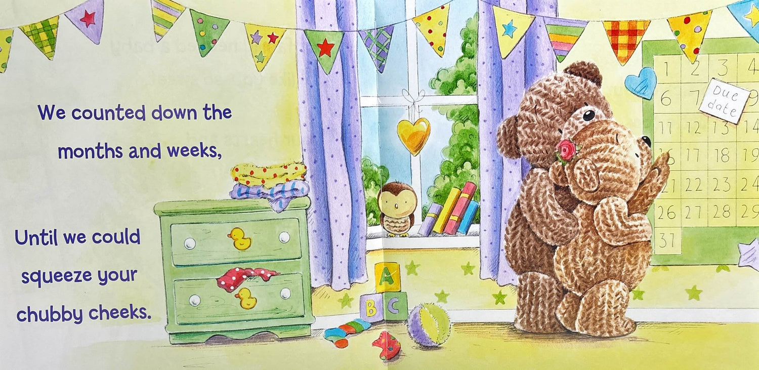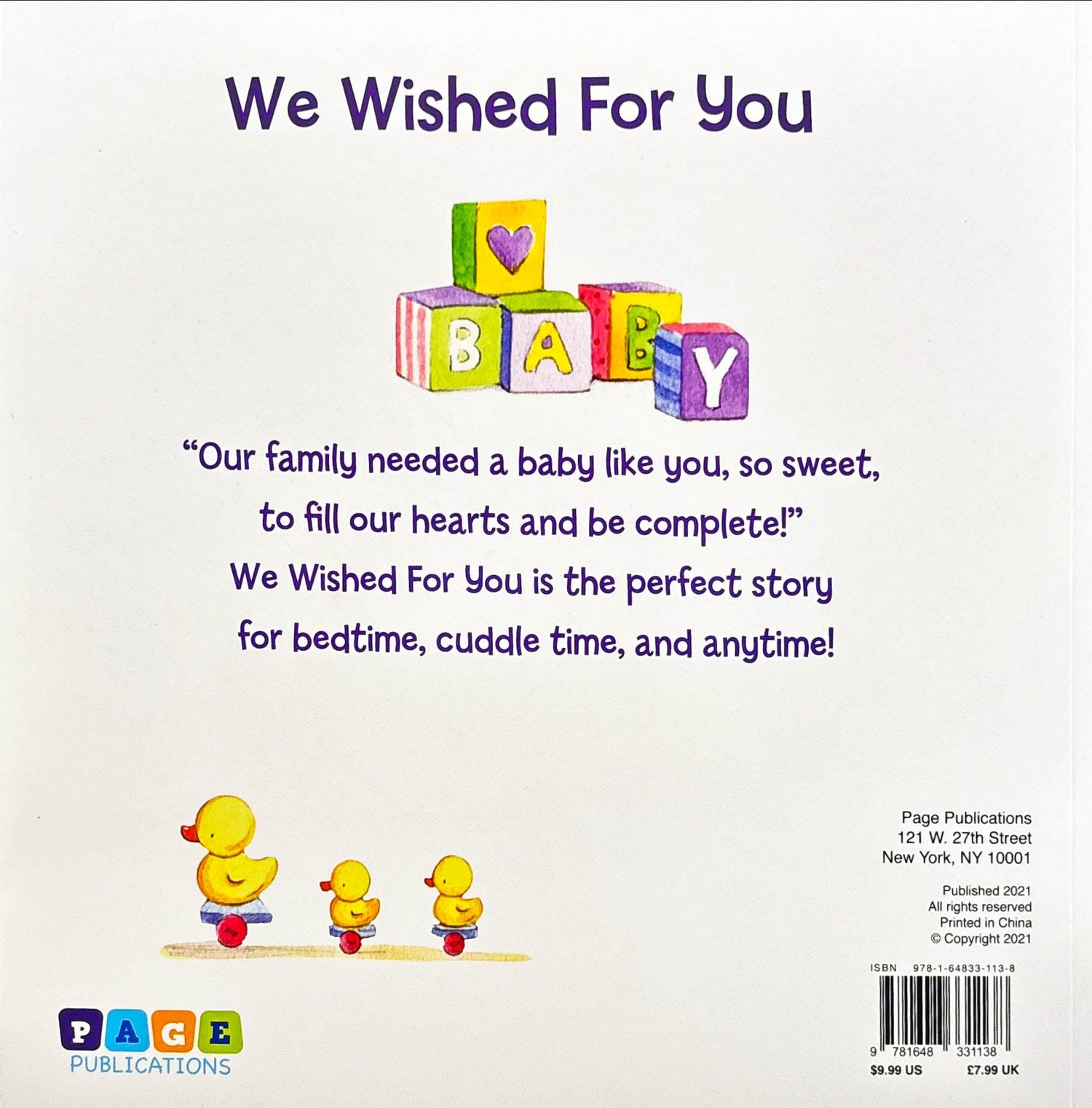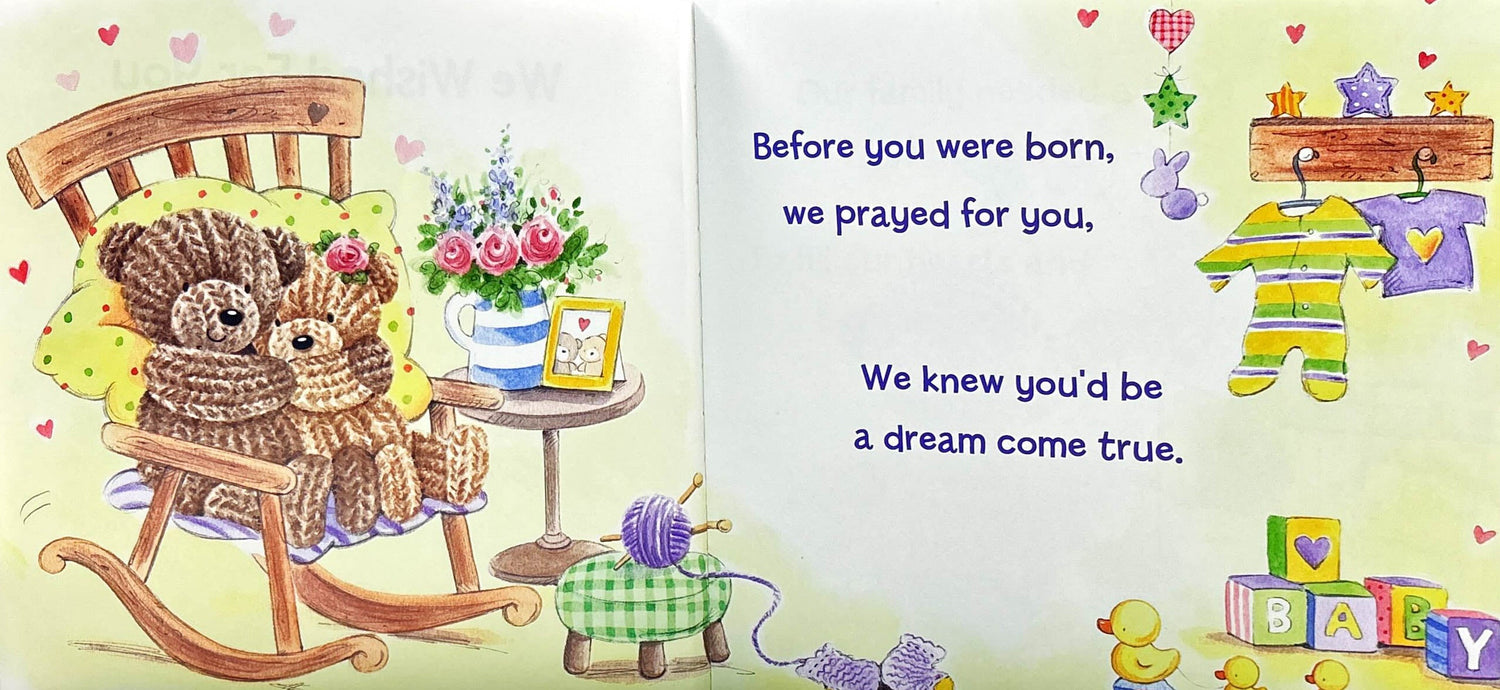 "Our family needed a baby like you, so sweet, to fill our hearts and be complete!" We wished for you is the perfect story for bedtime, cuddle time, and any time!