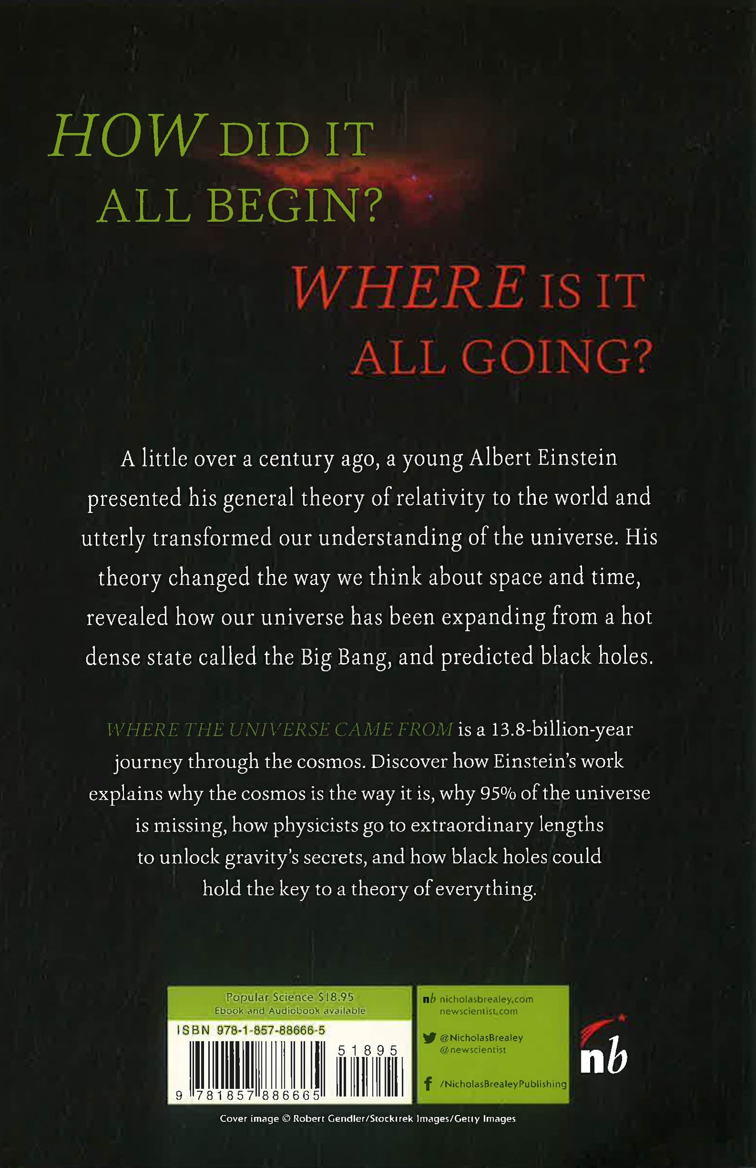 In Where The Universe Came From leading cosmologists and New Scientist explain that while we have made great progress, we still have plenty of unfinished business with the cosmos. How does the dark universe shape our cosmic destiny? What is really happening near black holes? Are we any closer to discovering the ripples in space-time predicted by Einstein? Why is relativity not the final answer?