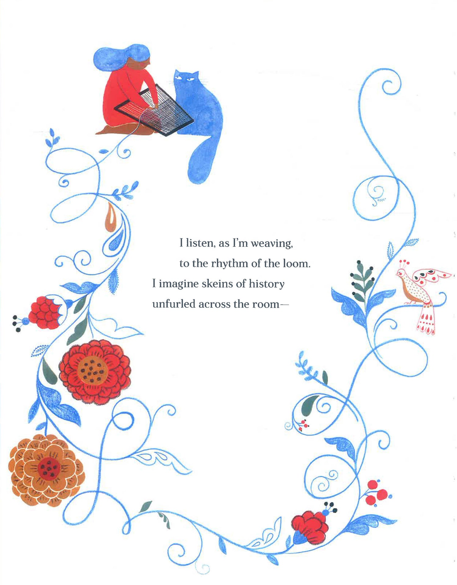 As rhythmic as the swish of a loom, and as vibrant as a skein of brightly dyed wool, this lyrical picture book shares the history and practice of weaving through the centuries and around the world, as imagined by a young weaver learning her craft. Her family's weaving practice helps her feel connected to the past and hopeful for the future. It shows her that each of us is a tapestry: a unique, rich, and beautifully interwoven combination of traits and traditions, with a pattern that is still emerging.