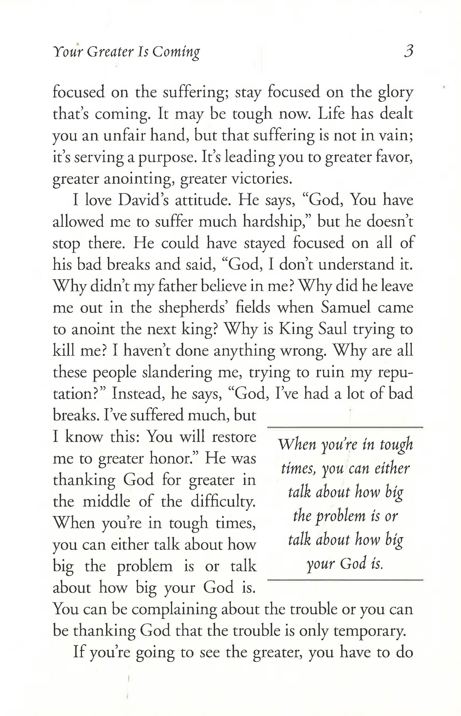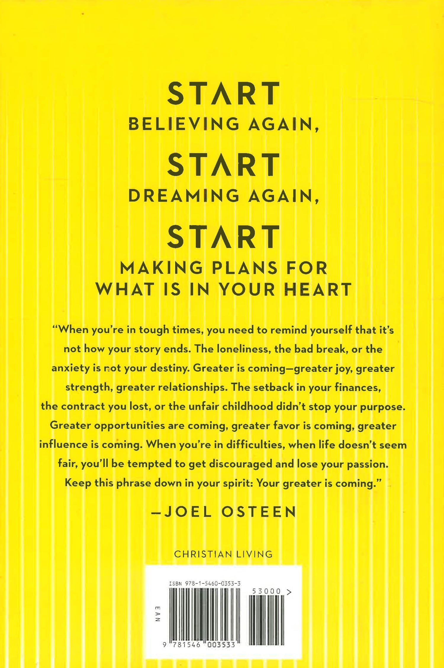 In Your Greater Is Coming, #1 New York Times bestselling author Joel Osteen challenges your perception of your present situation and inspires you to persevere for the best that’s just ahead. Whatever you’re experiencing, don’t lose faith or give up on your dreams. Wait for your greater, because your greater is coming—greater joy, greater strength, greater relationships. Greater opportunities, greater success, and greater peace are all yours. Whatever you’ve been waiting for, working for, praying for, and hoping for is on the way.