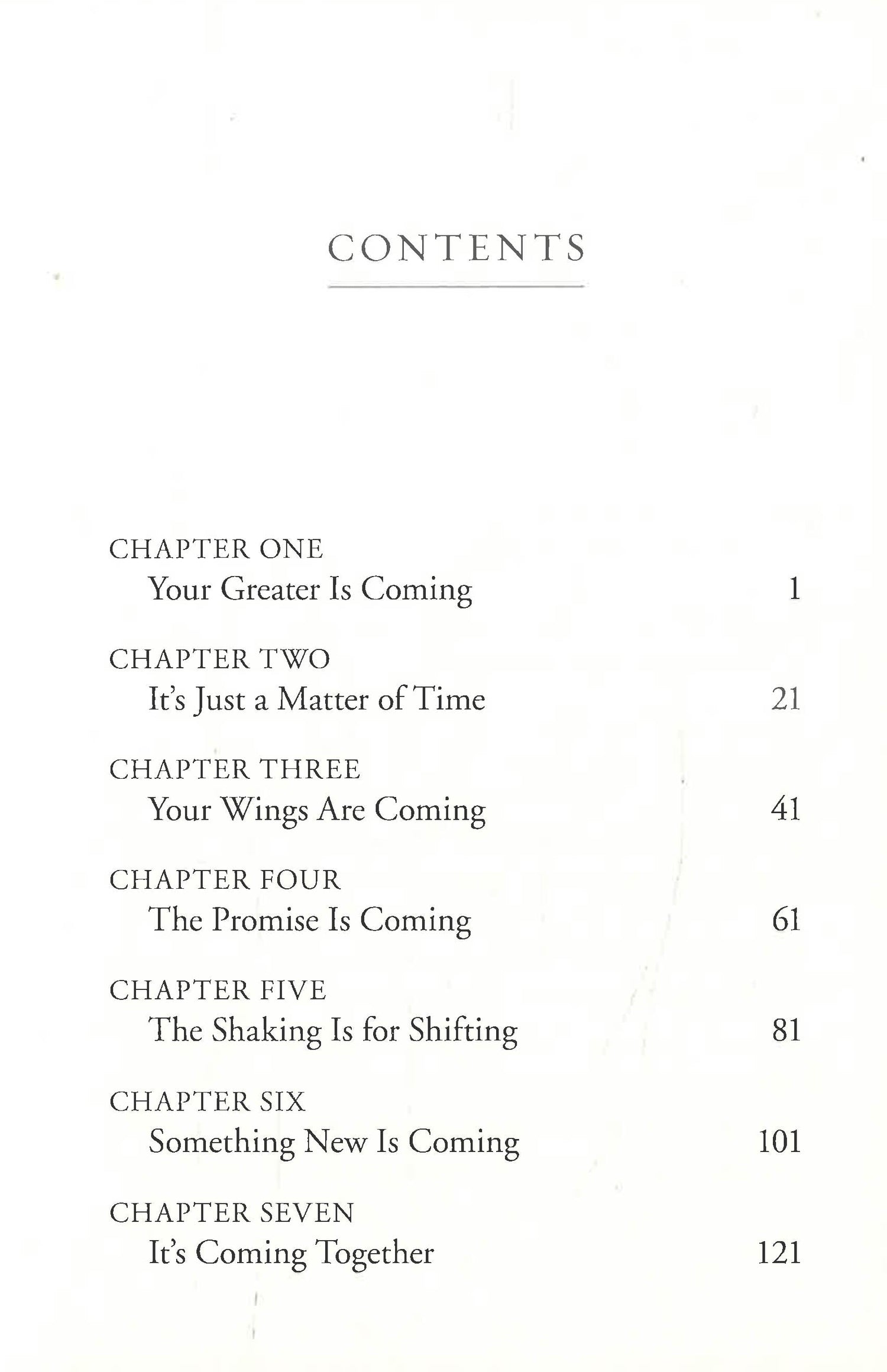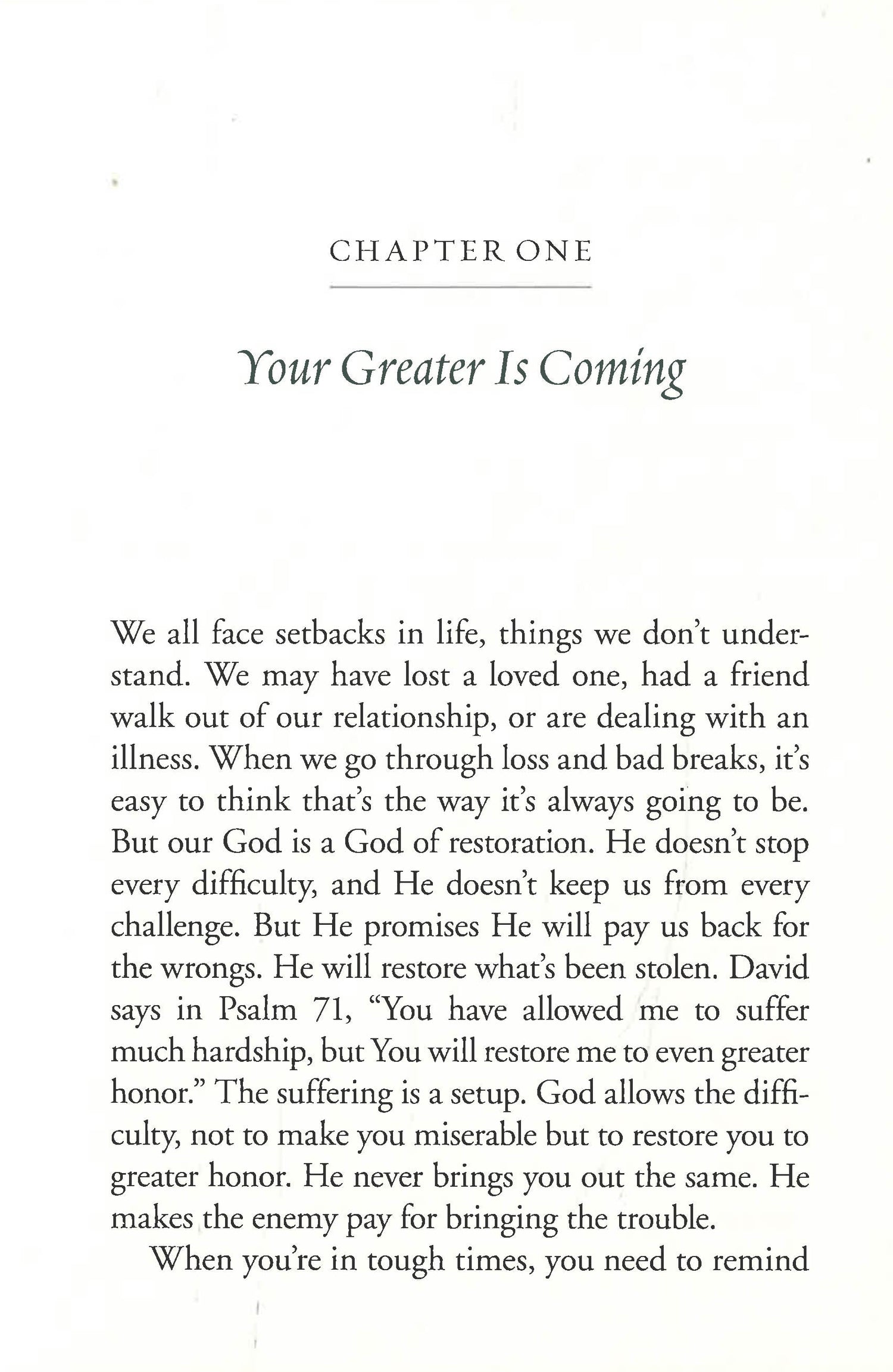 Your Greater Is Coming will nourish your soul and empower your heart to push through pain and master the mundane. Your story is far from over, and the best is yet to come. Don’t give up just as you’re about to discover a new level of increase, ease, and joy. Glimpse your breakthrough just ahead and hold on just a little longer—your greater is coming!