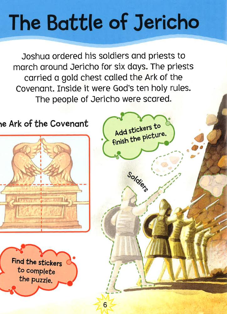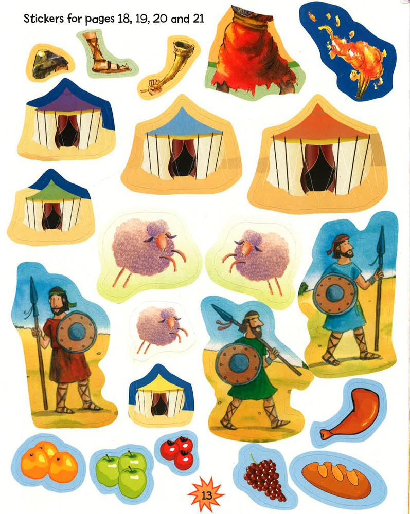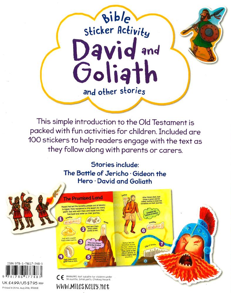 Bible Sticker Activity David and Goliath features a selection of stories simply retold for young children aged 3+, and 100 stickers to use inside. Stories included: The Promised Land, The Battle of Jericho, Israel Under Attack, A Surprise for Gideon, Gideon the Hero, David the Shepherd Boy, David and Goliath.