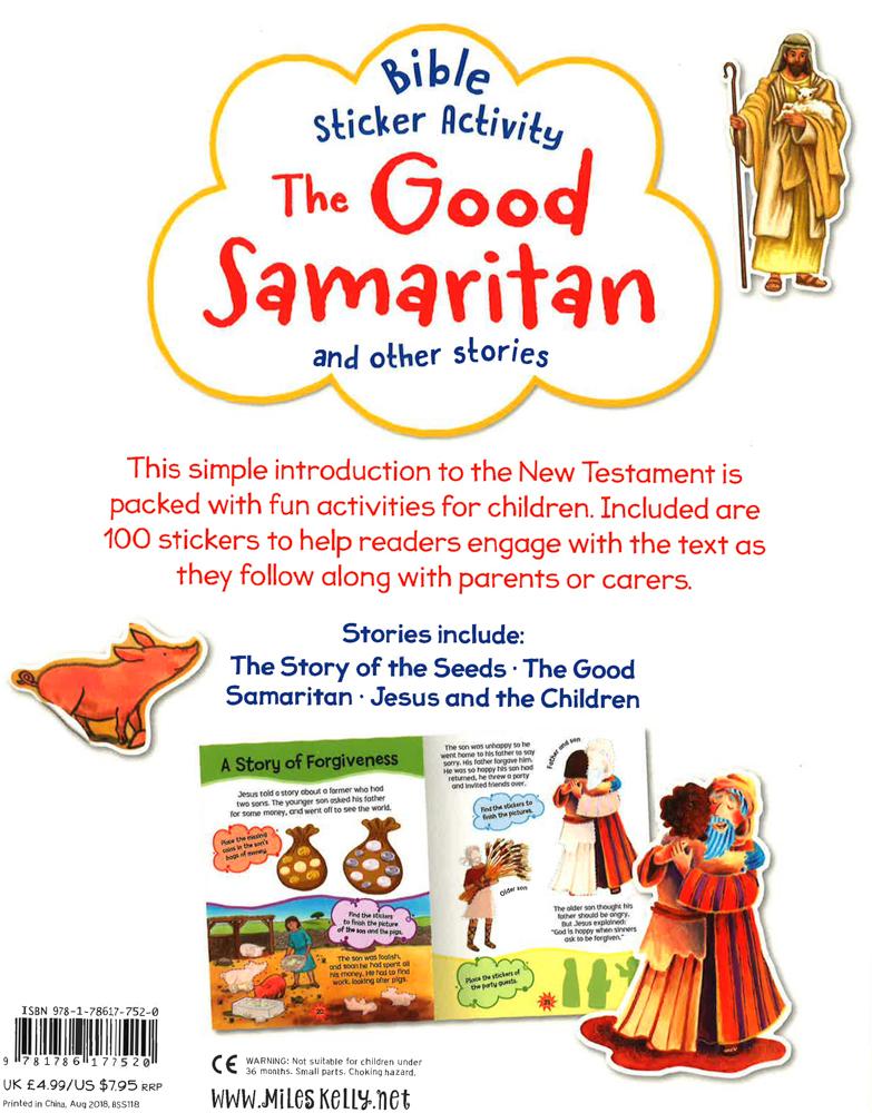 Bible Sticker Activity The Good Samaritan features a selection of stories simply retold for young children aged 3+, and 100 stickers to use inside. Stories included: The Story of the Seeds, The Good Samaritan, Jesus and the Children, Two in the Temple, The Good Shepherd, A Story of Forgiveness, The Lost Coins.