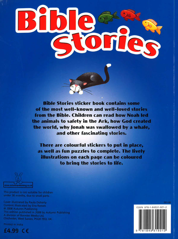 Bible Stories sticker book contains some of the most well-known and well-loved stories from the Bible. Children can read how Noah led the animals to safety in the Ark, how God created the world, why Jonah was swallowed by a wha;e, and otherr fascinating stories. There are colourful stickers to put in place, as well as fun puzzles to complete. The lively illustrations on each page can be coloured to bring the stories to life.