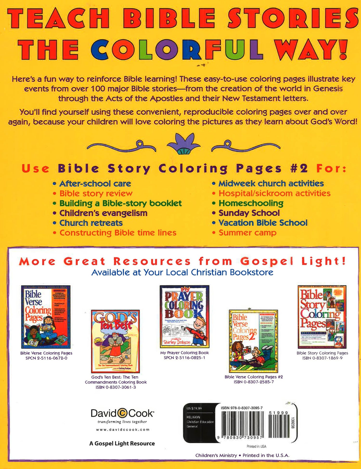 By popular demand, now you have more colorful ways to teach God's Word! These easy-to-use coloring pages illustrate key events from more than 100 major Bible stories, from the creation of the world in Genesis through the Acts of the Apostles and their New Testament letters. Each coloring picture contains an easy-to-read Bible story on the back side of the page, which can be used to review or introduce a lesson's Bible story. You'll find yourself using these convenient reproducible coloring pages over and over again, because your children will love coloring the pictures as they learn about God's Word!