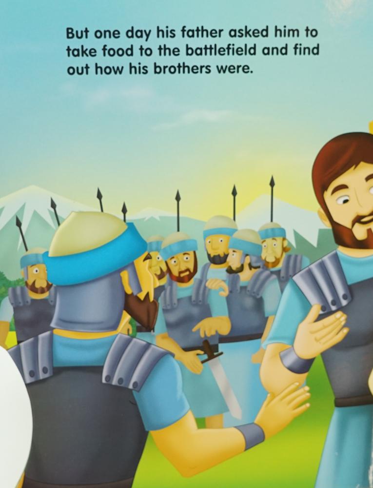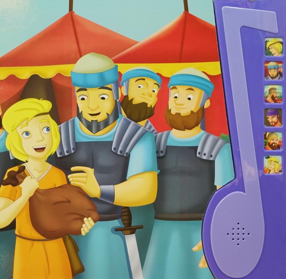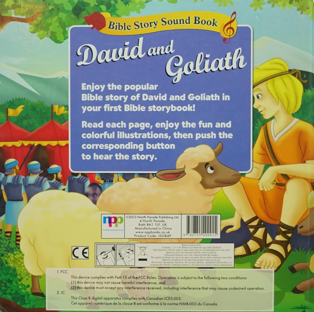 Enjoy the popular Bible story of David and Goliath in your first Bible storybook! Read each page, enjoy the fun and colourful illustrations, then push the corresponding button to hear the story.