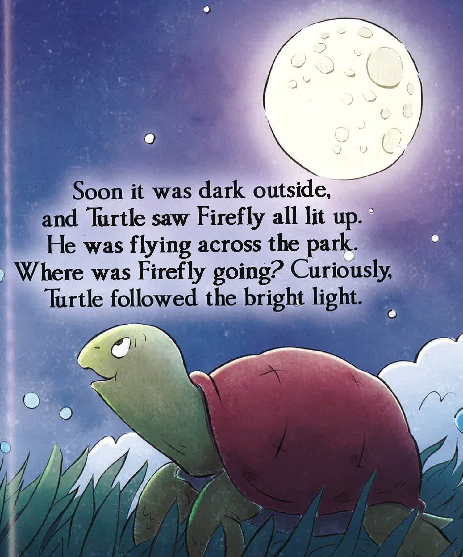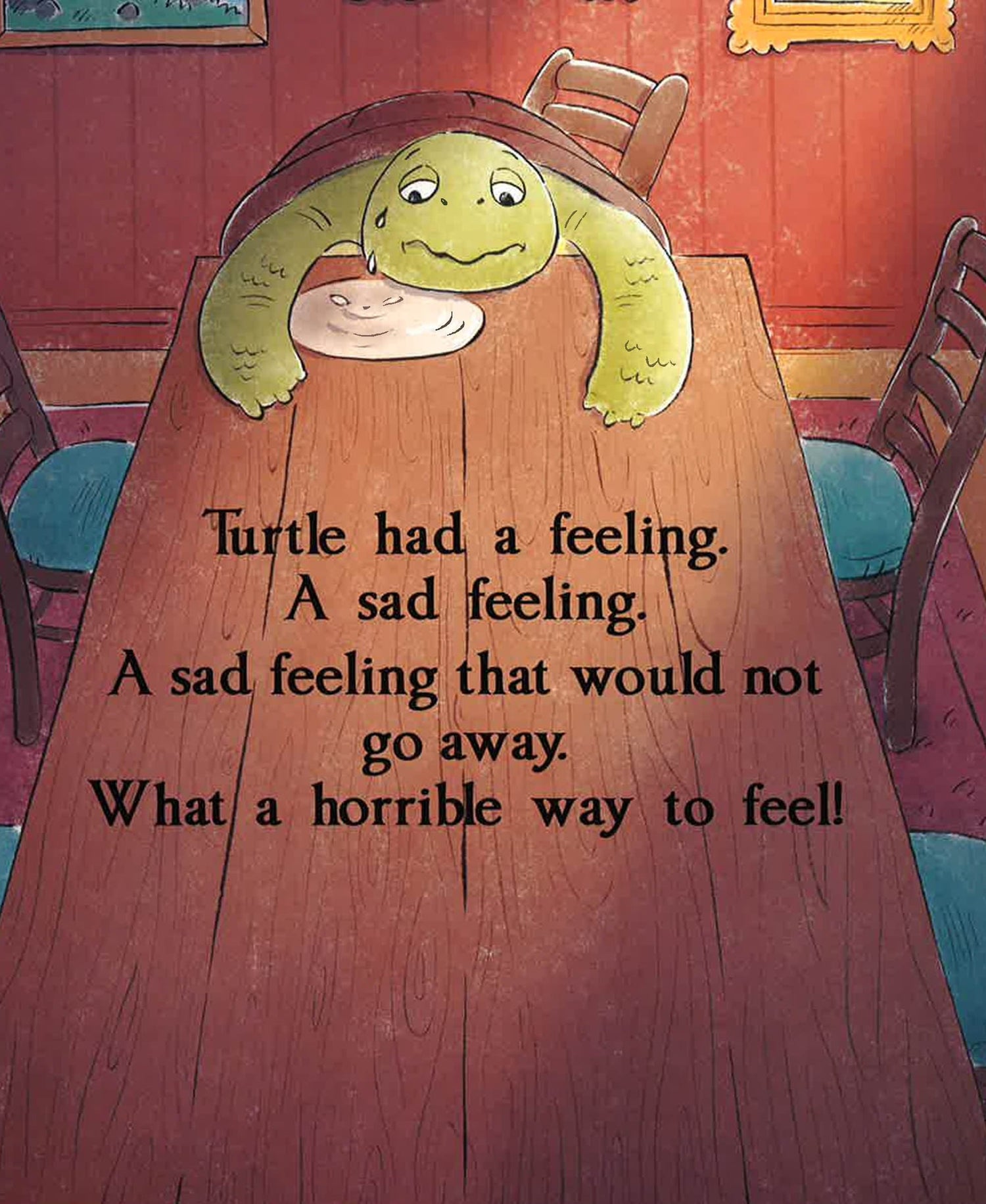 Turtle has a sad feeling that won't go away. Squirrel is happily gathering nuts, Bee is buzzing from flower to flower, and Rabbit is hopping around the carrot patch, but it doesn't matter: Turtle just can't shake his sad feeling! Even at his dad's birthday celebration, Turtle is still feeling glum. What will it take to make Turtle feel right again?