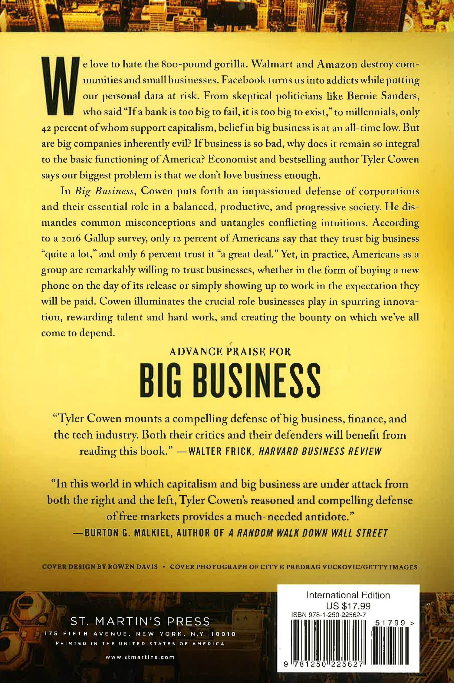 An against-the-grain polemic on American capitalism from New York Times bestselling author Tyler Cowen. We love to hate the 800-pound gorilla. Walmart and Amazon destroy communities and small businesses. Facebook turns us into addicts while putting our personal data at risk. From skeptical politicians like Bernie Sanders who, at a 2016 presidential campaign rally said, "If a bank is too big to fail, it is too big to exist," to millennials, only 42 percent of whom support capitalism, belief in big business is at an all-time low. But are big companies inherently evil? If business is so bad, why does it remain so integral to the basic functioning of America? Economist and bestselling author Tyler Cowen says our biggest problem is that we don't love business enough. In Big Business, Cowen puts forth an impassioned defense of corporations and their essential role in a balanced, productive, and progressive society. He dismantles common misconceptions and untangles conflicting intuitions. According to a 2016 Gallup survey, only 12 percent of Americans trust big business "quite a lot," and only 6 percent trust it "a great deal." Yet Americans as a group are remarkably willing to trust businesses, whether in the form of buying a new phone on the day of its release or simply showing up to work in the expectation they will be paid. Cowen illuminates the crucial role businesses play in spurring innovation, rewarding talent and hard work, and creating the bounty on which we've all come to depend.