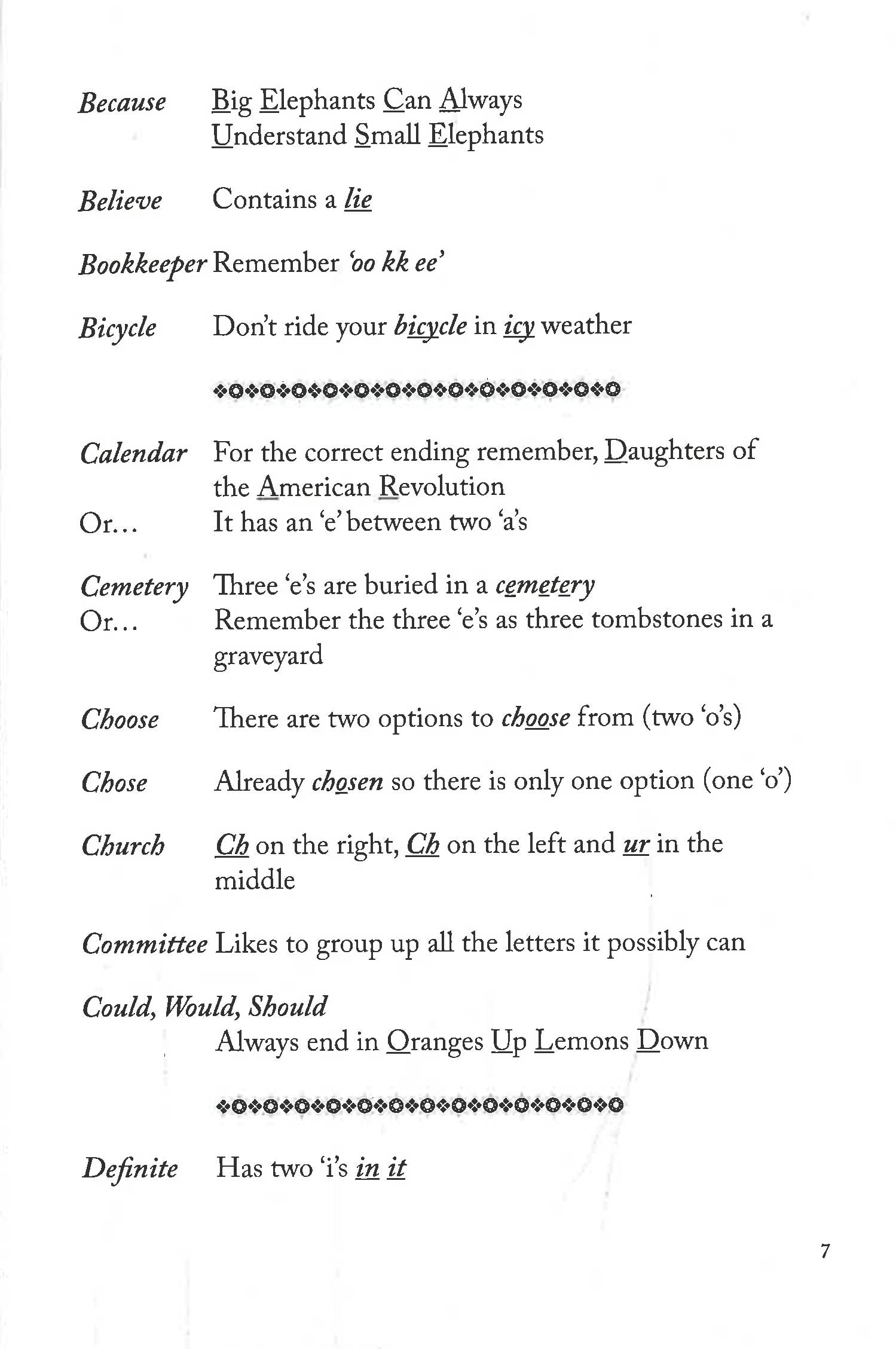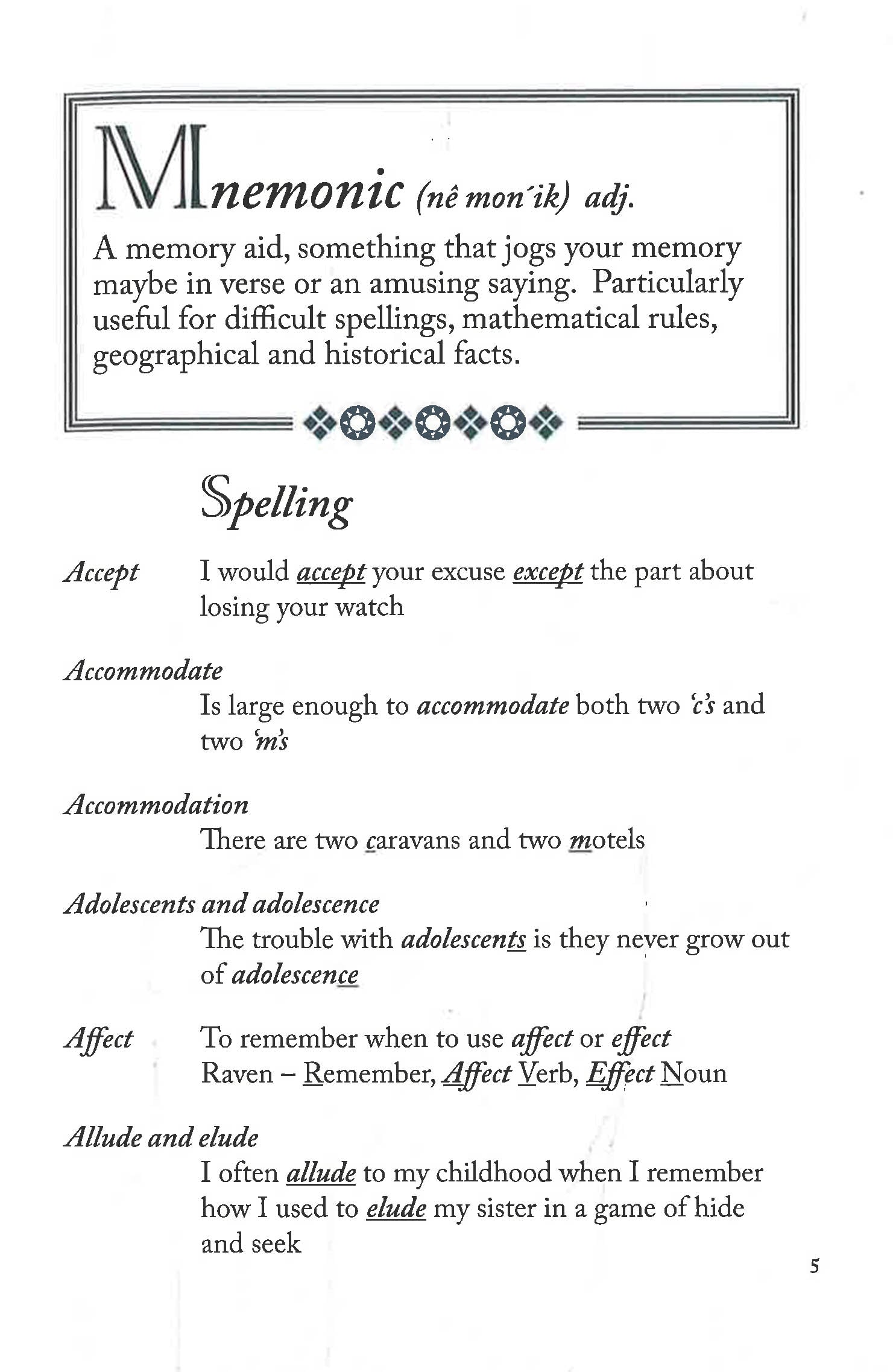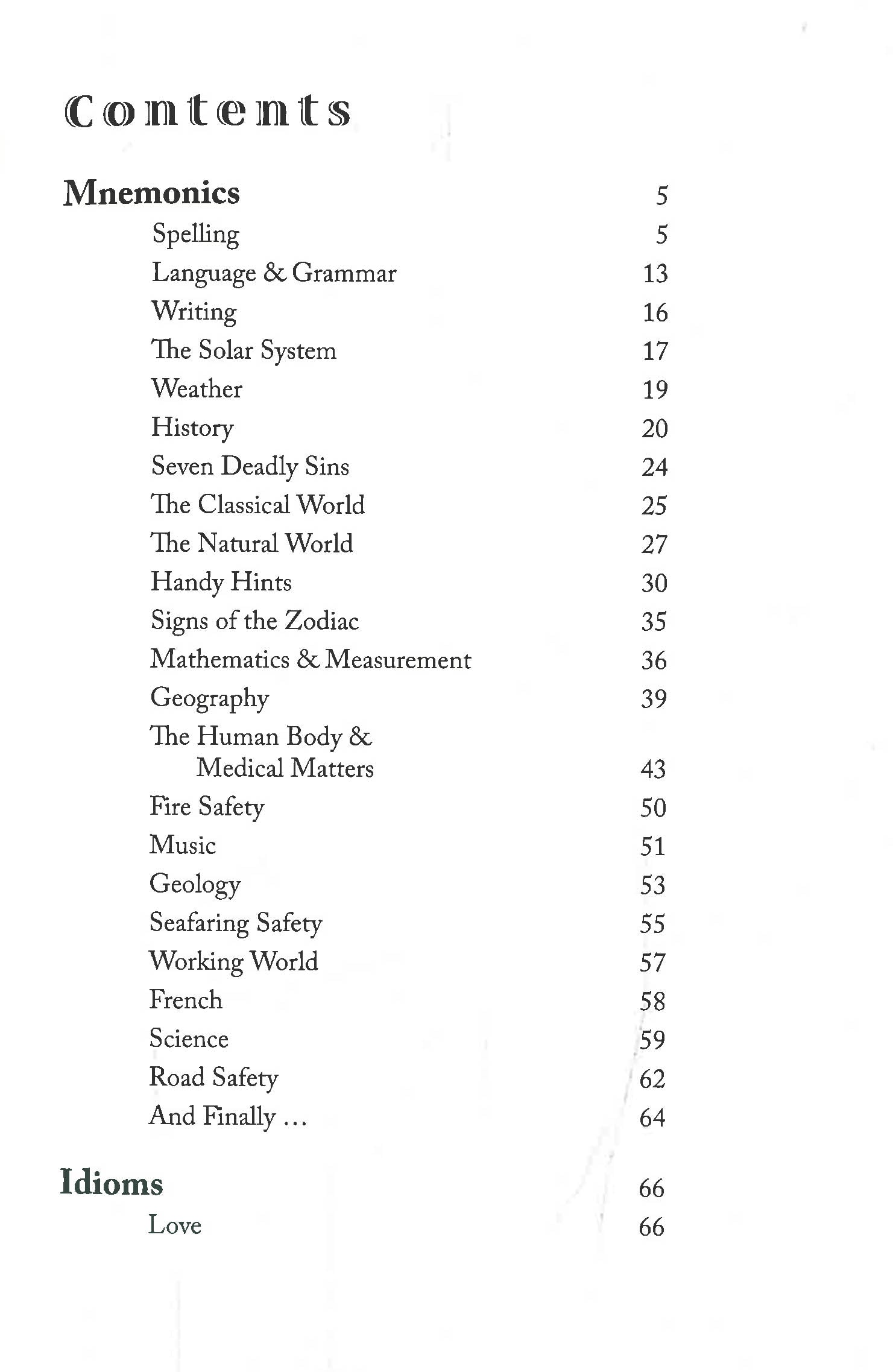 This fascinating collection provides hundreds of simple mnemonics to help you remember awkward spellings, grammatical rules and useful facts and figures.