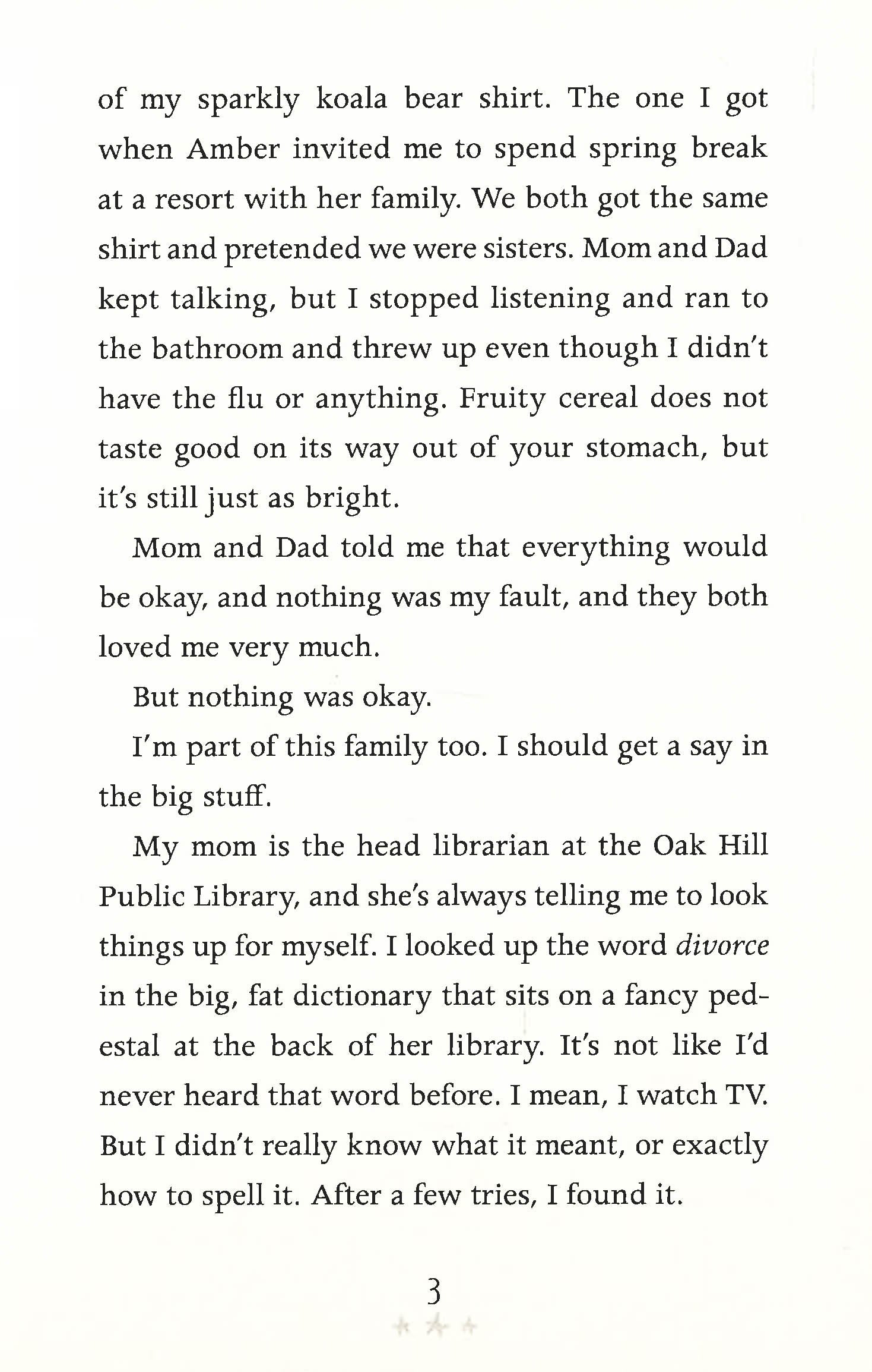 Set in Wisconsin, with wonderfully nuanced characters—from the bossy new girl, who acts big but has a secret of her own, to the sporty girl who acts little and shy but who becomes an unexpected friend—this is a book about much more than divorce.