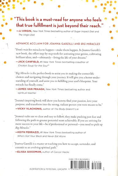 Experience the power of actively transforming your life with spiritual success coach Joanna Garzillis revolutionary 11 Spiritual Rules for creating Big Miracles, a lifechanging program to manifest everyday miracles, create radical prosperity, and live a life filled with purpose. Imagine creating miracles every day. The power is in your hands with Big Miracles. Spiritual success coach Joanna Garzilli has helped countless clients, from executives to celebrities, make over their lives and find ultimate fulfillment. Now, she invites you to experience the power of her practical, prescriptive 11-step system to manifest miracles that lead to big breakthroughs in your life. The 11 Spiritual Rules of Big Miracles will teach you exactly how to make huge positive changes in your life and replace anxiety with tranquility, self-doubt with self-acceptance, and insecurity with certainty about your life purpose how to achieve your dreams and actively create miracles. Each chapter shows you, with encouragement and grace, both how to live its lessons and how doing so will create your miracle. Laying the foundation with the first rule, Align with Spirit, Garzilli illustrates how to build from there to: Be a Spiritual Vehicle Commit to Your Breakthrough Forgive Mistakes Live Without Ego Believe in Your Ability Accept Responsibility Aim High Take the Right Action Be of Service Get Outside Your Comfort Zone With Big Miracles, you will discover how to nurture your connection to Spirit to move forward with momentum and create the outcomes you desire. Filled with deep wisdom, empowering meditations and journaling exercises, and concrete strategies for achieving the life of your dreams, Big Miracles is your own personal guide to creating the miracles you never thought possible.*This book may have remainder mark*