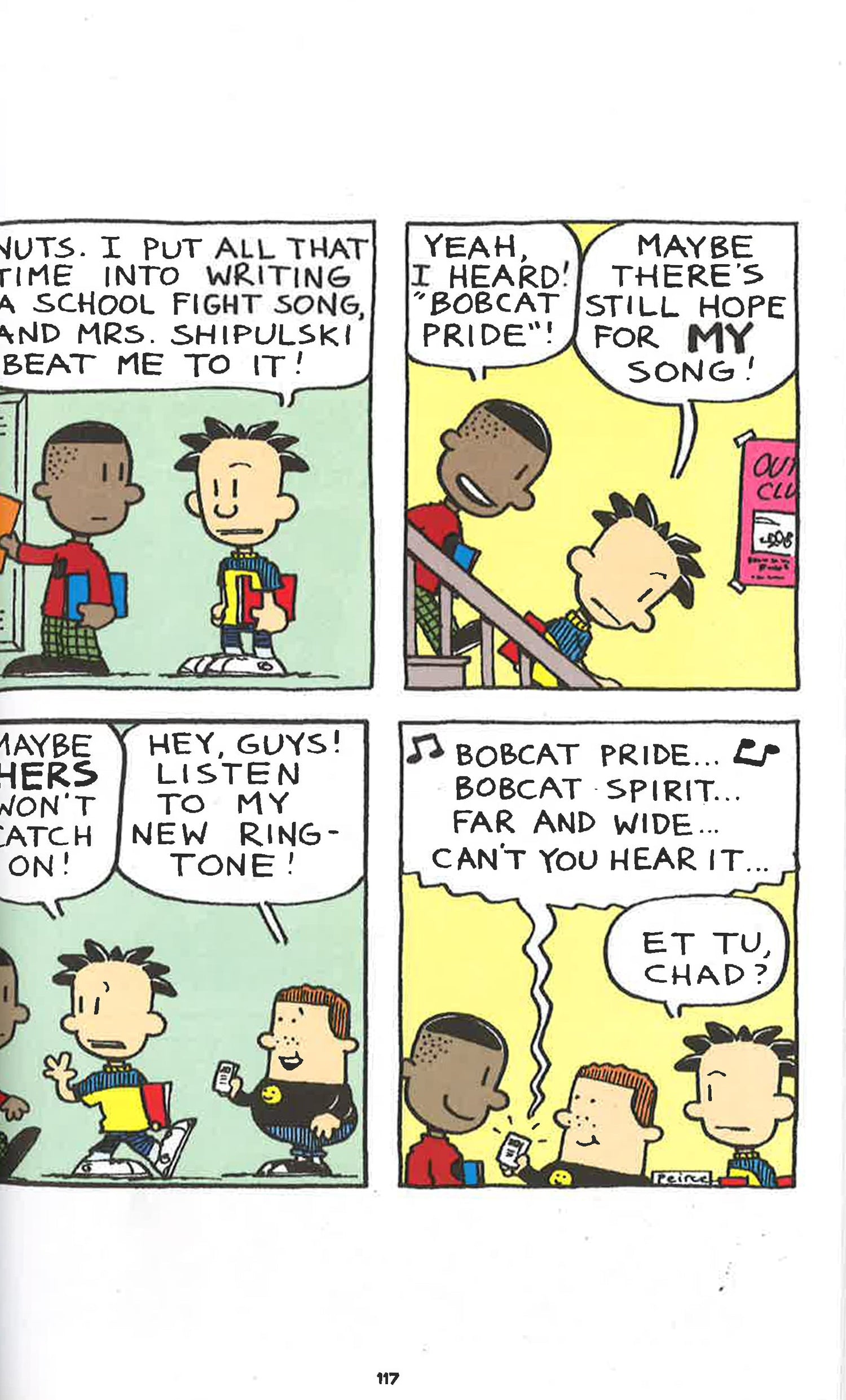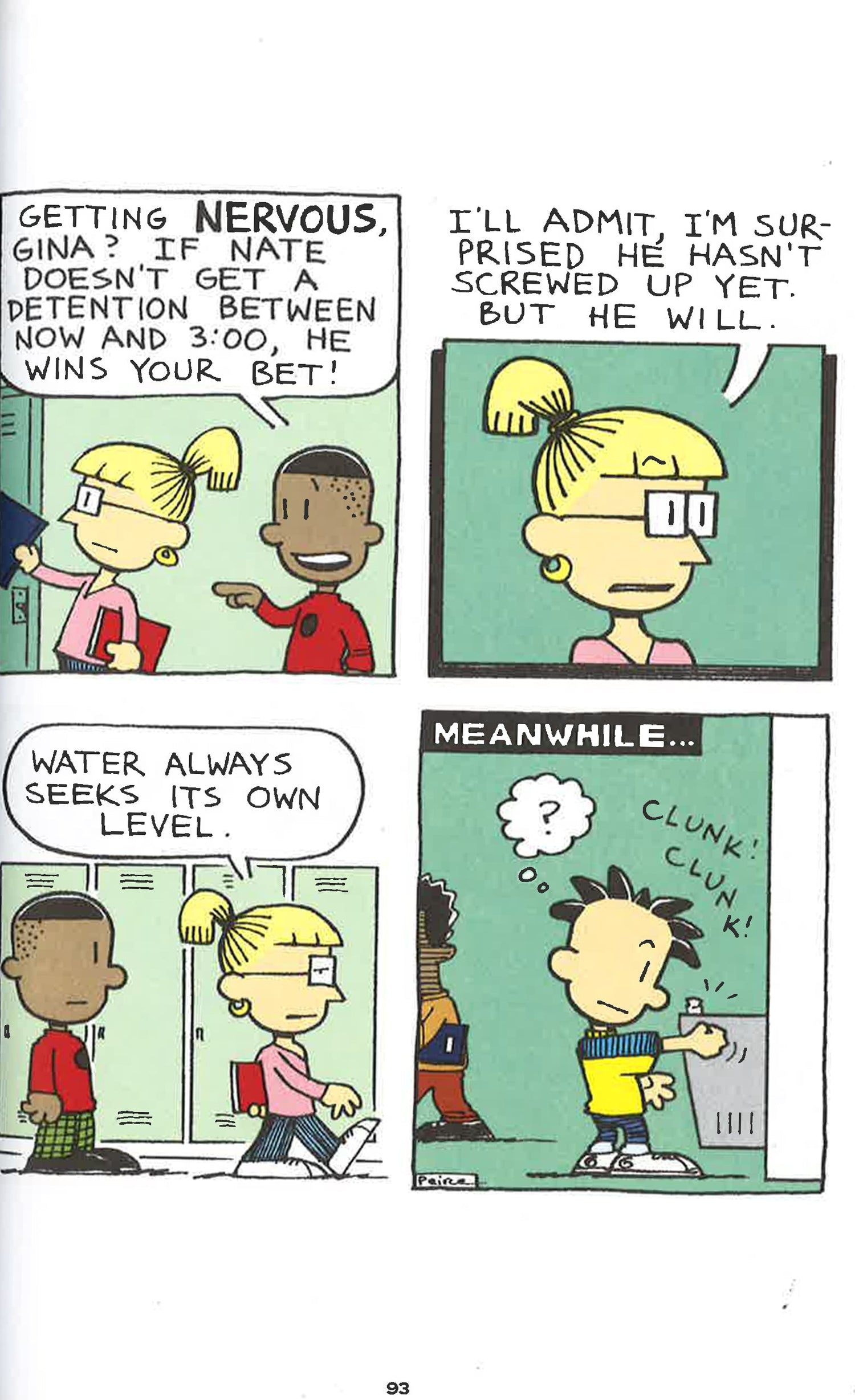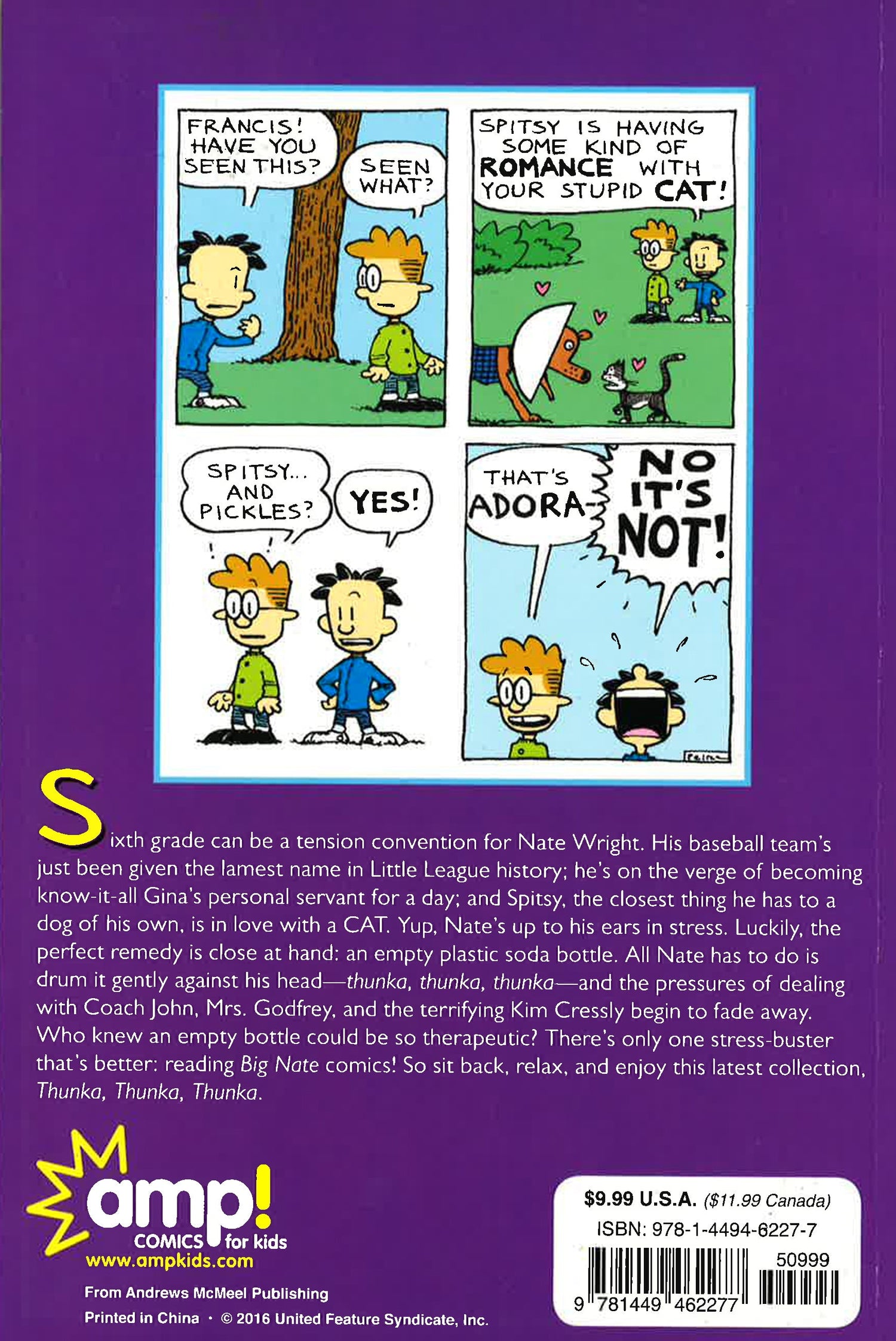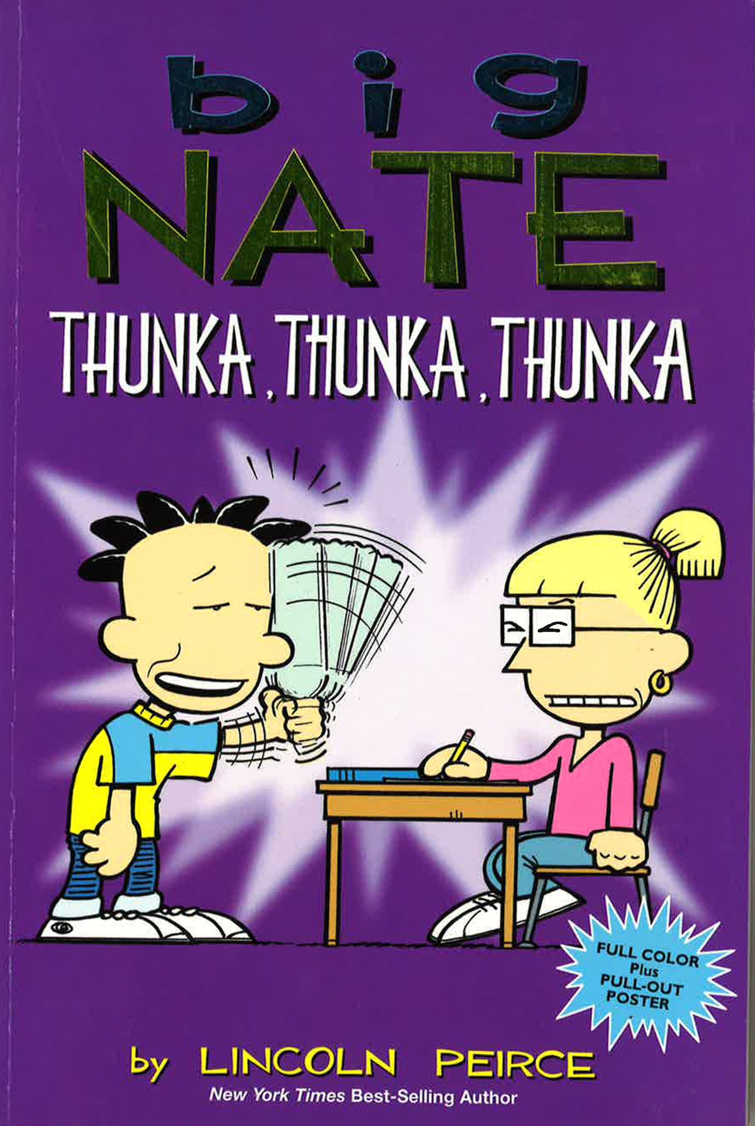 There's never a dull moment with Nate Wright in the picture. Whether getting caught playing table football in the library or raiding the teachers' lounge, Nate's antics are always hilarious and detention worthy! Nate Wright has it pretty rough. His neighbor's loyal but loony dog Spitsy befriends a cat, Nate's baseball team has just been named the "Cream Puffs," and he has to stay out of detention for a whole week unless he wants to lose a bet to know-it-all Gina and be her personal slave for an entire day! What's a sixth grader to do?? Not Coach John's wind sprints. Thunka, thunka, thunka, that's what! Nate puts a plastic bottle to his head and thunks his way past bullies, his arch nemesis/social studies teacher Mrs. Godfrey, and Kim Cressly-a girl with a big crush and an even bigger grip. Nate and best pals Francis and Teddy blow off some steam in this latest Big Nate collection Thunka, Thunka, Thunka.
