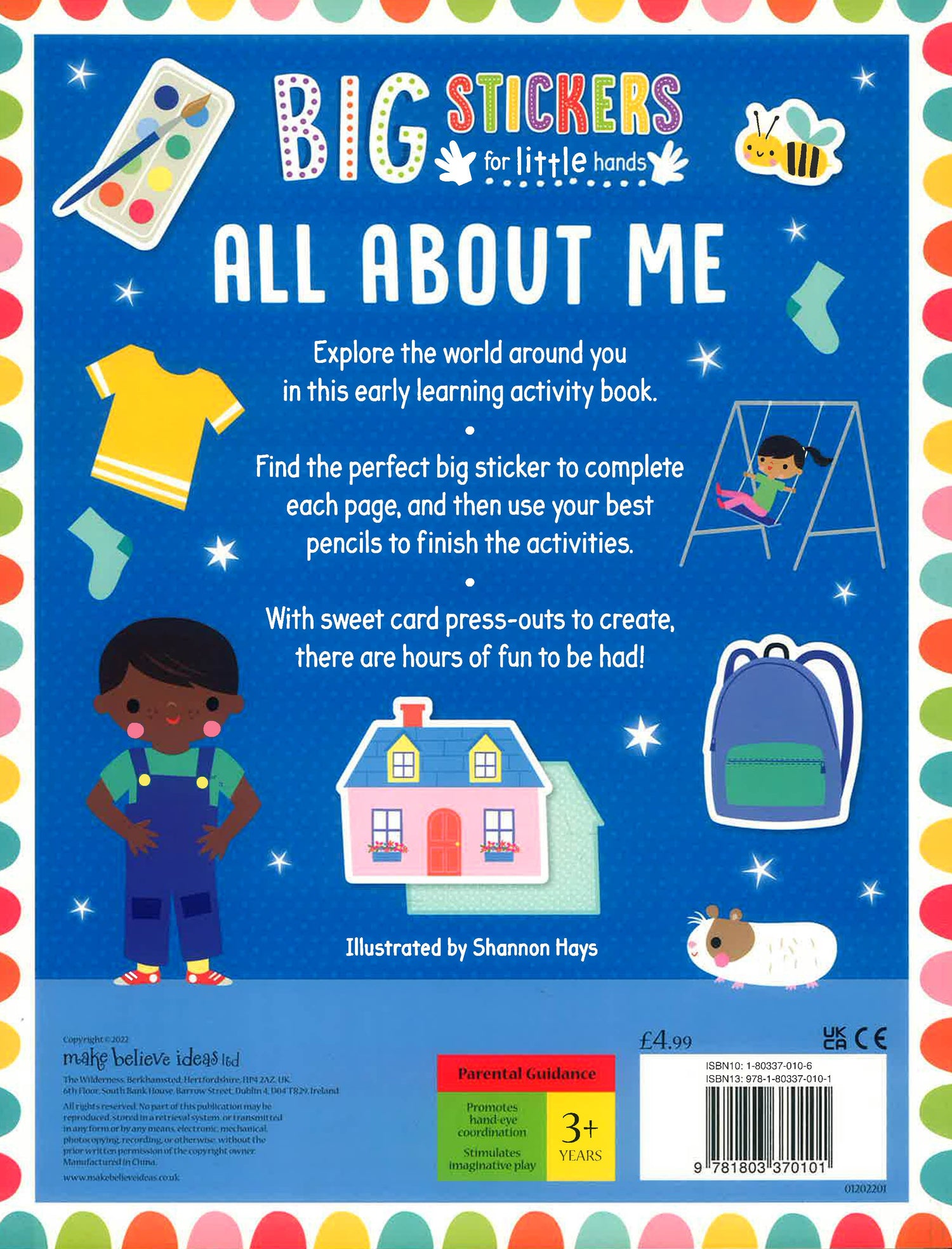 Explore the world around you in this engaging activity book. Each spread is packed with simple activities and big stickers that are perfect for little hands. With card press-outs and delightful illustrations, there are hours of fun to be had! - Includes 2 sheets of big stickers /- With 2 sheets of fun card press-outs /- 16 pages of simple, early learning activities FUN ACTIVITY BOOK WITH BIG STICKERS FOR LITTLE HANDS, COLOURING AND CARD PRESS-OUT PAGES