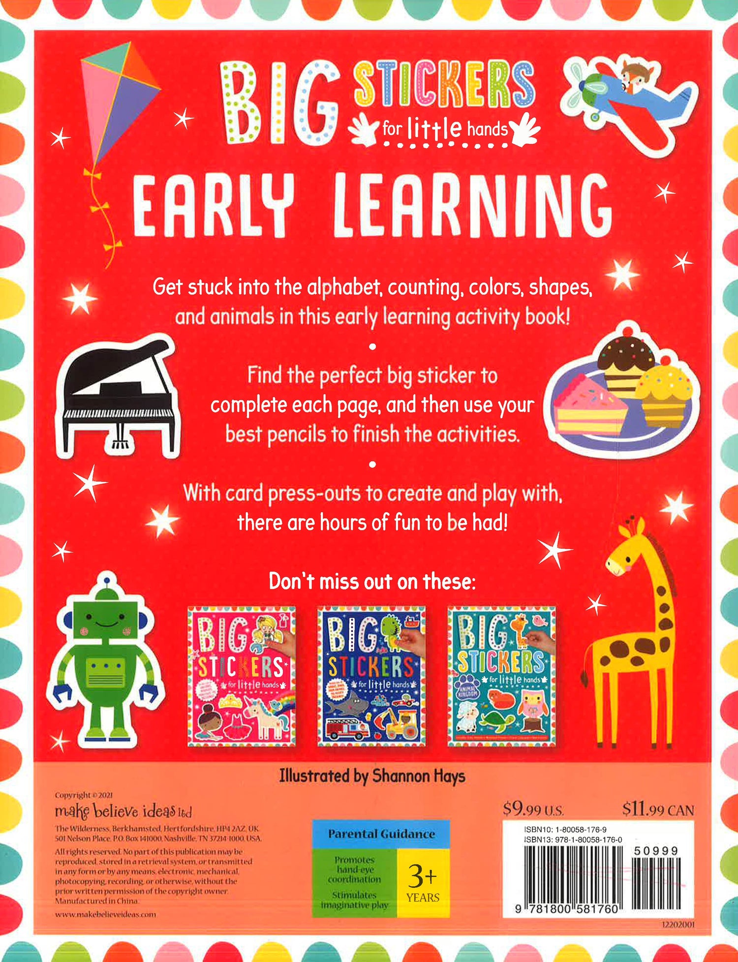 Get stuck in with early learning concepts in this amazing activity book. Big Stickers for Little Hands Early Learning includes activities themed around learning your ABCs, 123s, Colors and Shapes, and Animals. With simple card press-outs to create and big stickers to find on every page, this book is perfect for little ones.
