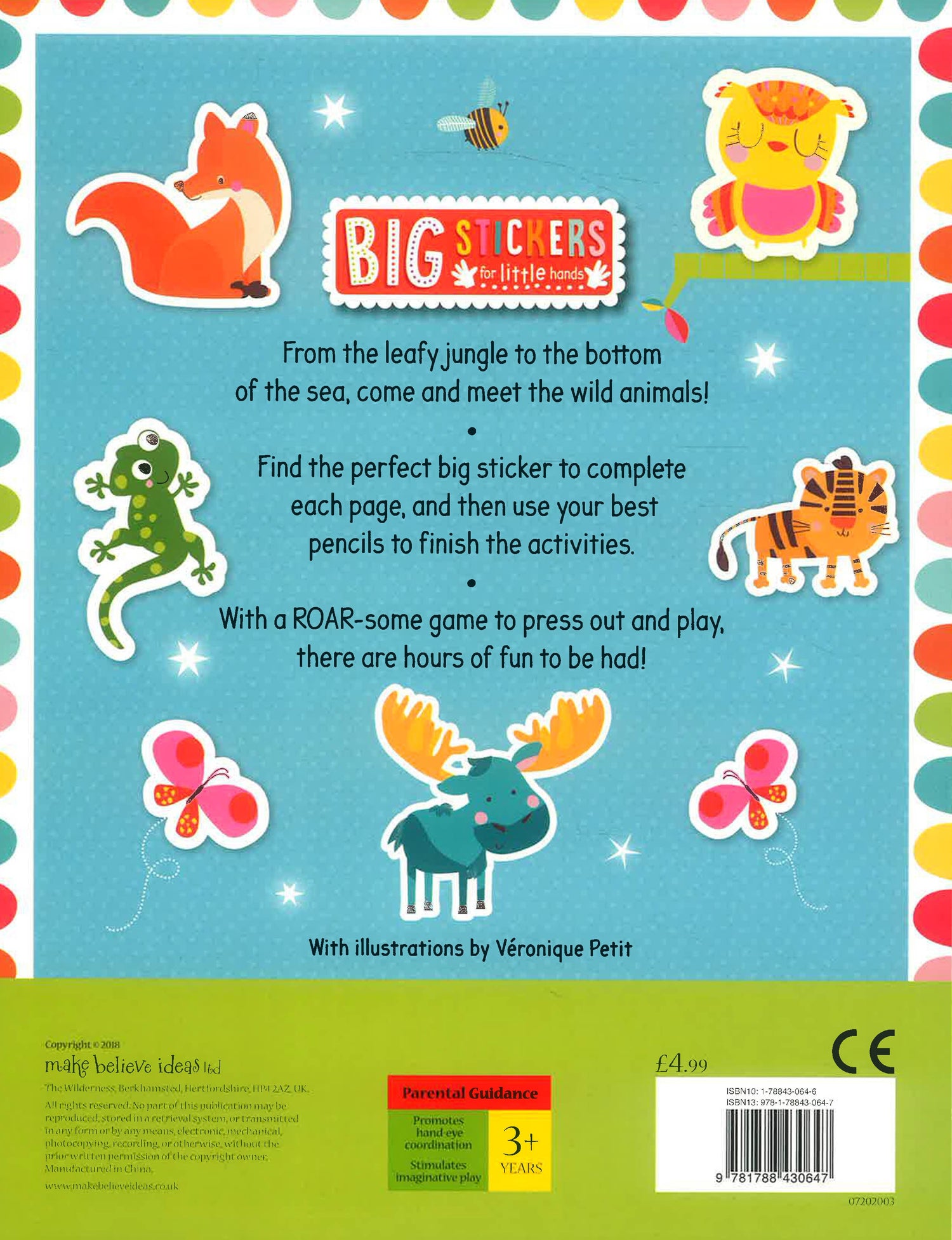 Introducing a collection of ten big sticker books for young children to enjoy! Each spread is packed with simple activities and big stickers that are perfect for little hands. With card press-outs and delightful illustrations, there are hours of fun to be had! Big Stickers for Little Hands titles: Baby Animals, Ballet Show, Dinosaur Island, Farm friends, Mermaid Lagoon, Mighty Machines, Princess Palace, Super Sharks, Magical Unicorns and Wild Animals ACTIVITY BOOKS WITH BIG STICKERS FOR LITTLE HANDS, COLOURING AND CARD PRESS-OUT PAGES A set of 10 themed big sticker books for young children. Simple instructions allow young children to produce art they can be proud of. The sweet illustrations will engage young children. Each title includes 4 pages (2 sheets) of stickers and 2 pages of card press-outs. The drawing and colouring activities help develop hand-eye coordination.