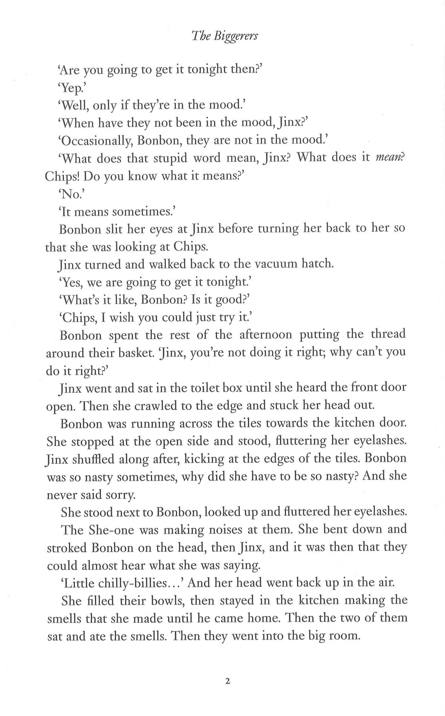 The Biggerers is set in a dystopian future where our two heroes, Bonbon and Jinx, spend their days gathering stones and feathers for their basket, and waiting to be fed by their owners. But it's not long before getting sick, falling in love and wondering why they can't eat with a spoon pushes them to realise they are exactly the same as their owners...only smaller.
