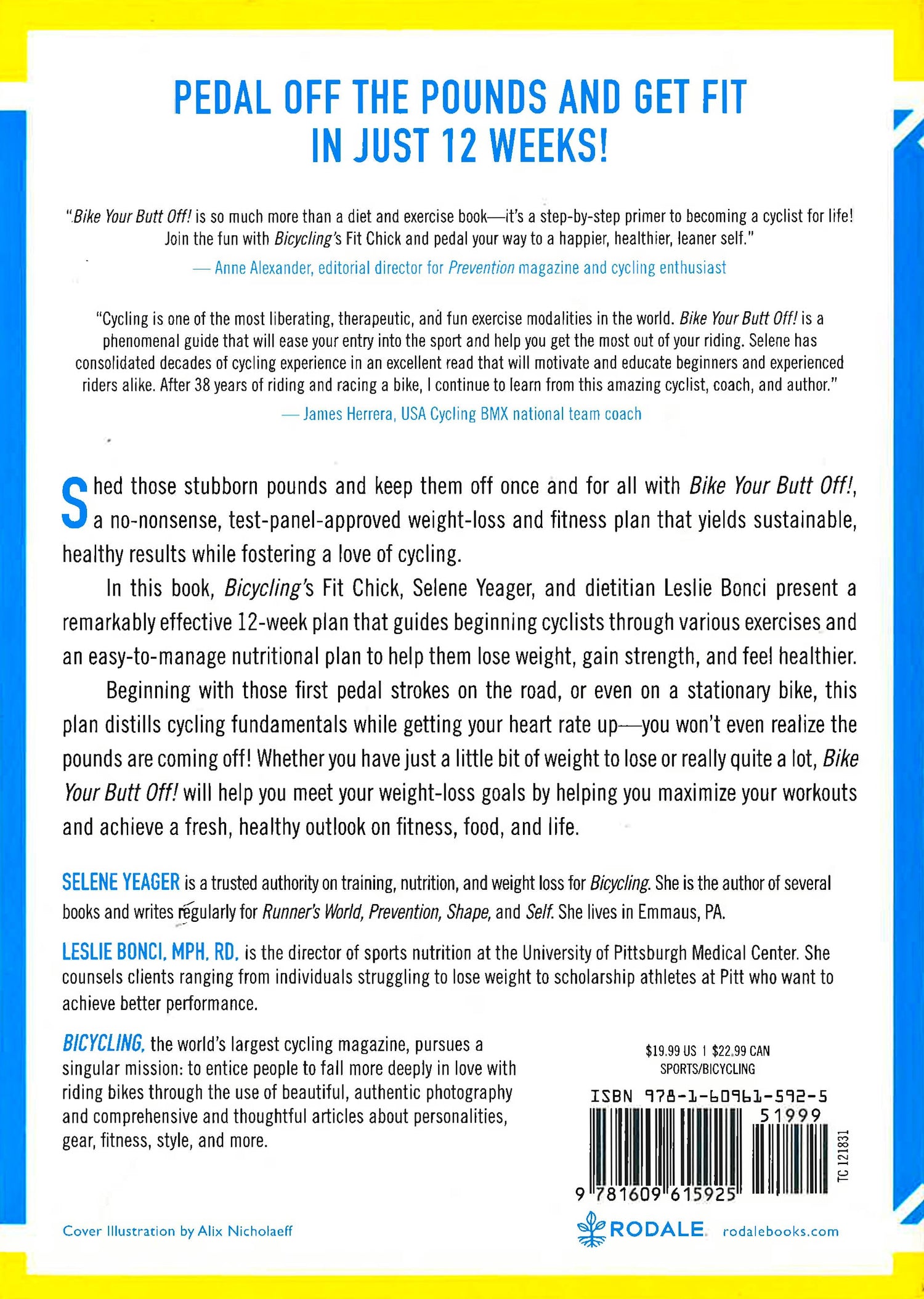 Given our struggling economy as well as the national struggle to maintain our waistlines, cycling is enjoying a renaissance as more than 57 million people in the United States use bicycles regularly. Now "Bicycling"'s Fit Chick presents a brand-new, 12-week weight-loss and exercise plan for beginner and experienced cyclists alike. Whether readers have just a little bit of weight to lose or a lot, "Bike Your Butt Off! "will help them meet their weight-loss goals in no time, thanks to its expert-tested food and exercise plans from authors Selene Yeager and Leslie Bonci. By outlining basic rules of the road, social elements of cycling, and the sustaining weight-loss benefits of cycling, "Bike Your Butt Off! "distills the core fundamentals of cycling so that any beginner can adopt it as a lifelong endeavor. With delicious nutritional information, tips, training plans, and fat-burning and heart-pumping exercises to help maximize workouts, readers will see the pounds melt off while having the time of their lives. *This book may have remainder mark