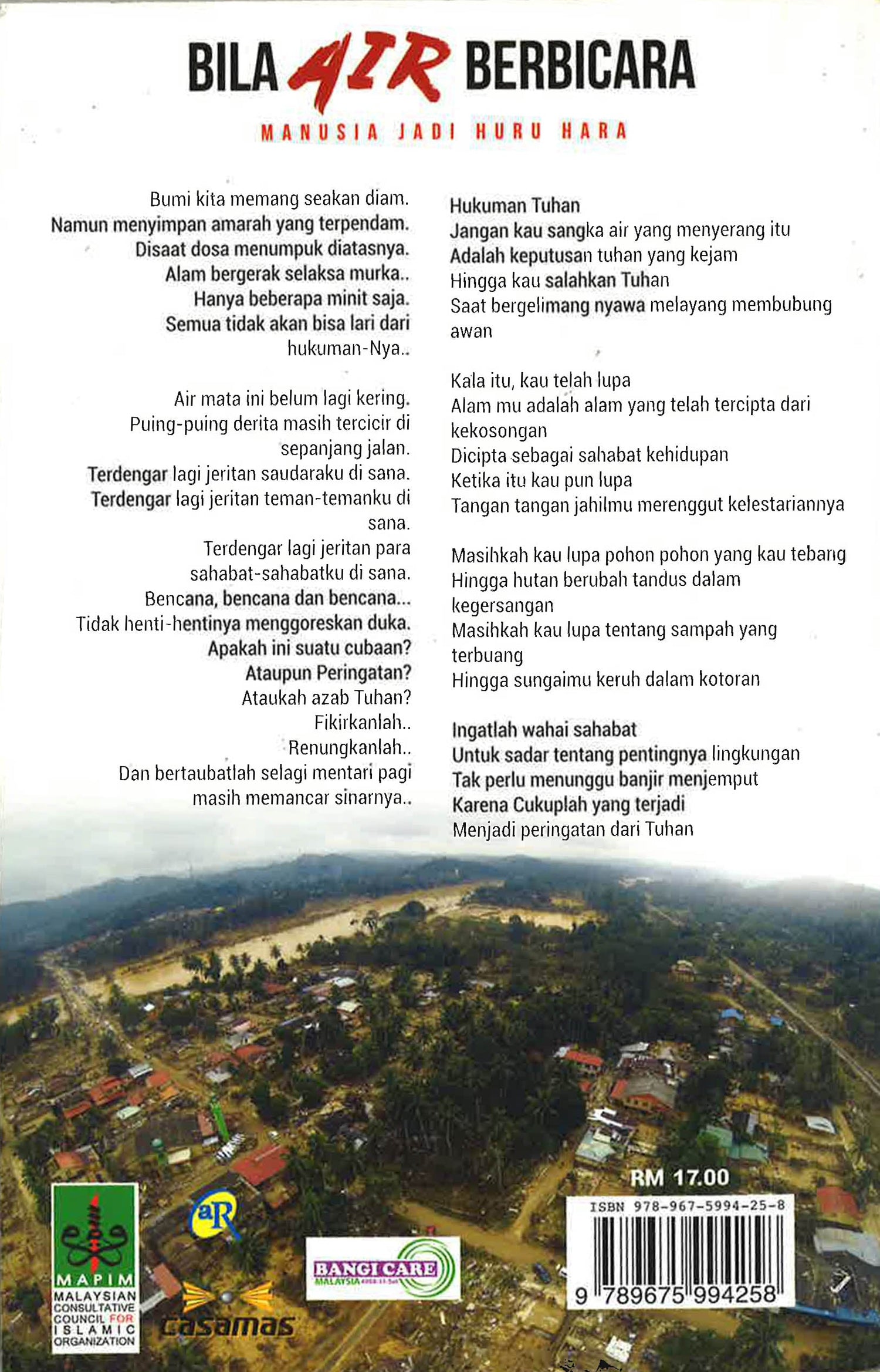 Bumi kita memang seakan diam. Namun menyimpan amarah yang terpendam. Disaat dosa menumpuk diatasnya. Alam bergerak selaksa murka.. Hanya beberapa minit saja. Semua tidak akan bisa lari dari hukuman-Nya.. Air mata ini belum lagi kering. Puing-puing derita masih tercicir di sepanjang jalan. Terdengar lagi jeritan saudaraku di sana. Terdengar lagi jeritan teman-temanku di sana. Terdengar lagi jeritan para sahabat-sahabatku di sana. Bencana, bencana dan bencana... Tidak henti-hentinya menggoreskan duku. Apakah ini suatu cubaan? Ataupun peringatan? Ataukah azab Tuhan Fikirkanlah... Renungkanlah... Dan bertaubatlah selagi mentari pagi masih memancar sinarnya...