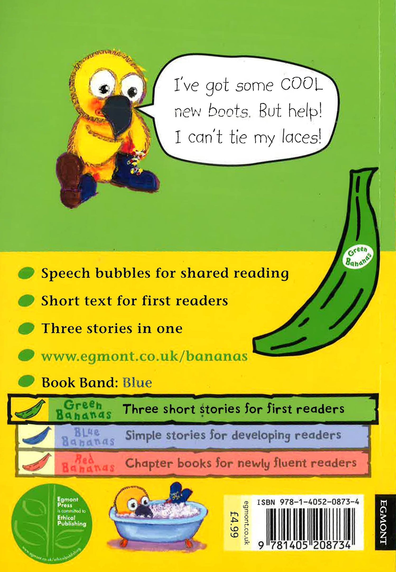 A story perfect for kids just learning to tie their own laces from Vivian French for Egmont's green banana series. Bill Bird has got some really cool new boots. The problem is, he can't untie his laces! So when he goes Molly Mouse's party, he treads on everyone's toes. Finally, Molly helps him undo them. But then there's another problem. He can't tie them again! Three delightful stories about the trials of a young bird and his new boots. Green bananas are divided into short, simple stories to develop reading techniques over a number of sessions. They are suitable for NC Level 1 readers. Green Bananas are carefully designed with education in mind, supporting children's understanding of how to read longer books. Green bananas only use one clause in each sentence and rely on dialogue and speech bubbles to encourage reading aloud.