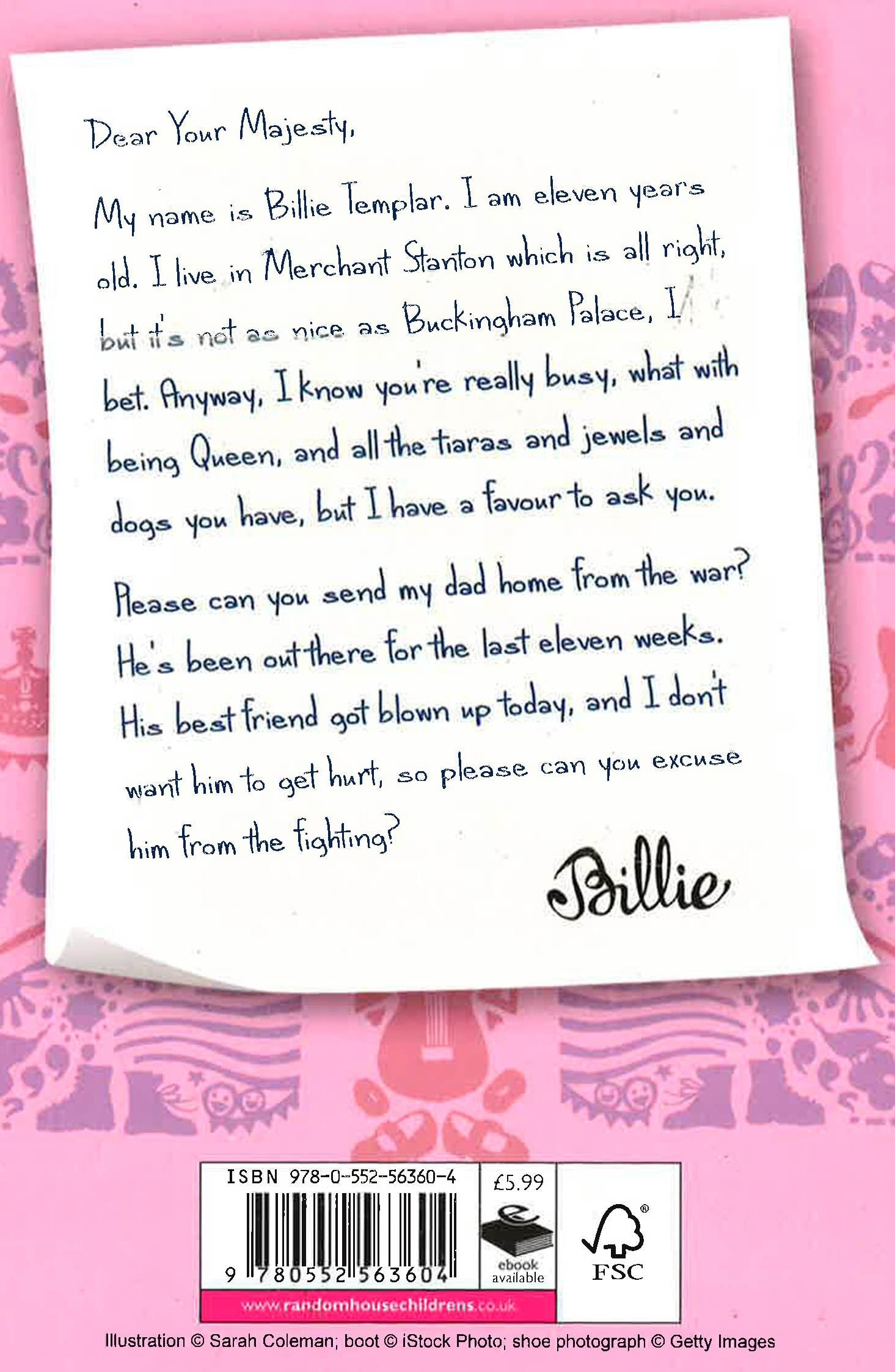Then, when one of the other soldiers in Dad's regiment is seriously hurt, the stakes get even higher. Billie needs her dad home, sharpish. There's only one person who can help - Her Majesty. She's in charge of the army, right? She can send Dad home! Billie tries to get inside Buckingham Palace to sort it out, but it's not that easy. So, with the help of shy Sarah and allergy-prone Jake, the school brass band and a motley team of enthusiastic old-age pensioners, Billie hatches a fool-proof plan to get the Queen to her little village instead...