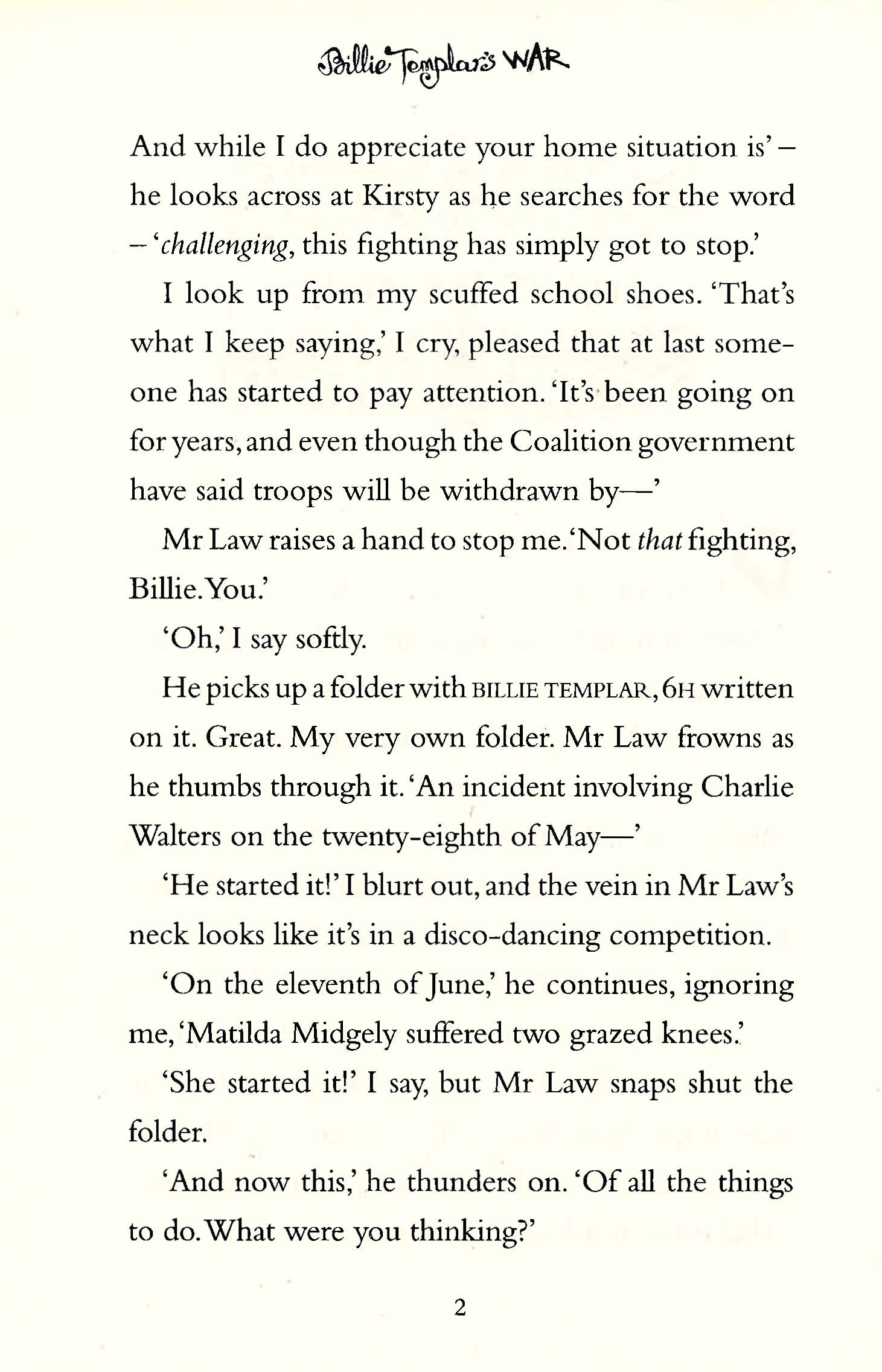 Billie Templar desperately wants her dad to come home. He's a soldier and has been away for seven weeks, fighting for 'Queen and country' - but how can the two of them possibly defend their four-year record of winning the three-legged race at the school carnival if he's thousands of miles away?