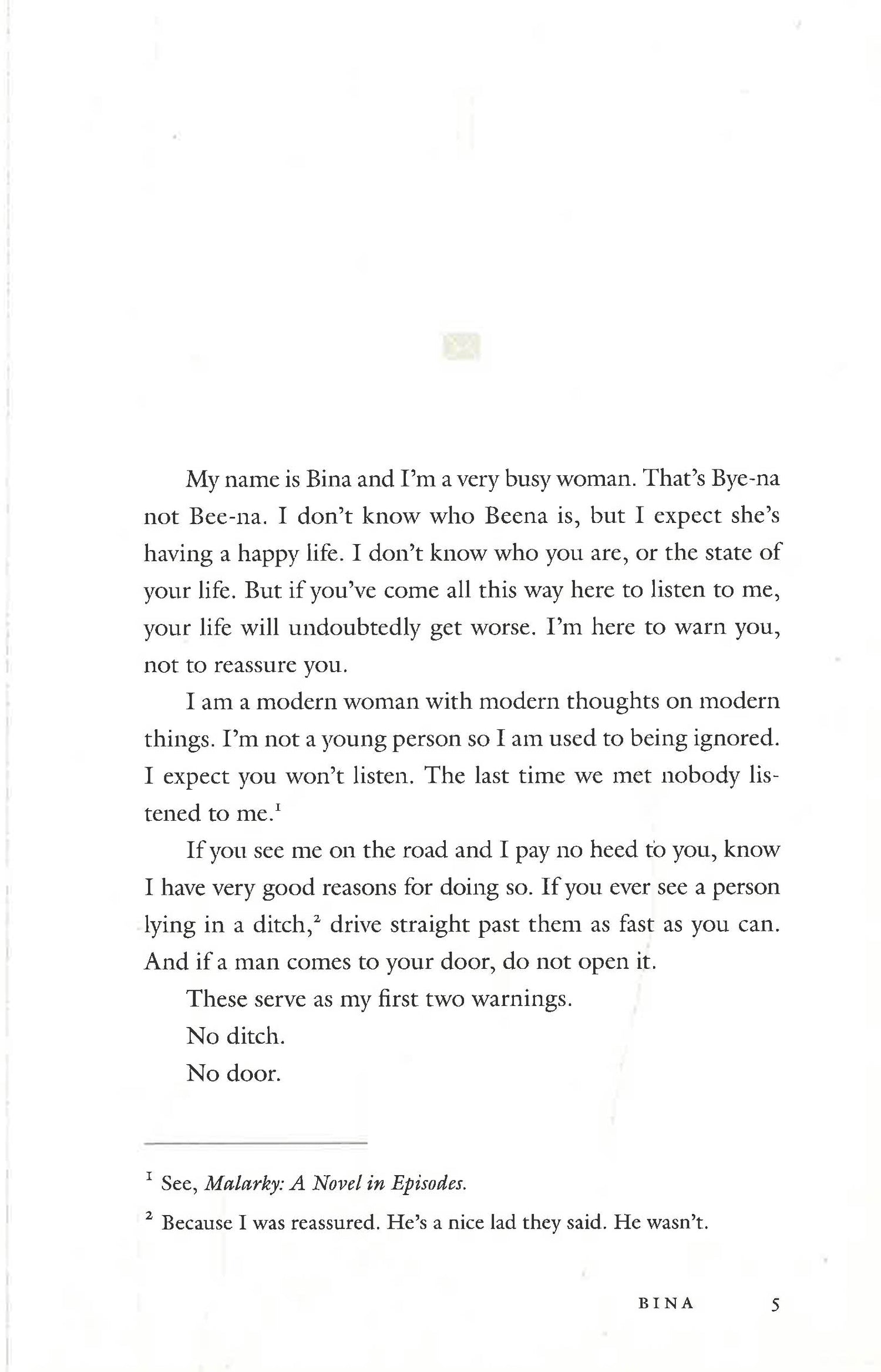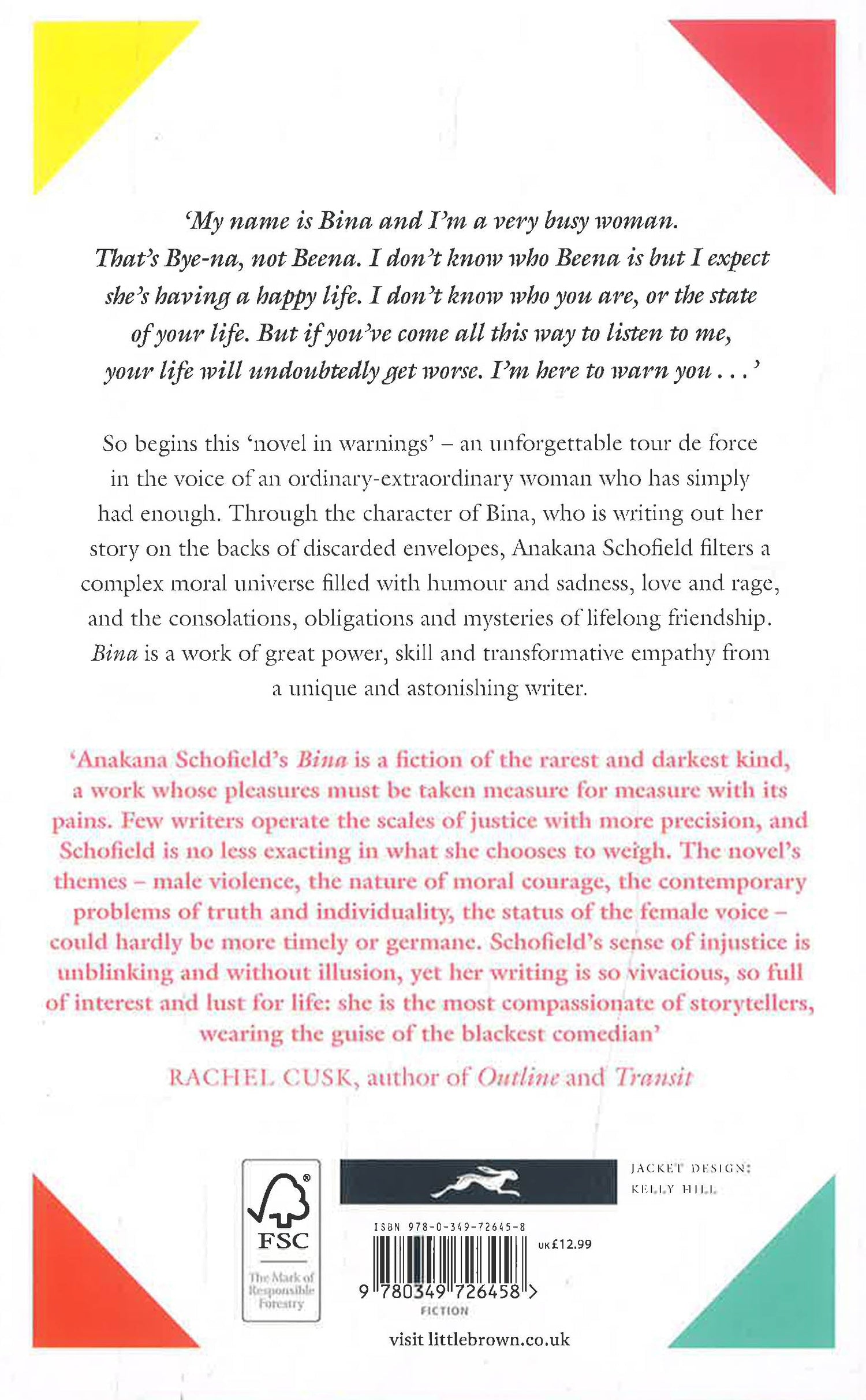 My name is Bina and I'm a very busy woman. That's Bye-na, not Beena. I don't know who Beena is but I expect she's having a happy life. I don't know who you are, or the state of your life. But if you've come all this way here to listen to me, your life will undoubtedly get worse. I'm here to warn you . . .So begins this 'novel in warnings' - an unforgettable tour de force in the voice of an ordinary-extraordinary woman who has simply had enough. Through the character of Bina, who is writing out her story on the backs of discarded envelopes, Anakana Schofield filters a complex moral universe filled with humour and sadness, love and rage, and the consolations, obligations and mysteries of lifelong friendship. A work of great power, skill, and transformative empathy from a unique and astonishing writer.