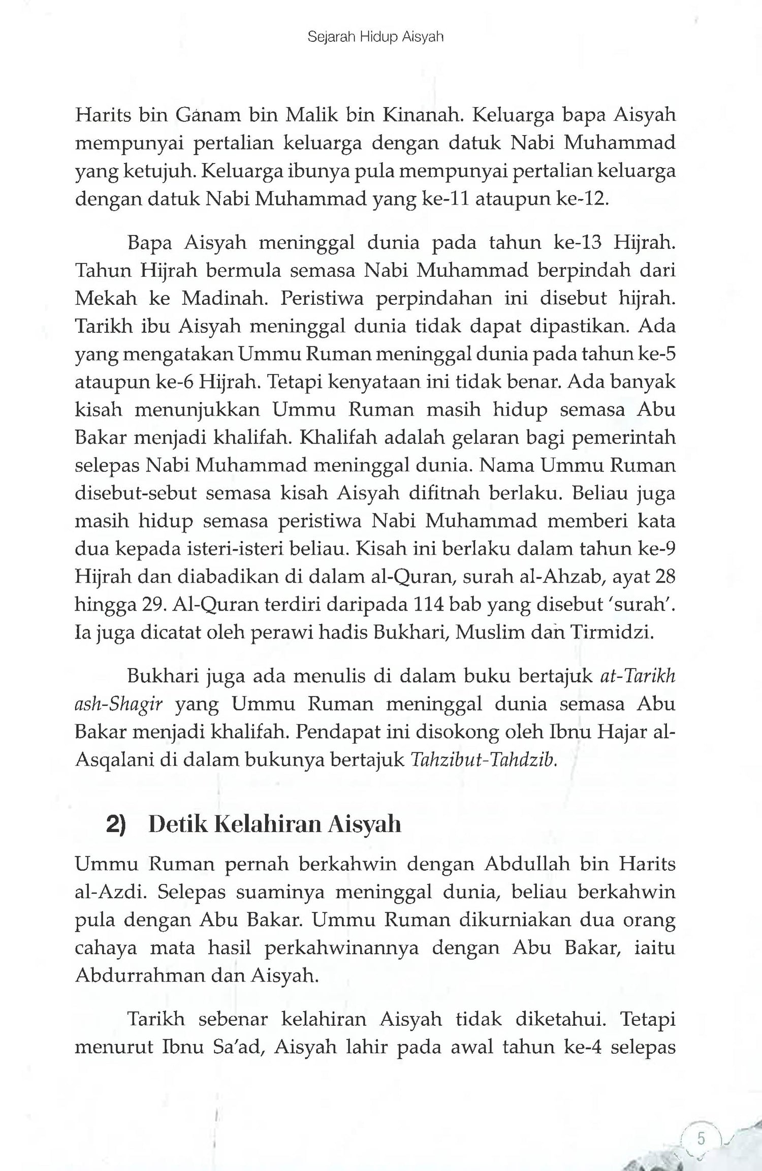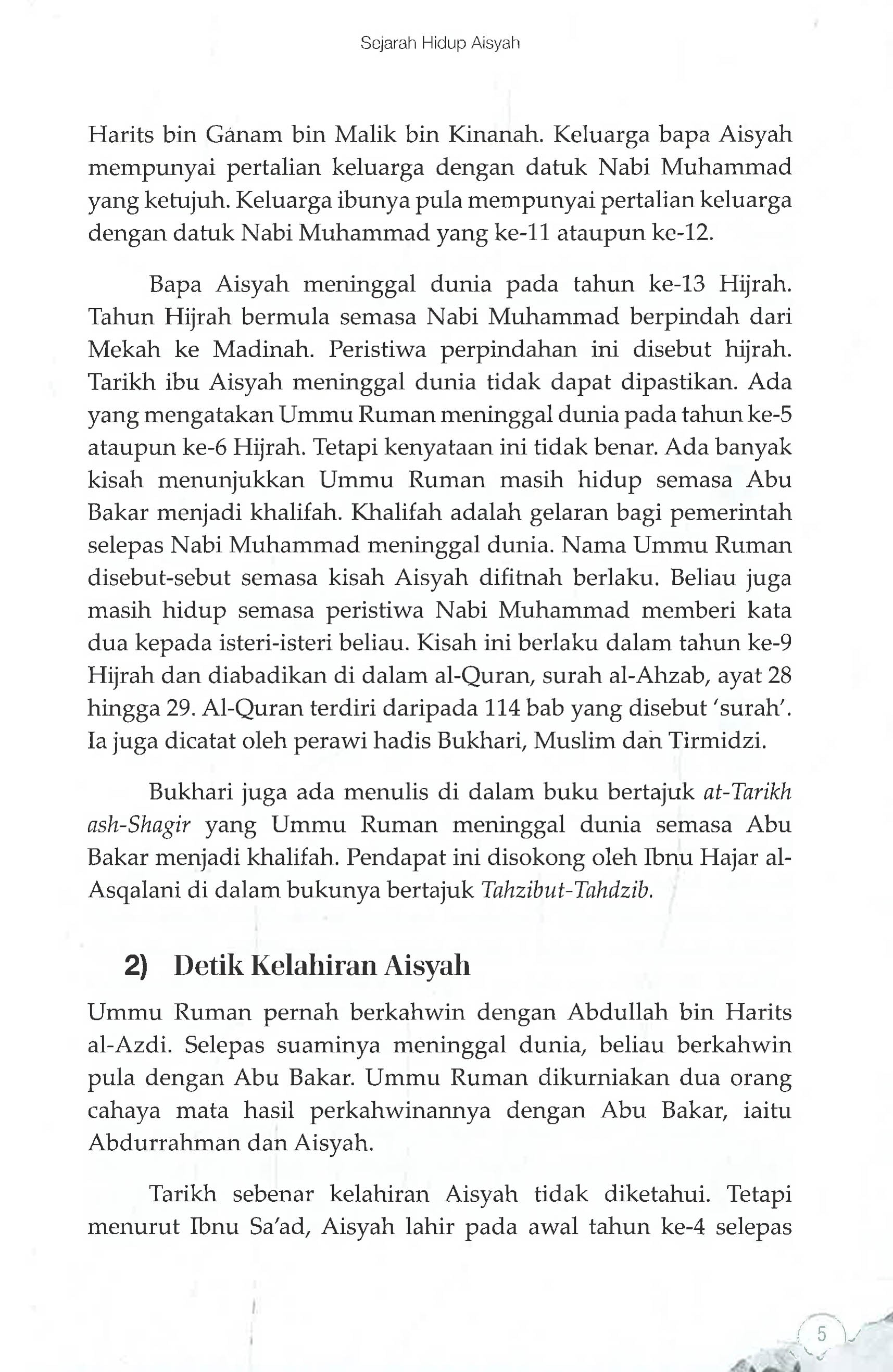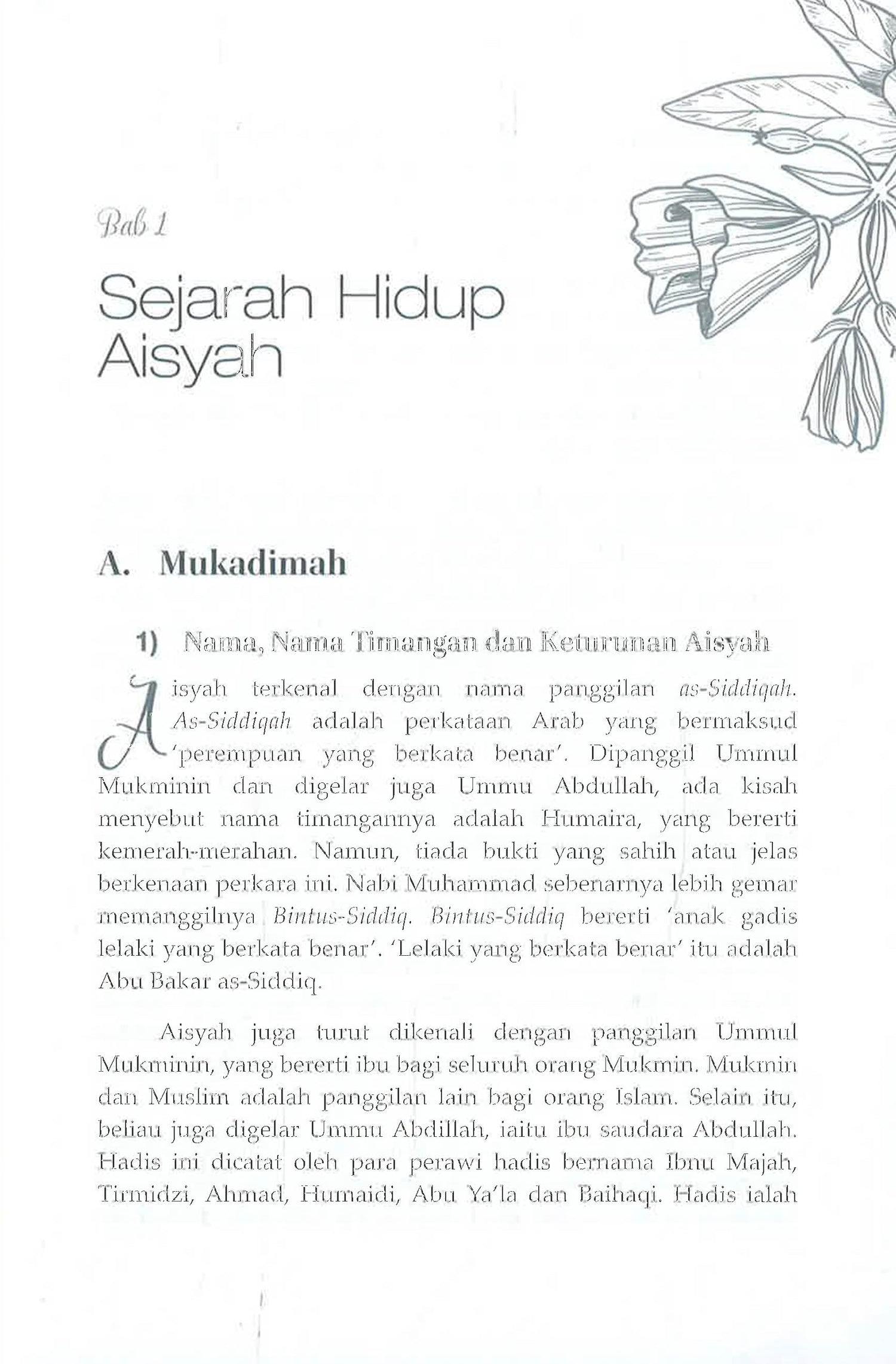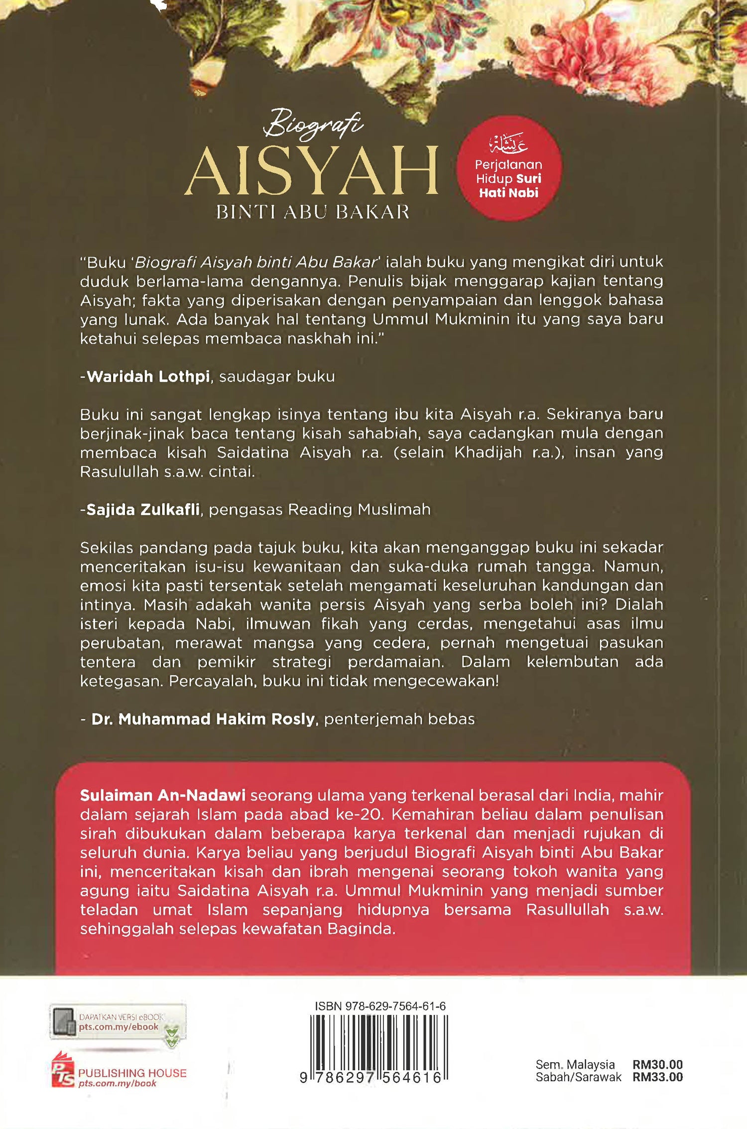 Buku Biografi Aisyah binti Abu Bakar ialah buku yang mengikat diri untuk duduk berlama-lama dengannya. Penulis bijak menggarap kajian tentang Aisyah; fakta yang diperisakan dengan penyampaian dan lenggok bahasa yang lunak. Ada banyak hal tentang Ummul Mukminin itu yang saya baru ketahui selepas membaca naskhah ini. -Waridah Lothpi, saudagar buku Buku ini sangat lengkap isinya tentang ibu kita Aisyah RA. Sekiranya baru berjinak-jinak baca tentang kisah sahabiah, saya cadangkan mula dengan membaca kisah Saidatina Aisyah RA (selain Khadijah r.a.), insan yang Rasulullah SAW cintai. -Sajida Zulkafli, pengasas Reading Muslimah Sekilas pandang pada tajuk buku, kita akan menganggap buku ini sekadar menceritakan isu-isu kewanitaan dan suka-duka rumah tangga. Namun, emosi kita pasti tersentak setelah mengamati keseluruhan kandungan dan intinya. Masih adakah wanita persis Aisyah yang serba boleh ini? Dialah isteri kepada Nabi, ilmuwan fikah yang cerdas, mengetahui asas ilmu perubatan, merawat mangsa yang cedera, pernah mengetuai pasukan tentera dan pemikir strategi perdamaian. Dalam kelembutan ada ketegasan. Percayalah, buku ini tidak mengecewakan! - Dr. Muhammad Hakim Rosly, penterjemah bebas