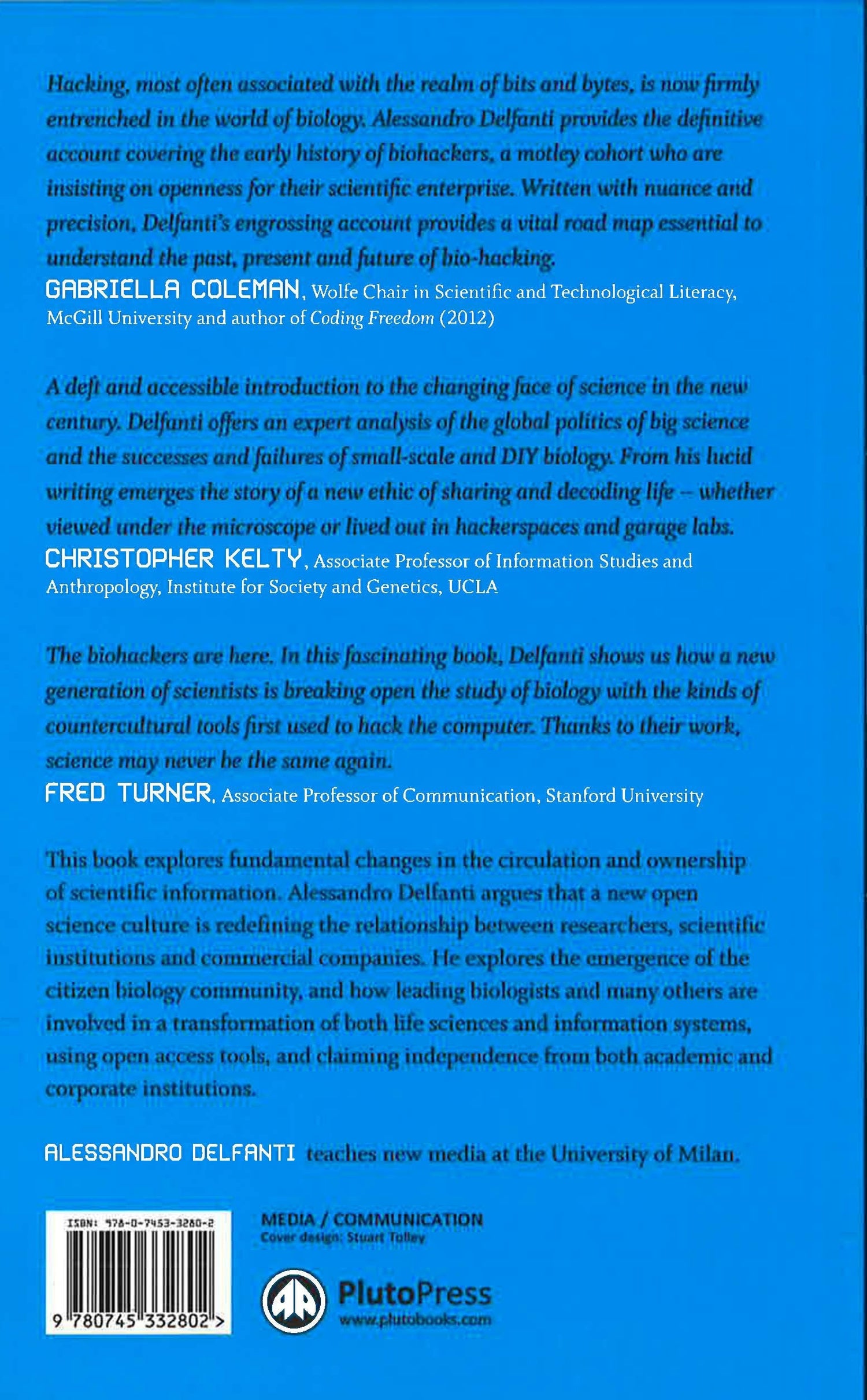 Biohackers explores fundamental changes occuring in the circulation and ownership of scientific information. Alessandro Delfanti argues that the combination of the ethos of 20th century science, the hacker movement and the free software movement is producing an open science culture which redefines the relationship between researchers, scientific institutions and commercial companies.