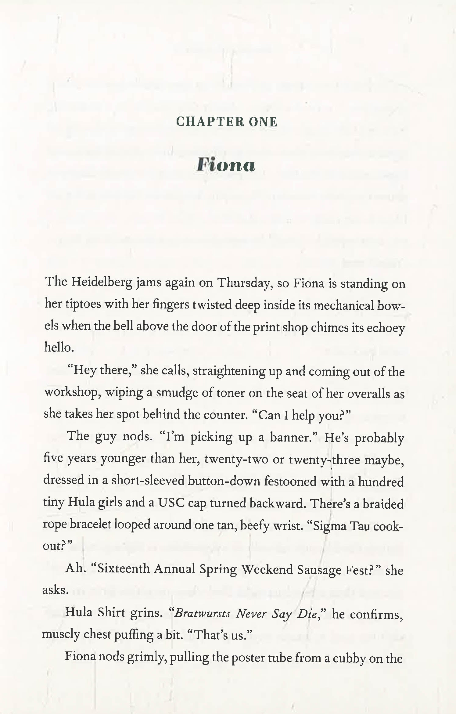 Against her better judgment, Fiona agrees to have lunch with Sam. What happens next takes them both by surprise. Sam is enthralled by Fiona’s take-no-prisoners attitude, and Fiona discovers a lovable goofball behind Sam’s close-up-ready face. Long drives to the beach, late nights at dive bars . . . theirs is the kind of kitschy romance Hollywood sells. But just like in the rom-coms Fiona despises, there’s a twist that threatens her new love. Sam doesn’t know the full story behind her breakdown. What happens when she reveals the truth?