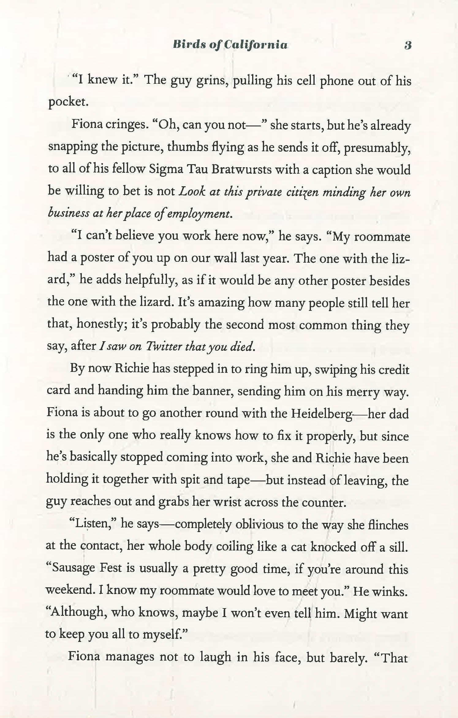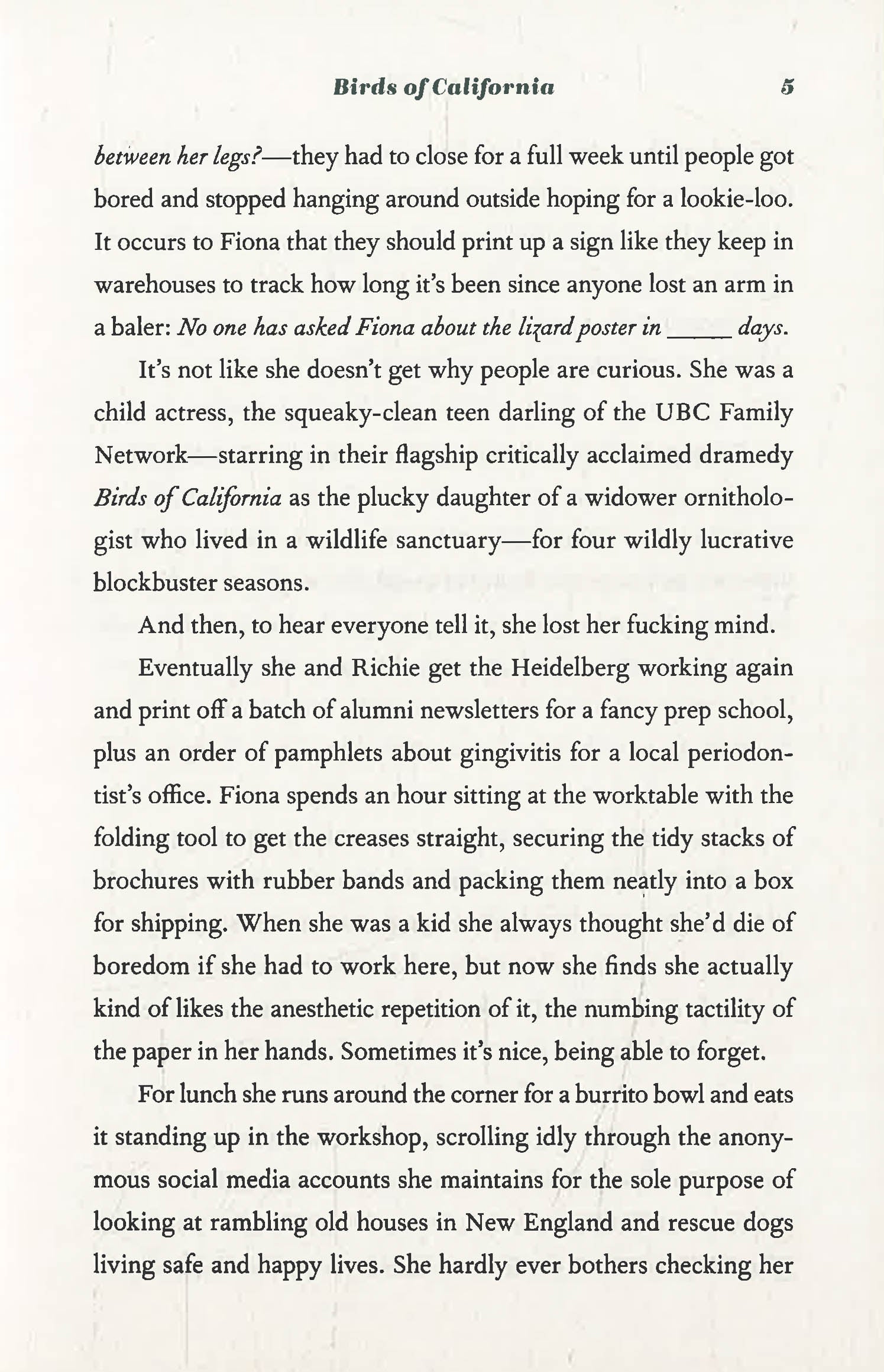 Unlike Fiona, Sam Fox, who played her older brother on the popular television show Birds of California, loves the perks that come with being a successful Hollywood actor: fame, women, parties, money. When his current show gets cancelled and his agent starts to avoid his calls, the desperate actor enthusiastically signs on for a Birds of California revival. But to make it happen, he needs Fiona St. James.