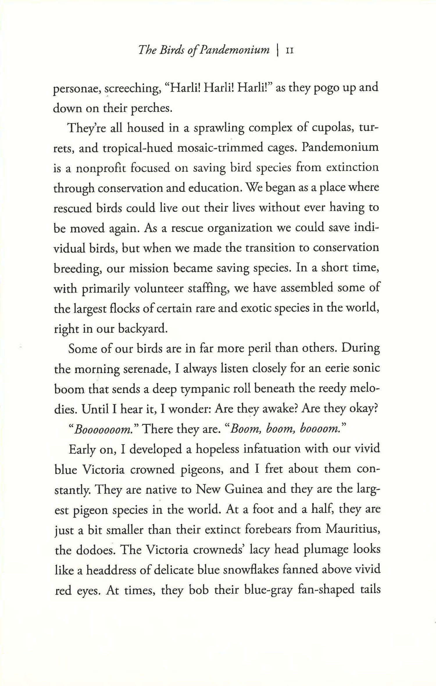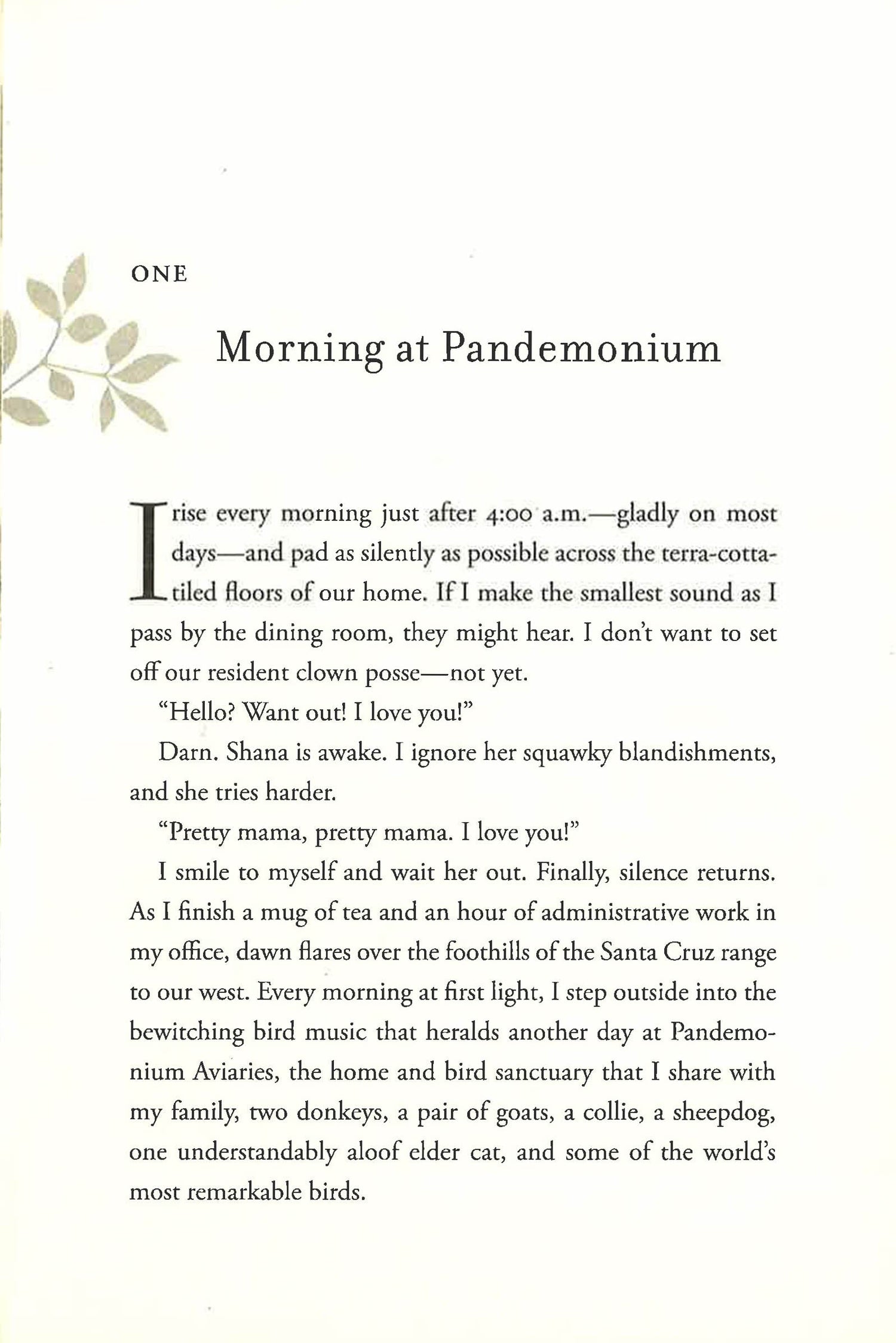 Each morning at first light, Michele Raffin steps outside into the bewitching bird music that heralds another day at Pandemonium Aviaries. A full symphony that swells from the most vocal of more than 350 avian throats representing more than 40 species. "It knocks me out, every day," she says. Pandemonium, the home and bird sanctuary that Raffin shares with some of the world's most remarkable birds, is a conservation organization dedicated to saving and breeding birds at the edge of extinction, with the goal of eventually releasing them into the wild. In The Birds of Pandemonium, she lets us into her world - and theirs. Birds fall in love, mourn, rejoice, and sacrifice; they have a sense of humor, invent, plot, and cope. They can teach us volumes about the interrelationships of humans and animals. Their amazing stories make up the heart of this book. There's Sweetie, a tiny quail with an outsize personality; the inspiring Oscar, a disabled Lady Gouldian finch who can't fly but finds a brilliant way to climb to the highest perches of his aviary to roost. The ecstatic reunion of a disabled Victoria crowned pigeon, Wing, and her brother, Coffee, is as wondrous as the silent kinship that develops between Amadeus, a one-legged turaco, and an autistic young visitor. As we come to know the individual birds, we also come to understand how much is at stake for many of these species. One of the aviary's greatest success stories is breeding the gorgeous green-naped pheasant pigeon, whose home in the New Guinea rainforest is being decimated. Thanks to efforts at Pandemonium, these birds may not share the same fate as the now-extinct dodo. The Birds of Pandemonium is about one woman's crusade to save precious lives, and it offers rare insights into how following a passion can transform not only oneself but also the world.