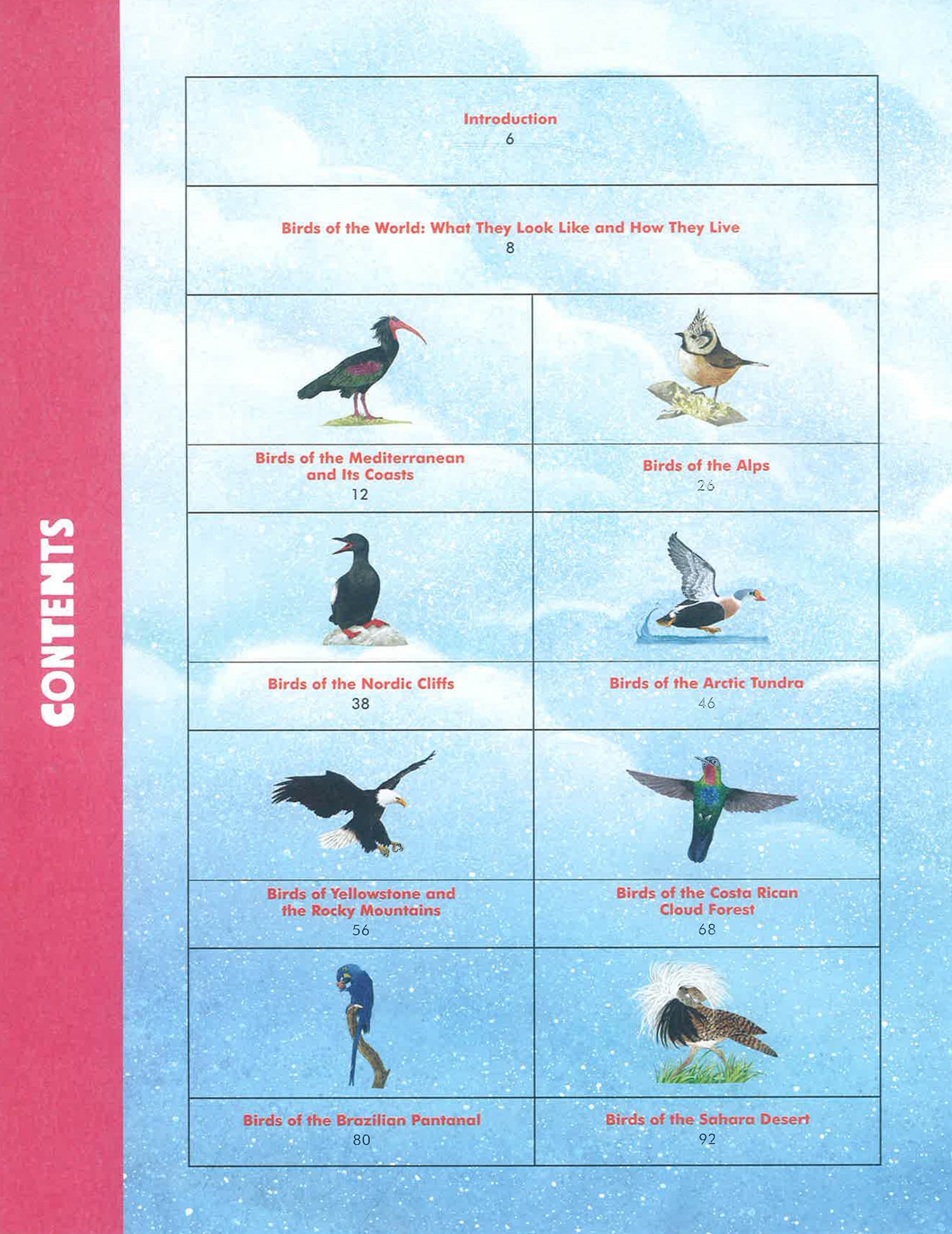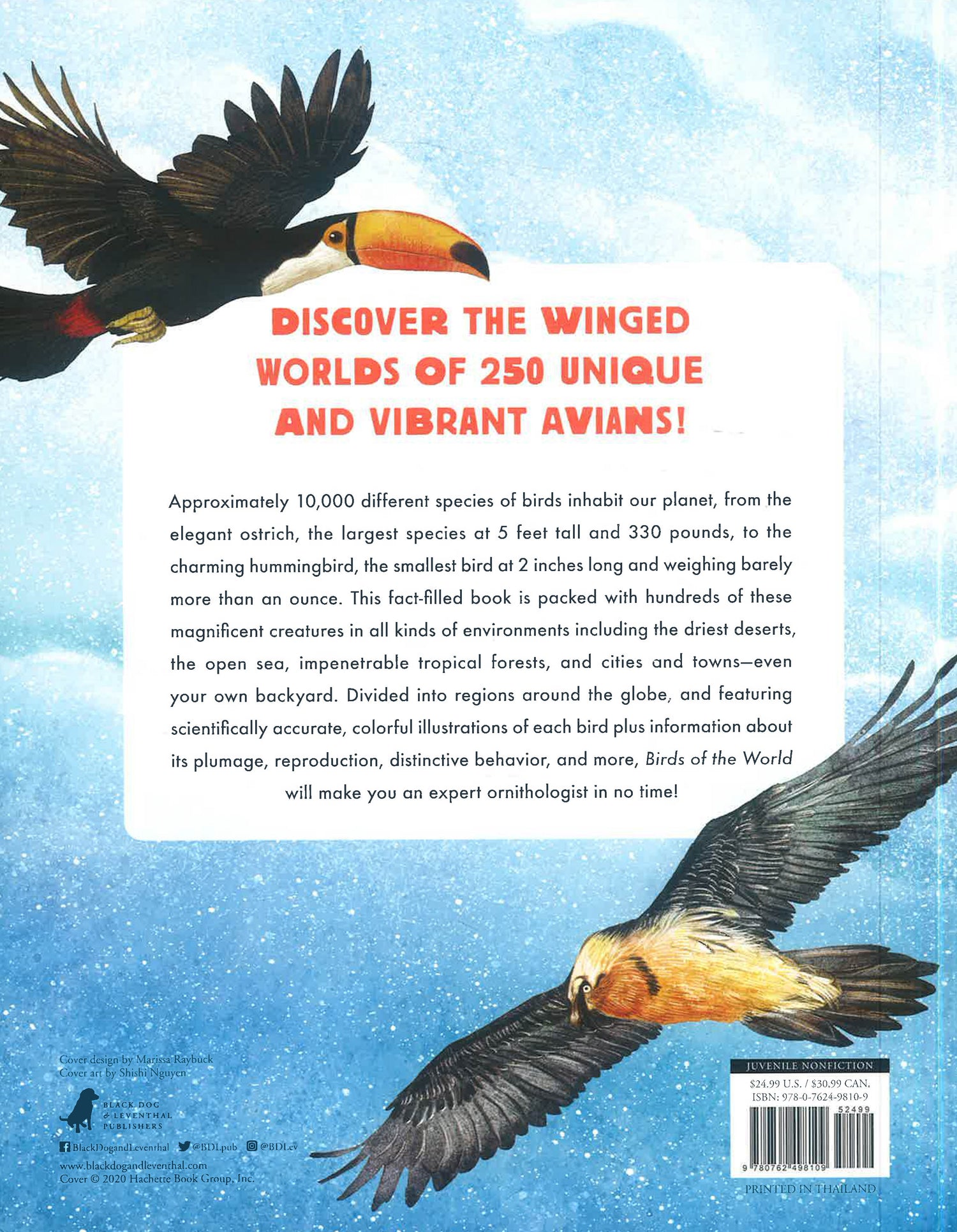 This gorgeously illustrated book showcases the winged world of some of the most vibrant and unique birds. Approximately 10,000 different species of birds inhabit our planet, and they exist in all kinds of environments, from deserts to the Antarctic, from the open sea to impenetrable tropical forests, from swamps to mountaintops, to even cities and towns. This book offers young readers examples of the stunning variety of birds that live in our world -- from the largest ostrich at 5-feet tall and 330 pounds, to the smallest hummingbird at 2 inches long and weighing barely an ounce. Divided into chapters denoting geographical areas, Birds of the World features magnificent and detailed illustrations of each bird discussed. At the same time, captions summarize the most important aspects that make up a bird's life, such as environment, food, reproduction, and distinctive behavior. Kids will also learn about the varying colors of plumage, impressive courtship and mating displays, extraordinary flight skills, and more.