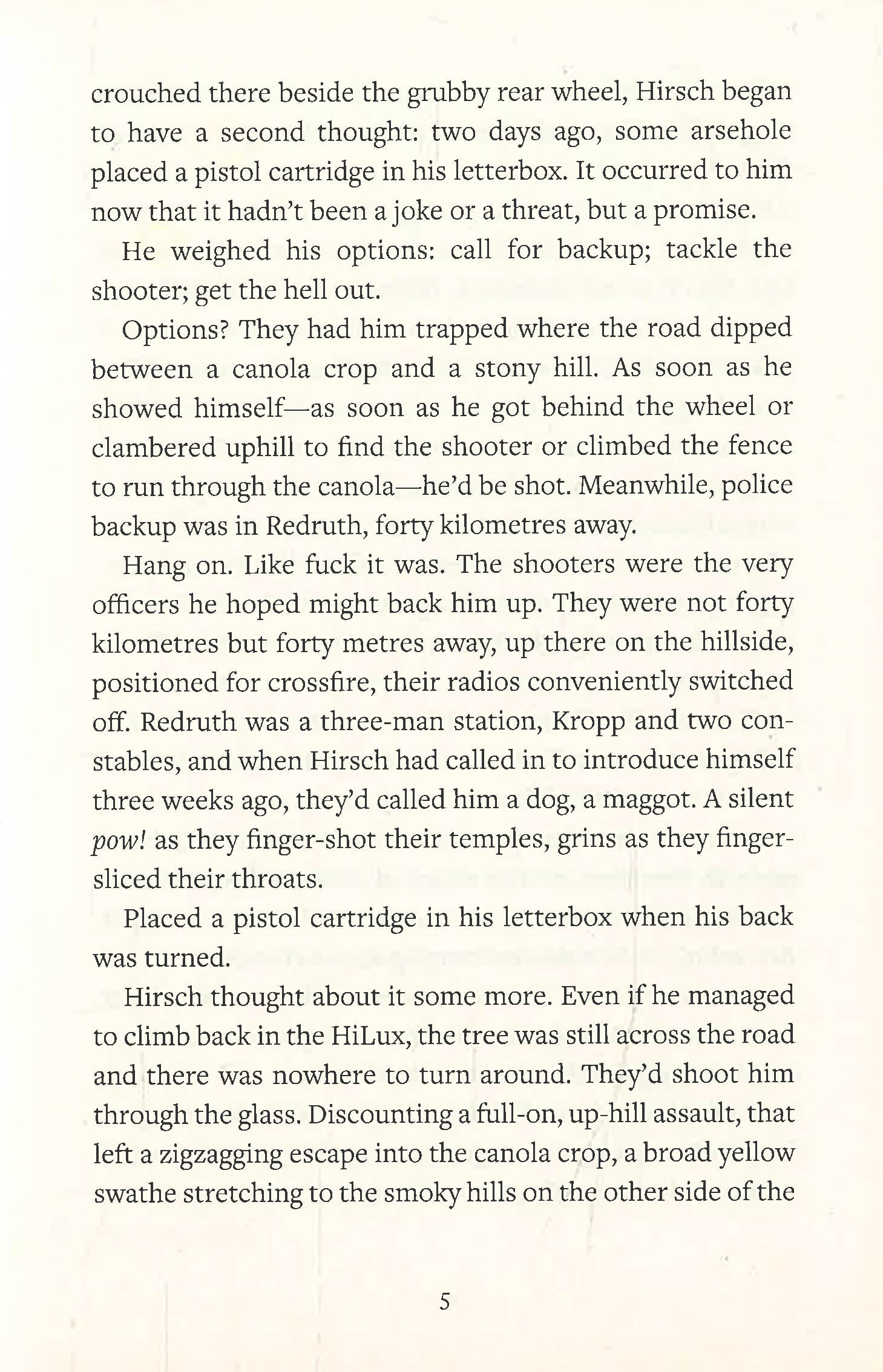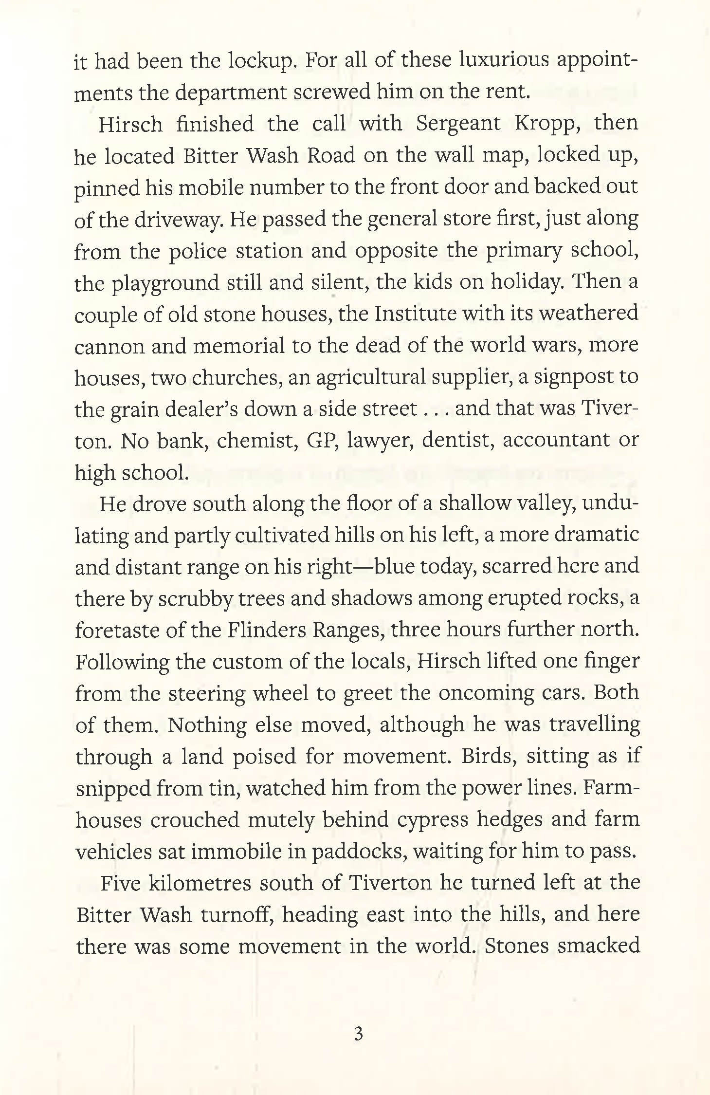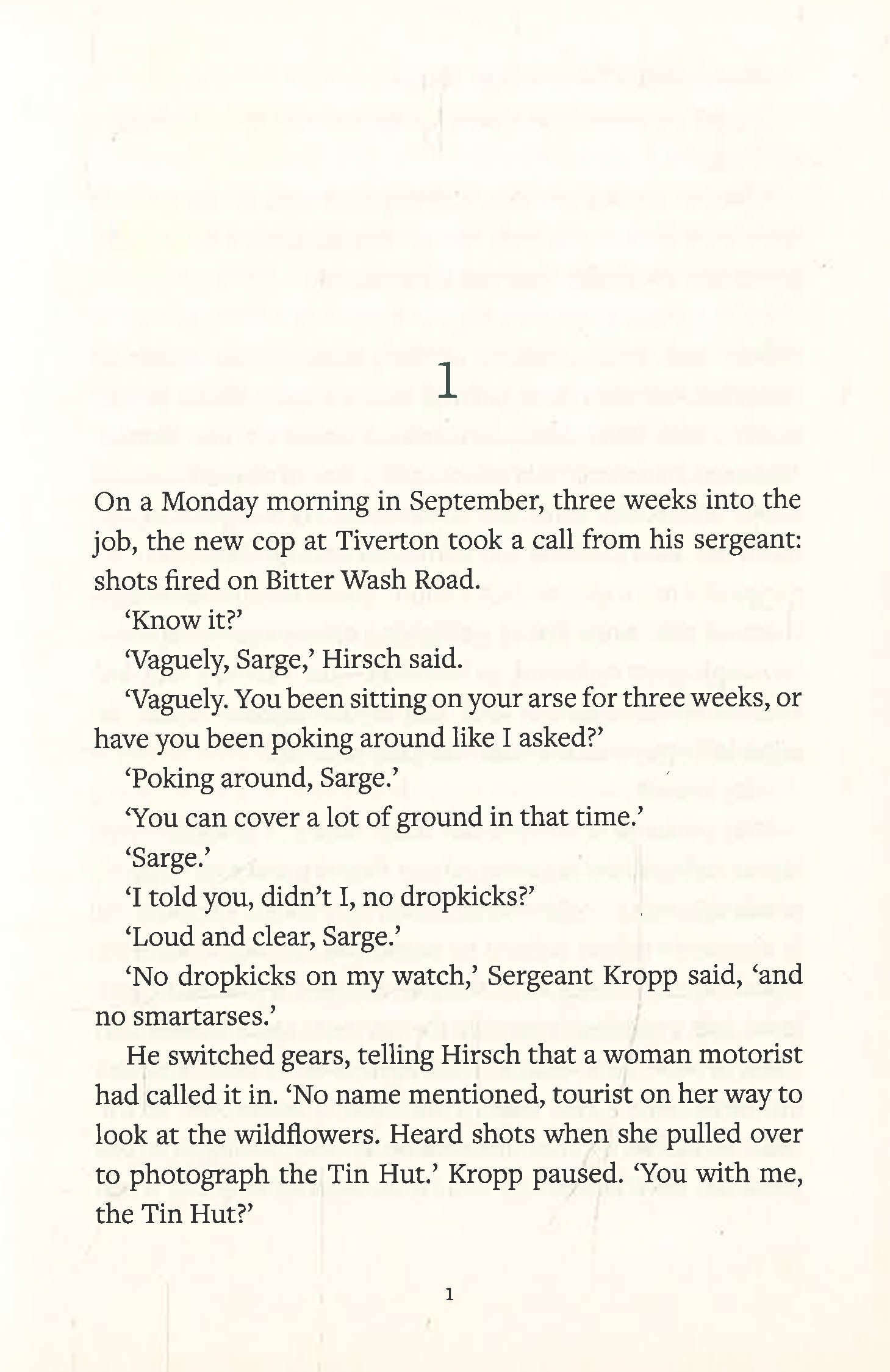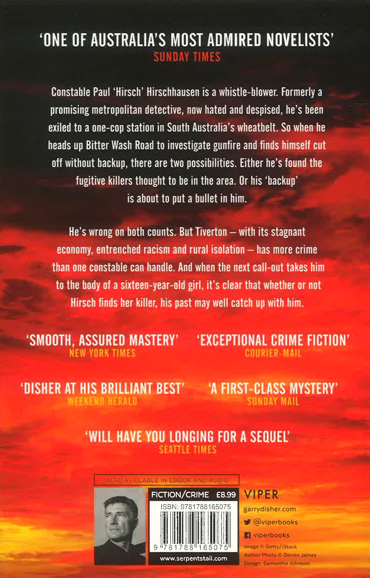 Hirschhausen is a whistle-blower. Formerly a promising metropolitan detective, now hated and despised, he's been exiled to a one-cop station in South Australia's wheatbelt. So when he heads up Bitter Wash Road to investigate gunfire and finds himself cut off without backup, there are two possibilities. Either he's found the fugitive killers thought to be in the area. Or his 'backup' is about to put a bullet in him. He's wrong on both counts. But Tiverton - with its stagnant economy, entrenched racism and rural isolation - has more crime than one constable can handle. And when the next call-out takes him to the body of a sixteen-year-old girl, it's clear that whether or not Hirsch finds her killer, his past may well catch up with him