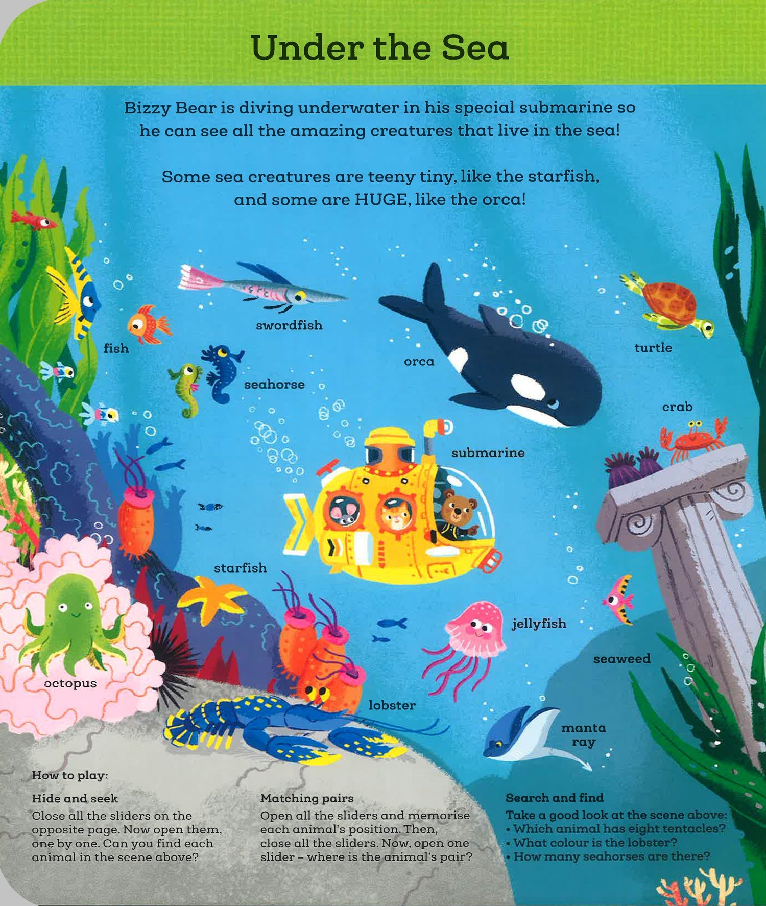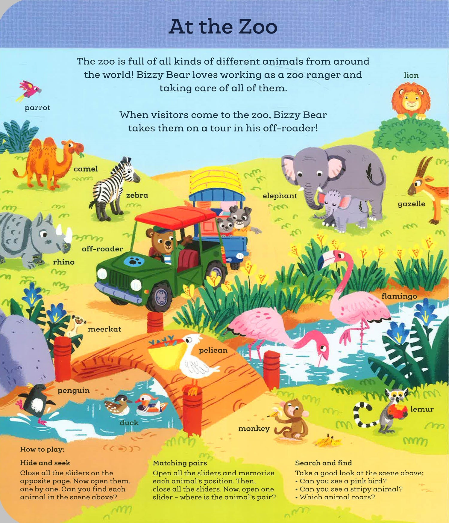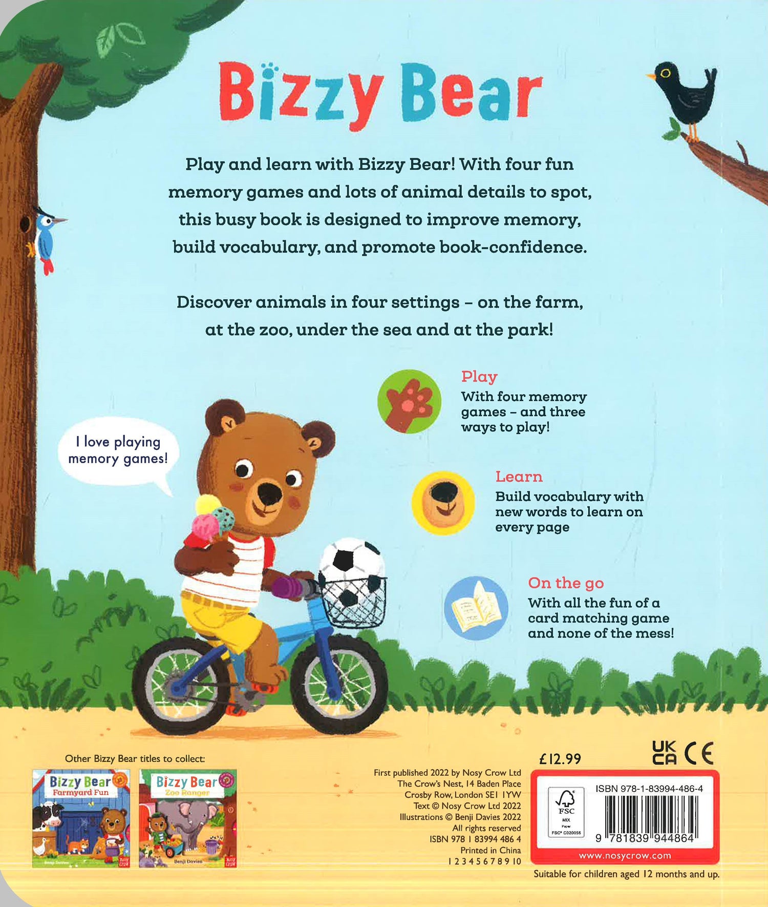 Play and learn with Bizzy Bear! With four fun scenes, three memory games and lots of animal details to spot, this busy book is designed to improve memory, build vocabulary, and promote book-confidence. And with no messy cards to tidy up afterwards, parents will love it too! Discover animals in four settings - on the farm, at the zoo, under the sea and at the park! Collect the other books in the Bizzy Bear series; other title available include: Bizzy Bear: Zoo Ranger, Bizzy Bear: Fire Rescue, Bizzy Bear: Racing Car and lots, lots more!