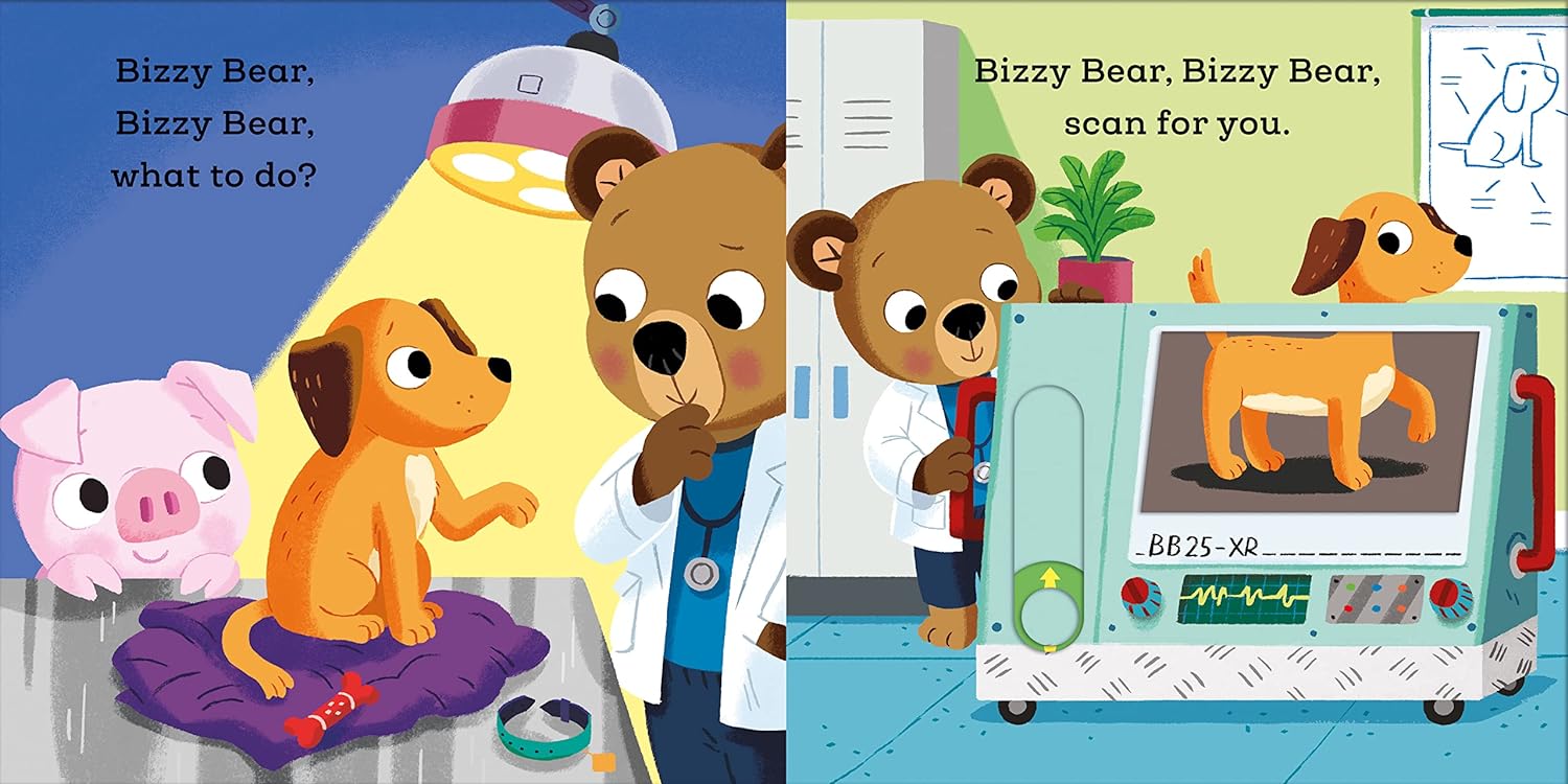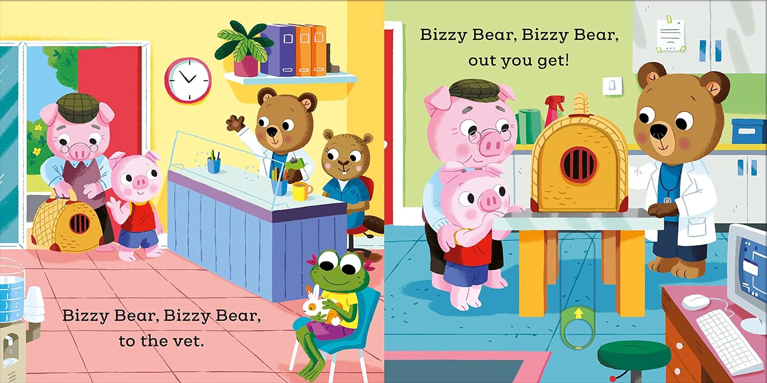 Five easy-to-use sliders, a rhyming story and lots to spot and say in this series of bright, interactive board books for toddlers!Join Bizzy Bear as he looks after the animals at the vet's clinic!