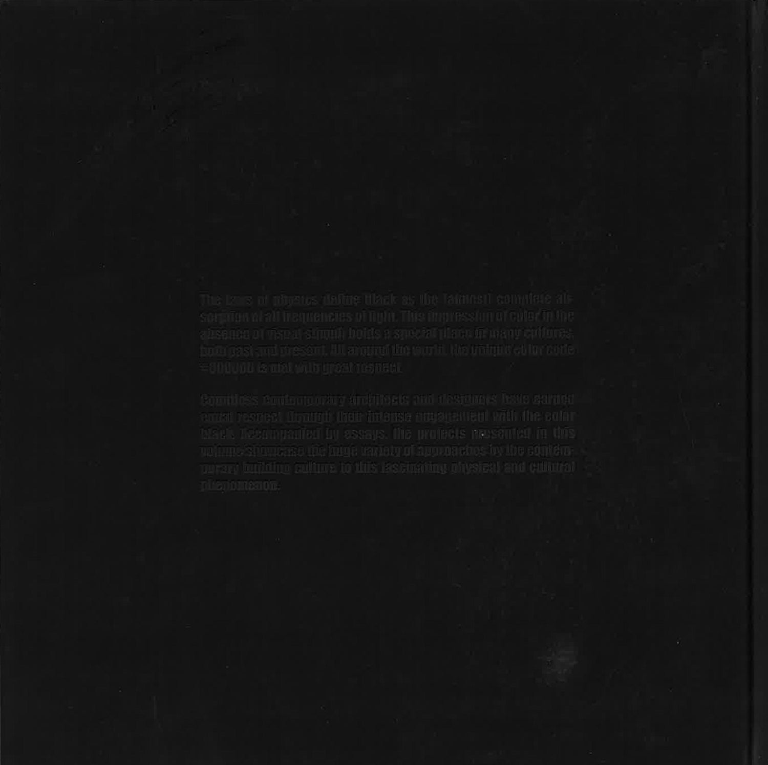 Physically, black is defined as an (almost) complete absorption of all frequencies of light; it describes the impression of color when visual stimuli are missing. In many cultural contexts of the past and present, this "uncolored" color holds a special place: regardless of context, black is always met with great respect. This is also true for the current and intense interaction of architects and designers with this color. Black buildings seem majestic, filled with a special aura, and dominant, but they can also emphasize their surroundings precisely because of their lack of color. The projects presented in this volume show the great variety of approaches by the contemporary building culture to this fascinating physical and cultural phenomenon.
