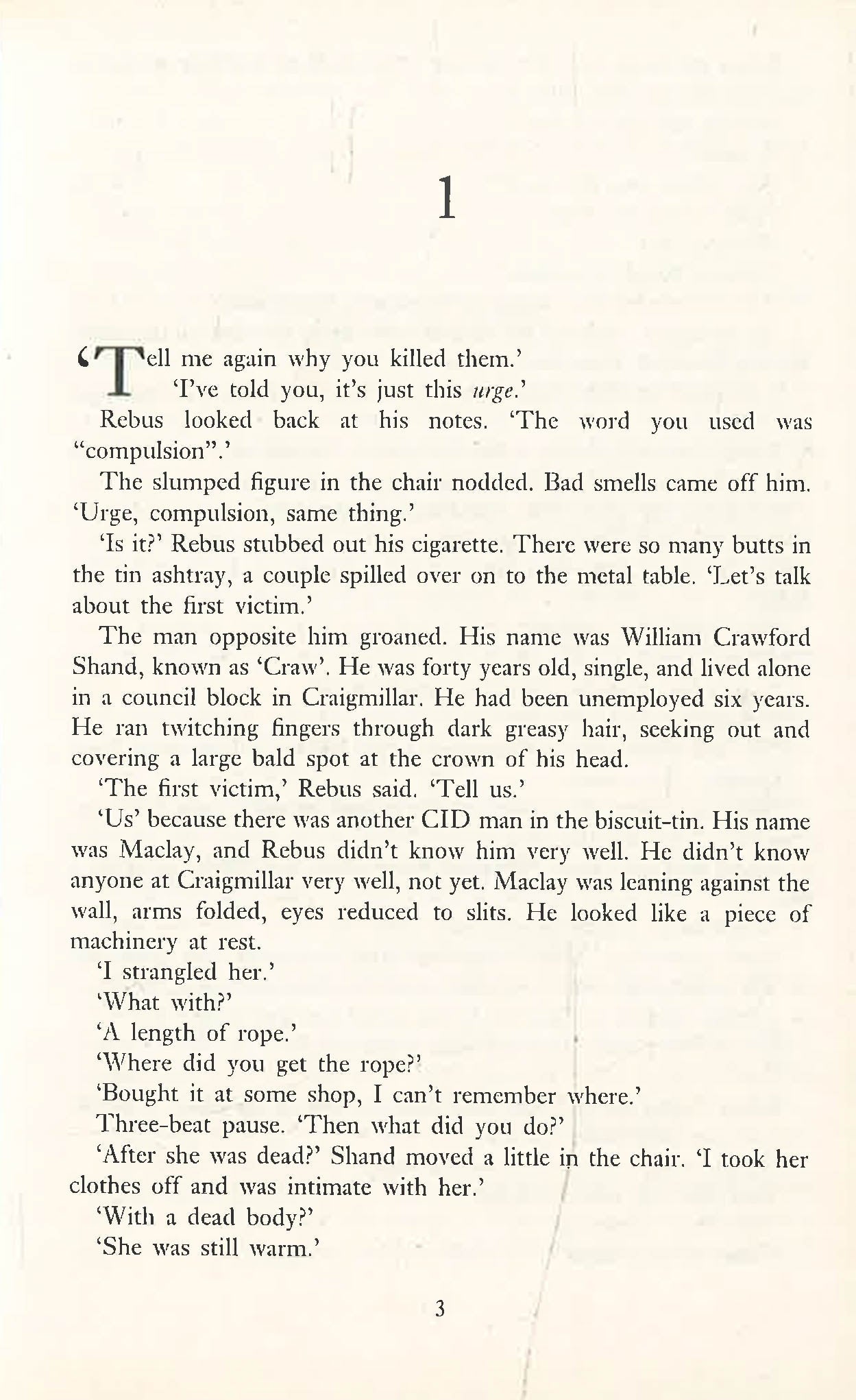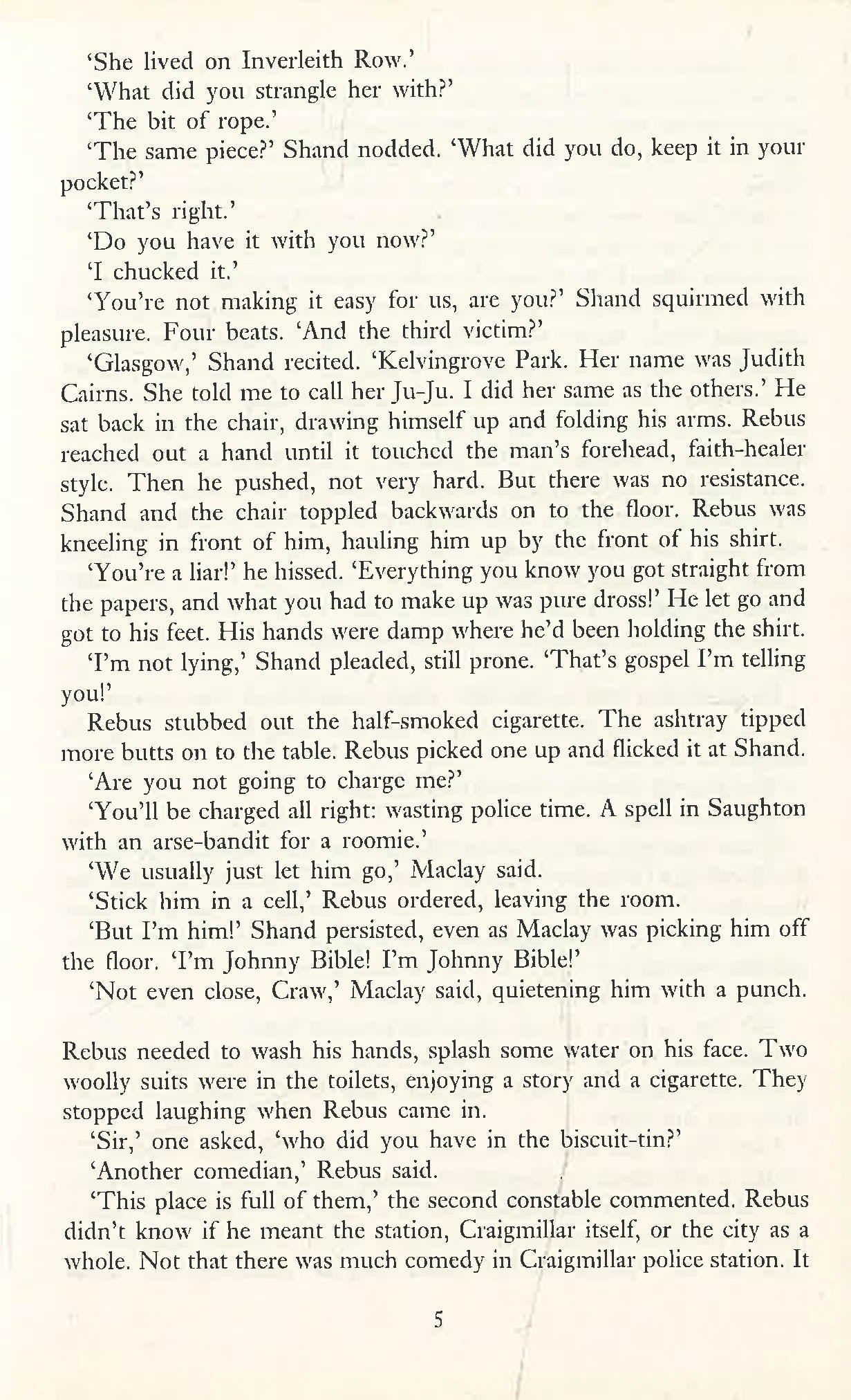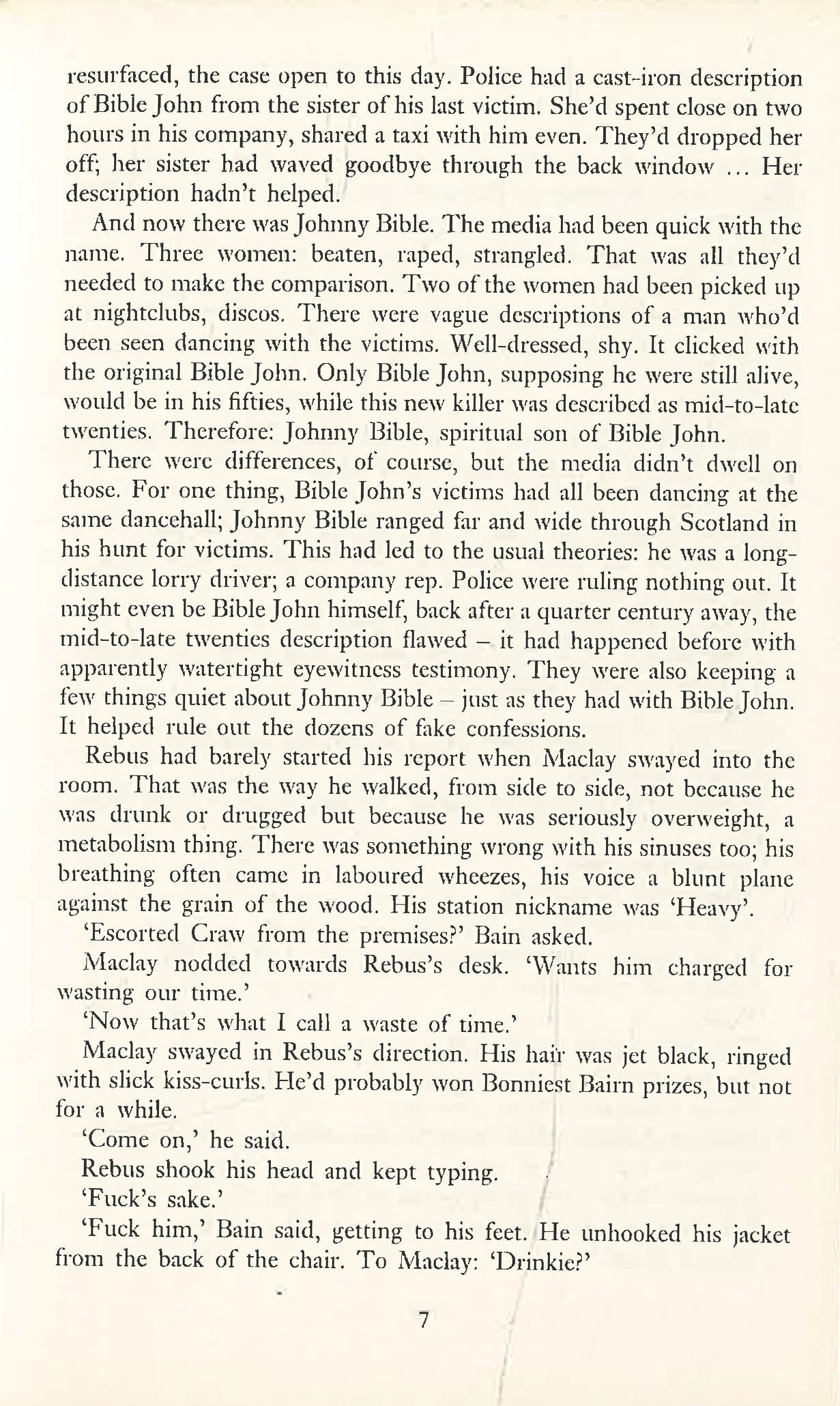 The Bible Johnny case would be perfect for Inspector John Rebus, but after a run-in with a crooked senior officer, he's been shunted aside to one of Edinburgh's toughest suburbs, where he investigates the murder of an off-duty oilman. His investigation takes him north to the oil rigs of Aberdeen, where he meets the Bible Johnny media circus head-on. Suddenly caught in the glare of the television cameras and in the middle of more than one investigation, Rebus must proceed with caution: One mistake could mean an unpleasant and not particularly speedy death, or, worse still, losing his job
