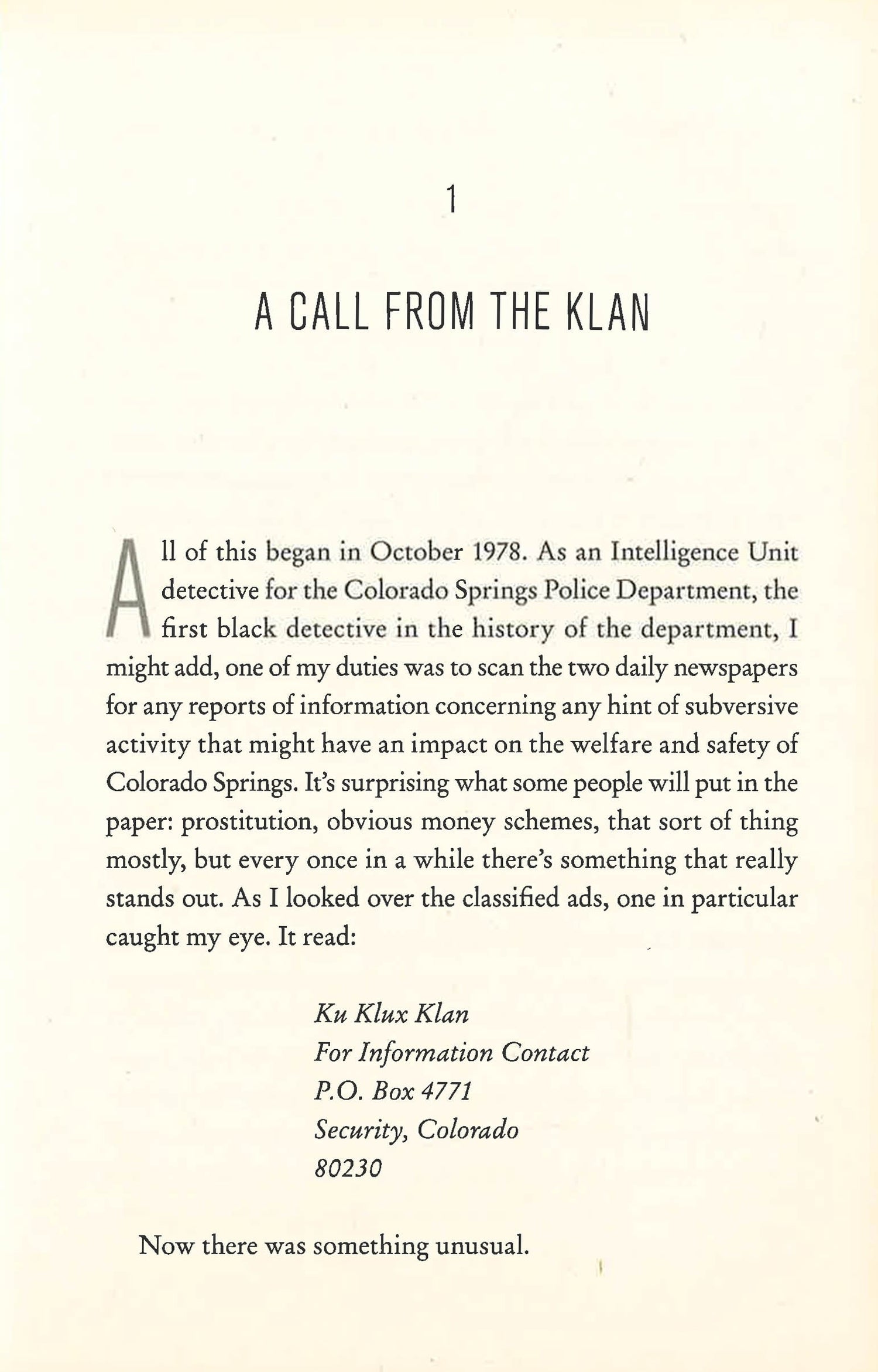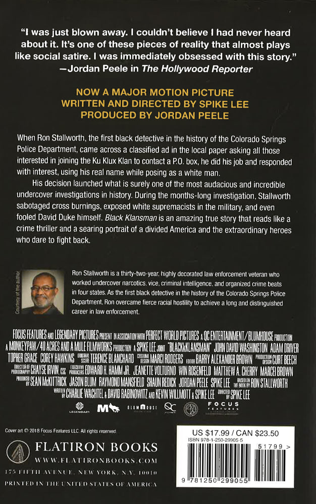 When detective Ron Stallworth, the first black detective in the history of the Colorado Springs Police Department, comes across a classified ad in the local paper asking for all those interested in joining the Ku Klux Klan to contact a P.O. box, Detective Stallworth does his job and responds with interest, using his real name while posing as a white man. He figures he?ll receive a few brochures in the mail, maybe even a magazine, and learn more about a growing terrorist threat in his community.A few weeks later the office phone rings, and the caller asks Ron a question he thought he?d never have to answer, ?Would you like to join our cause?? This is 1978, and the KKK is on the rise in the United States. Its Grand Wizard, David Duke, has made a name for himself, appearing on talk shows, and major magazine interviews preaching a ?kinder? Klan that wants nothing more than to preserve a heritage, and to restore a nation to its former glory.Ron answers the caller?s question that night with a yes, launching what is surely one of the most audacious, and incredible undercover investigations in history. Ron recruits his partner Chuck to play the "white" Ron Stallworth, while Stallworth himself conducts all subsequent phone conversations. During the months-long investigation, Stallworth sabotages cross burnings, exposes white supremacists in the military, and even befriends David Duke himself.Black Klansman is an amazing true story that reads like a crime thriller, and a searing portrait of a divided America and the extraordinary heroes who dare to fight back.
